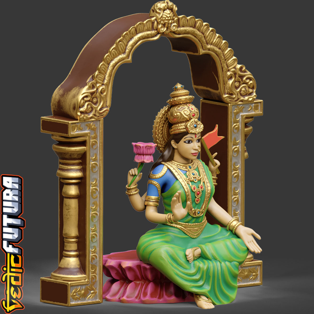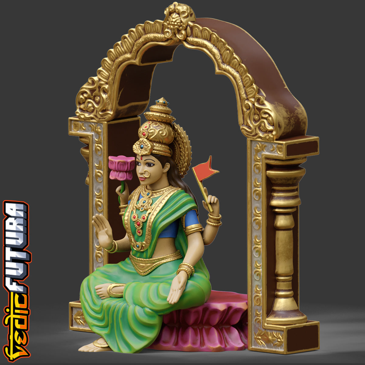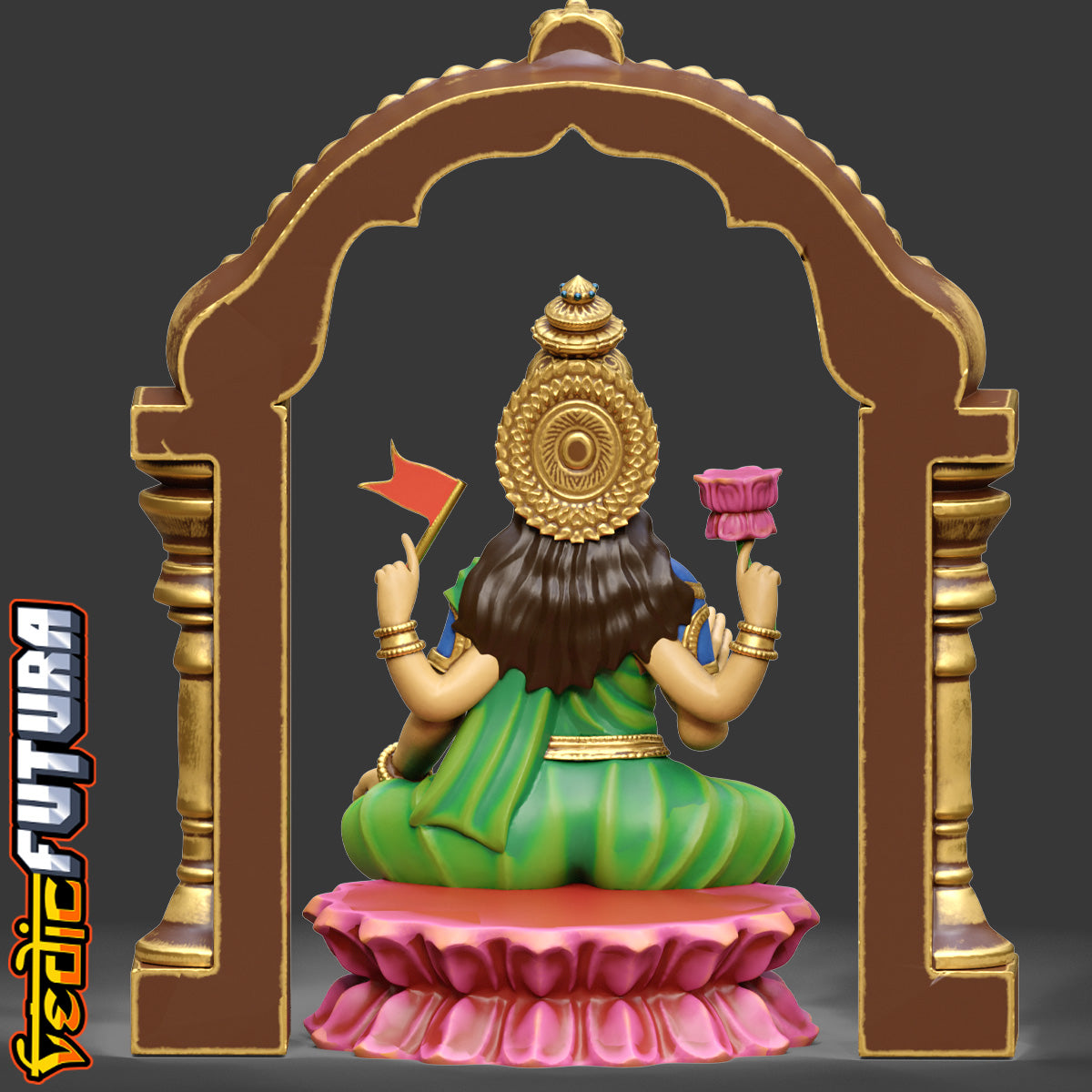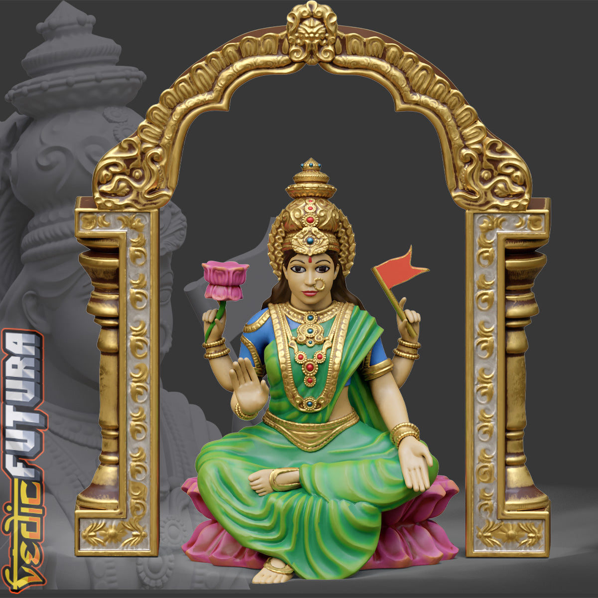 Seated on a pink lotus, Adi Lakshmi is adorned in green garments and golden jewelry. Her four arms hold symbolic attributes: the Abhaya mudra for protection, the Varada mudra for blessings, a lotus representing purity and steadfastness in dharma, and a red flag signifying surrender to divine will. This form reflects her role in guiding devotees toward life’s ultimate goal—moksha."