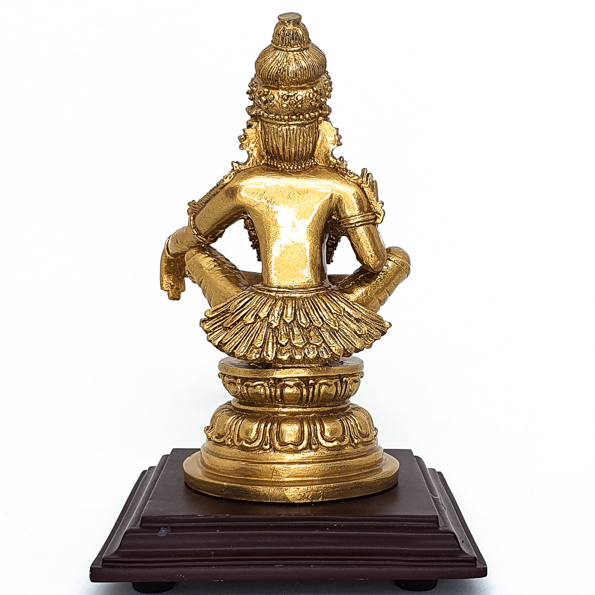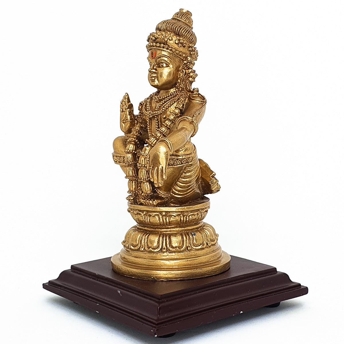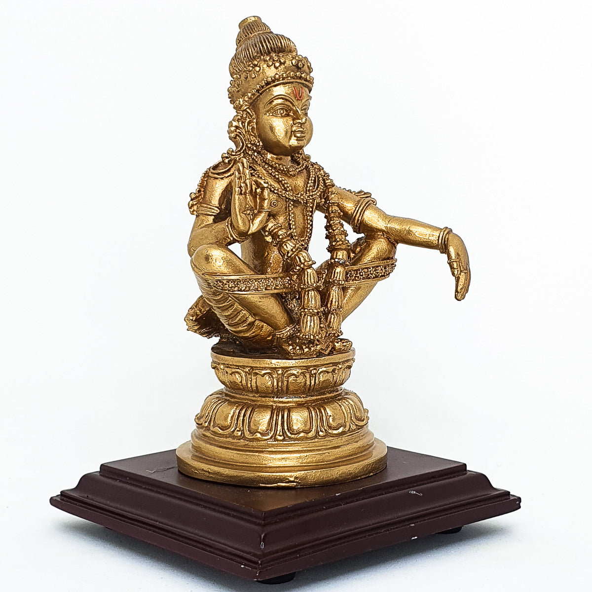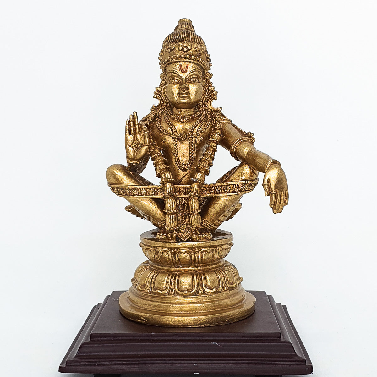 His hands show two mudras, chinmudra (aka jnyanamudra) and abhayamudra. Chinmudra indicate that Ayyappa has attained union with the universal consciousness while abhayamudra is a gesture of reassurance and safety.