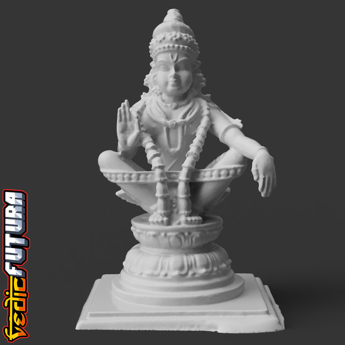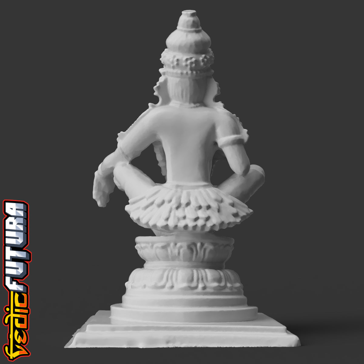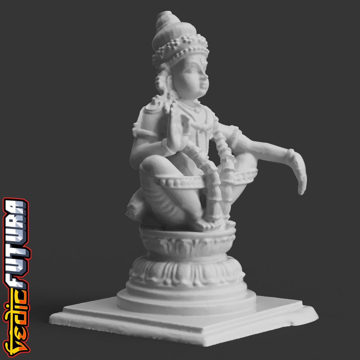 The iconography of Ayyappan depicts him as a young handsome celibate (Brahmachari) sitting in a yogic posture, as an epitome of Dharma, who wears a bell around his neck.
