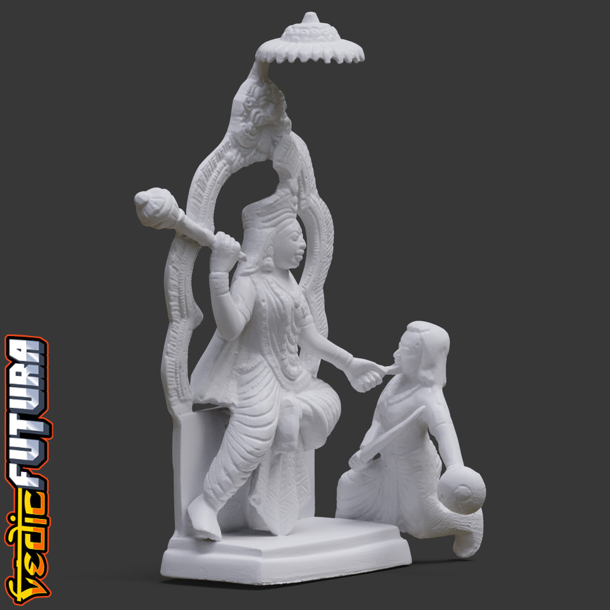 This sculpture depicts Goddess Bagalamukhi, one of the ten Mahavidyas in the Tantric tradition, in her characteristic pose of subjugation. She is shown gripping the tongue of a demon while wielding a gada (club) in the other hand, symbolizing her power to immobilize speech, thought, and action.