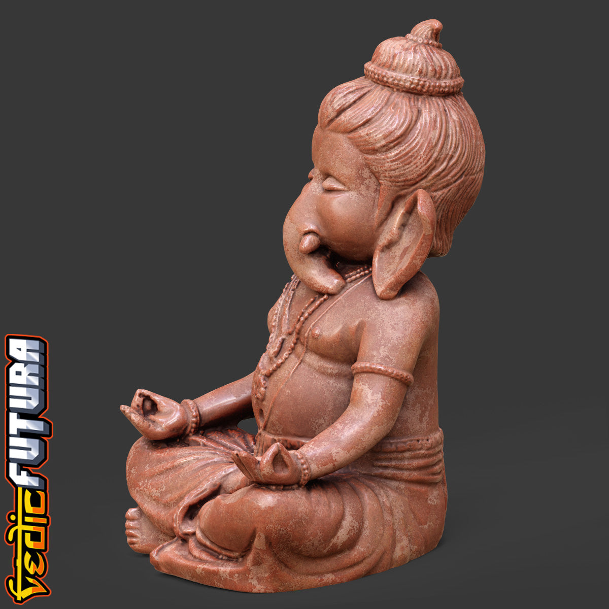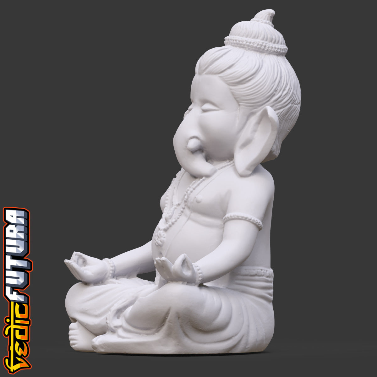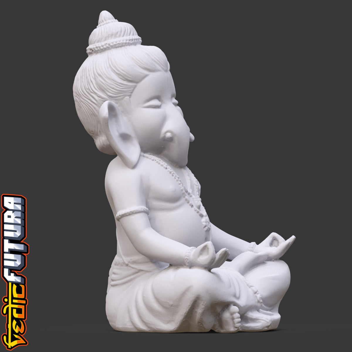 This unique depiction presents Lord Ganesha as a youthful boy seated in deep meditation, with eyes gently closed and legs crossed in a classic yogic posture. His serene black form is accented with golden ornaments and a vibrant saffron dhoti, invoking both simplicity and spiritual intensity.