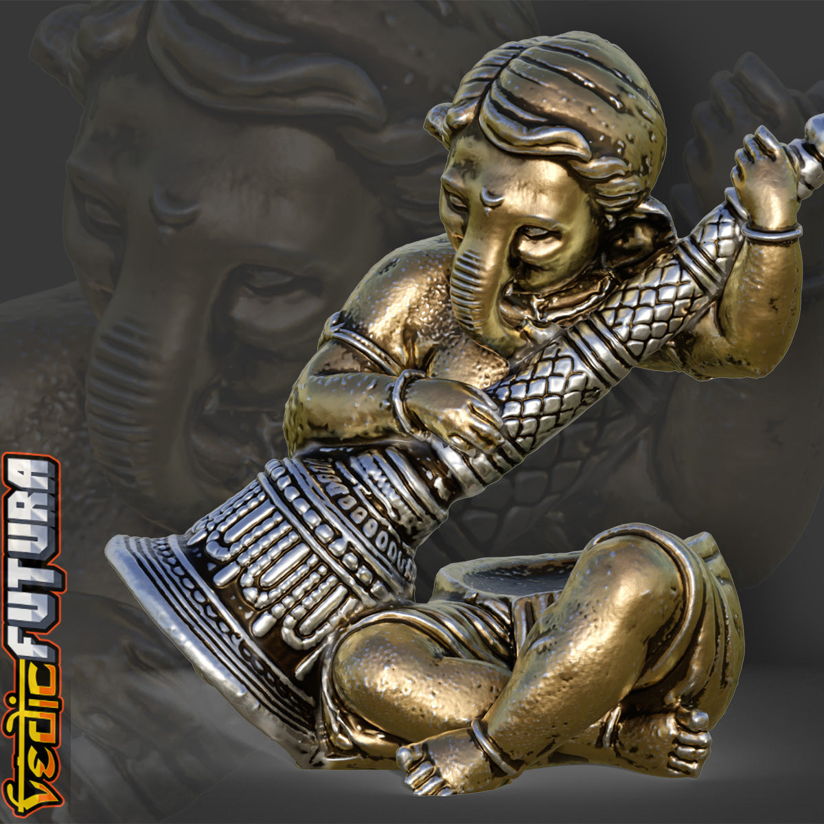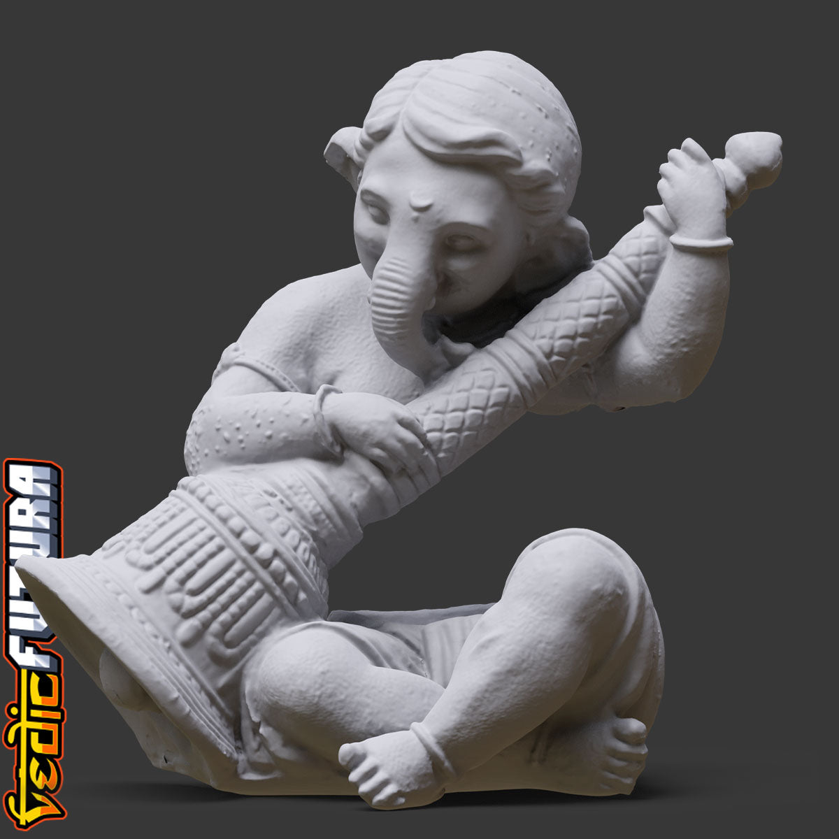 This playful and imaginative sculpture depicts Ganesha as a young child, affectionately clinging to an oversized bell. In a unique artistic twist, the statue omits his characteristic pot belly, leaving a hollow space at the center. This absence becomes its own visual statement—inviting interpretations of infinity, lightness, or spiritual emptiness.