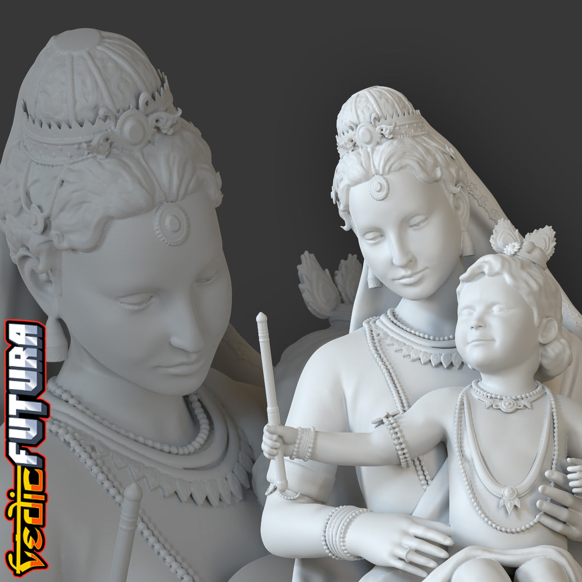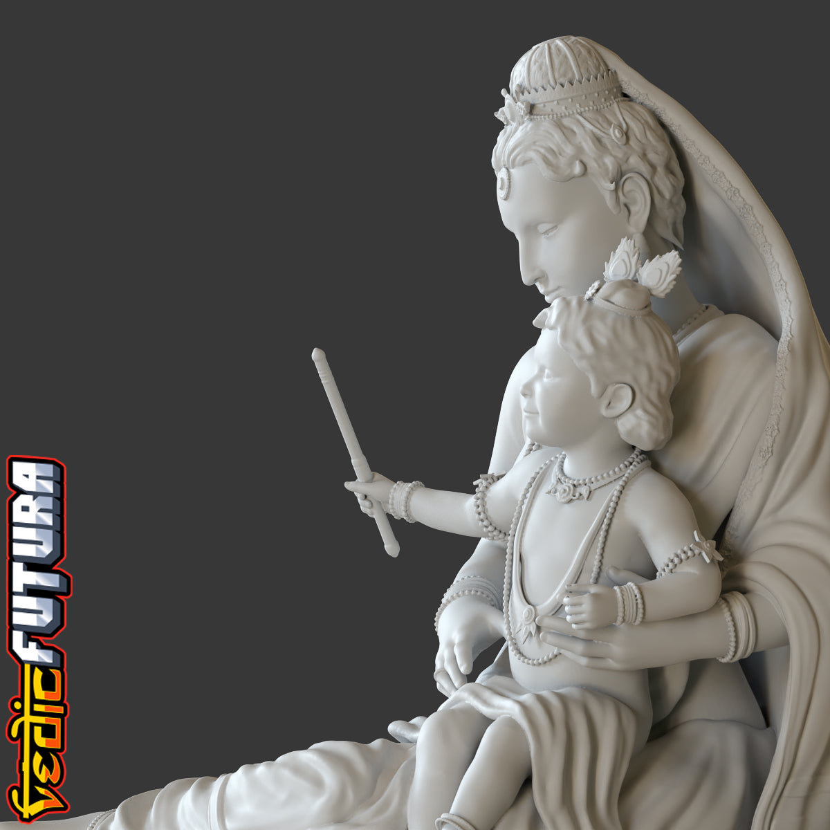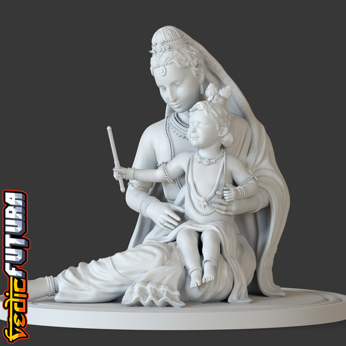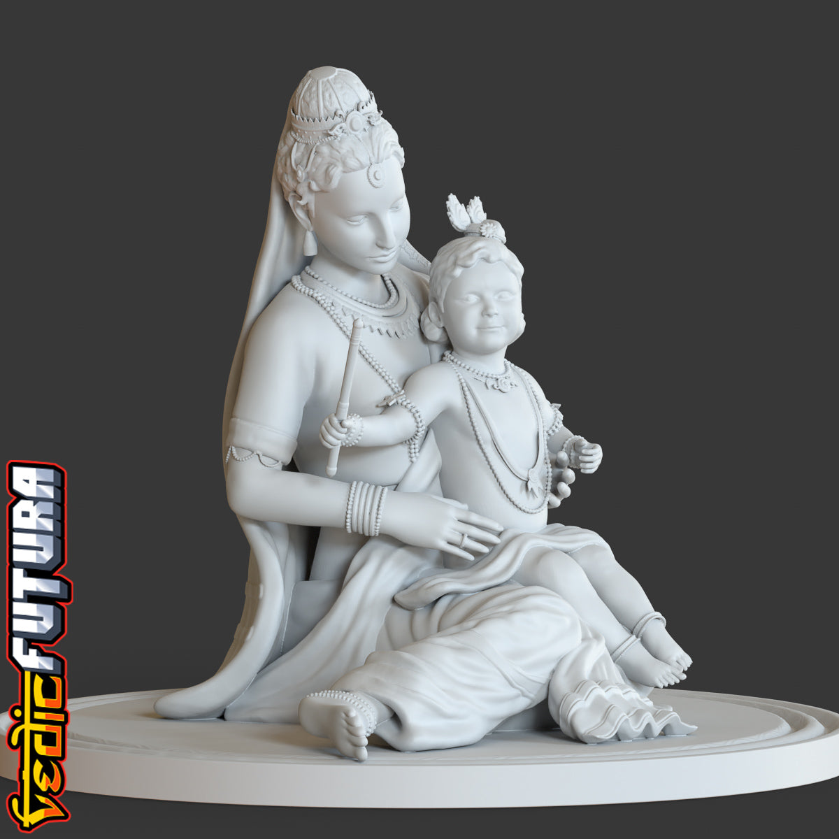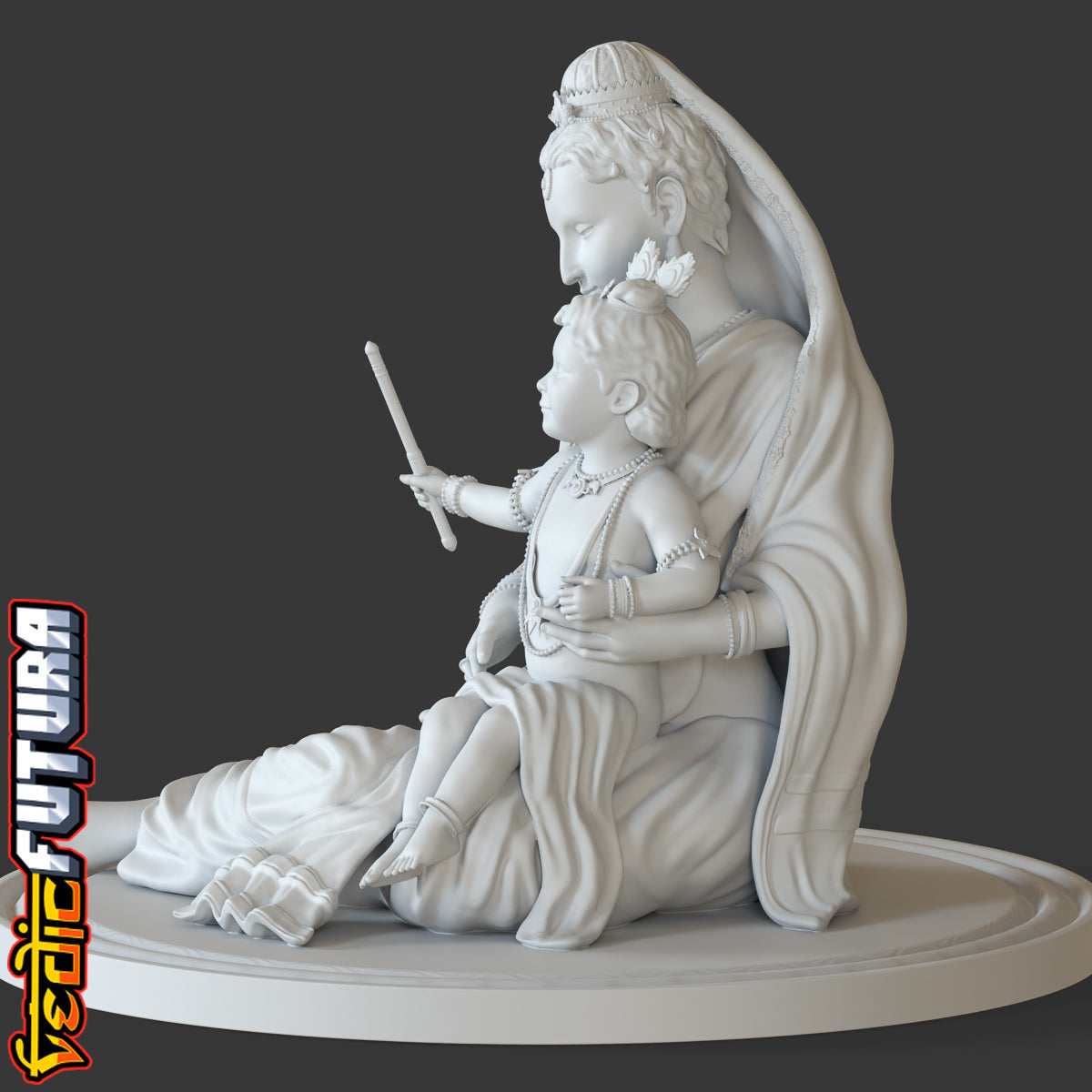 This sculpt is based on the the classic painting of Lord Krishna as a young boy being held by his mother. It is a beautiful and serene representation of the Hindu god. The painting captures the tender and loving relationship between Lord Krishna and his mother, who is often depicted as the embodiment of love and devotion.Lord Krishna is depicted as a young boy, with an innocent and serene expression on his face. He is shown playing his flute, which is a symbol of his divine and mesmerizing nature. The flute is also associated with the god's love and devotion as it is said that the flute's music represents the devotion and love of God for his devotees.