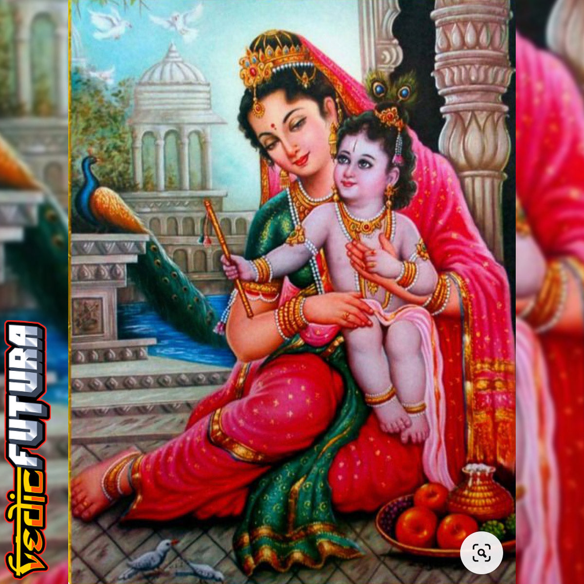 His mother is holding him in a loving embrace, with a look of pure love and devotion on her face. The painting captures the essence of the mother-son bond, and the love and devotion that Lord Krishna's mother has for him. The painting also showcases the purity and serenity of Lord Krishna's childhood, a time when he was free from the responsibilities and duties that he would later assume as a god.