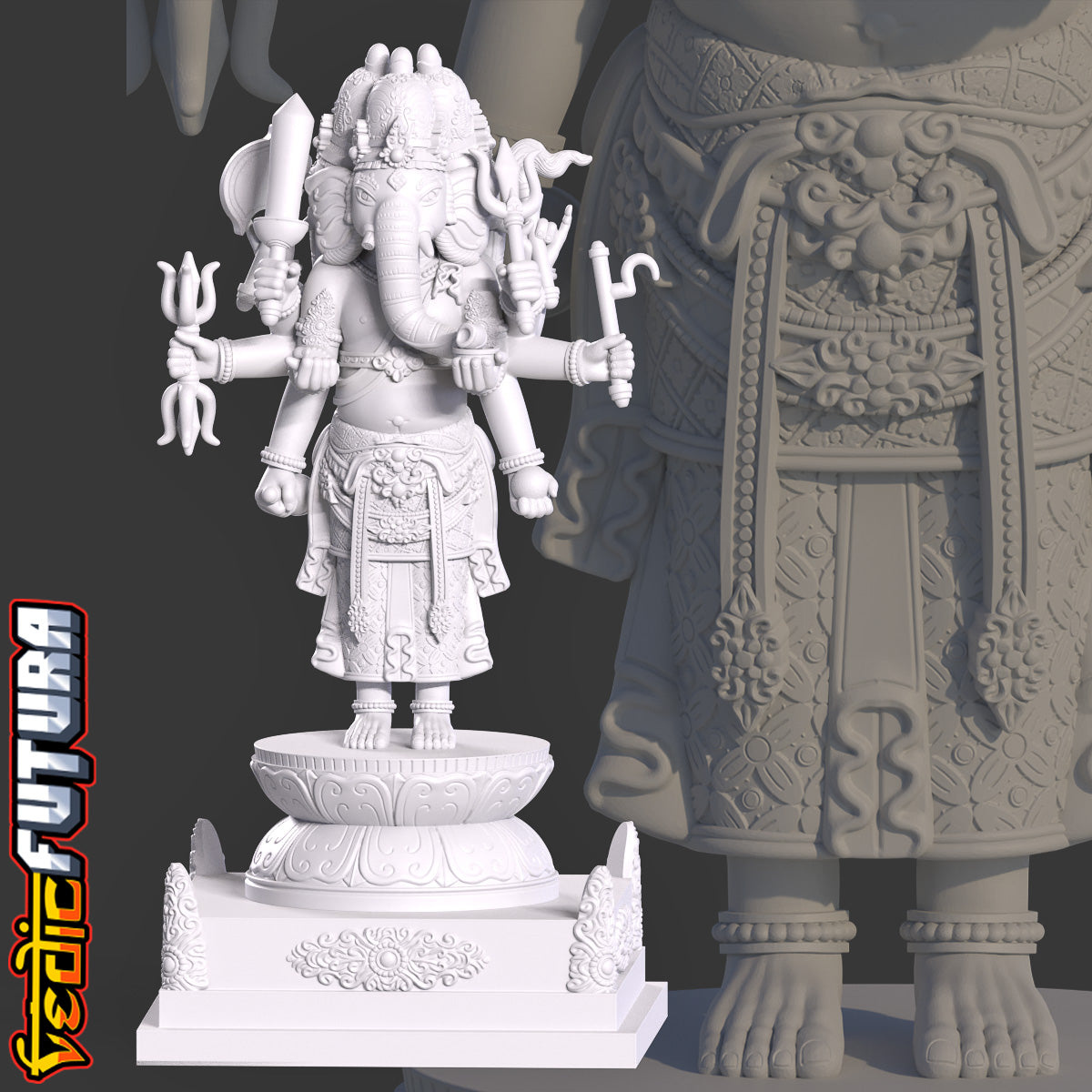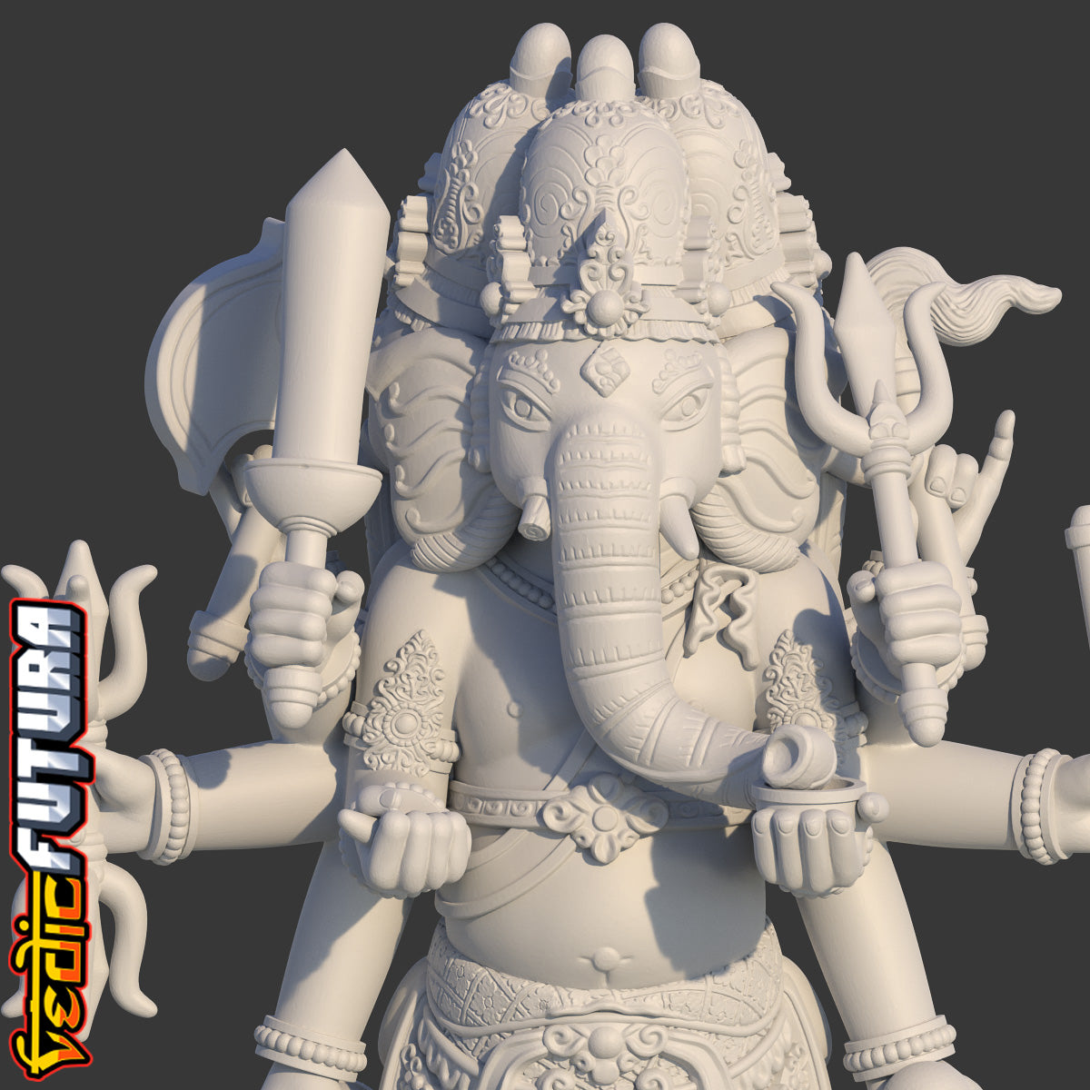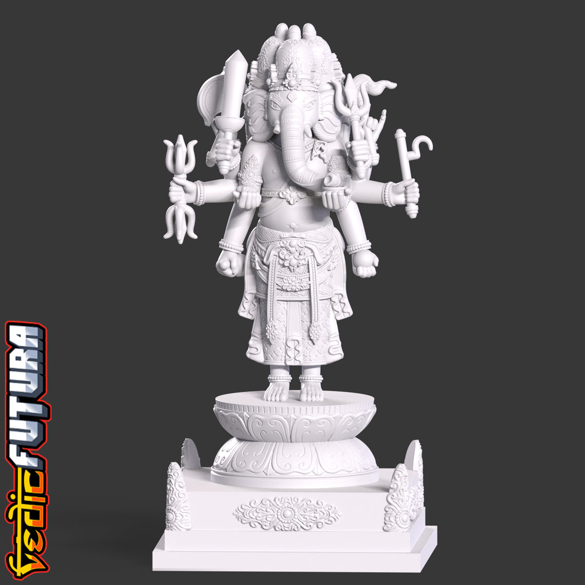The sculpt showcases eight hands, each holding a unique and symbolic item. The trident he holds is emblematic of the power of Lord Shiva, reflecting the triad of creation, preservation, and destruction. The noose and goad (ankusha) are tools for guiding souls and removing obstacles, respectively. The bell, with its resonant sound, evokes the primordial AUM, a spiritual call to the universe. Instead of the modak, Ganesha is seen holding a pomegranate fruit, symbolizing fertility, abundance, and life's rewards. The broken tusk recounts a legend of sacrifice and the quest for knowledge, while the sword stands as a beacon against ignorance. Each item collectively paints a picture of Ganesha's multifaceted nature and divine attributes.