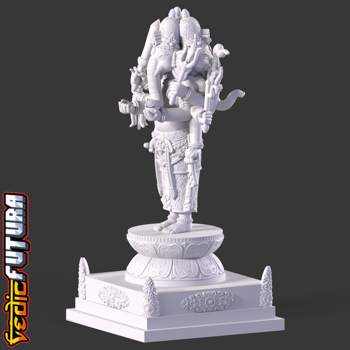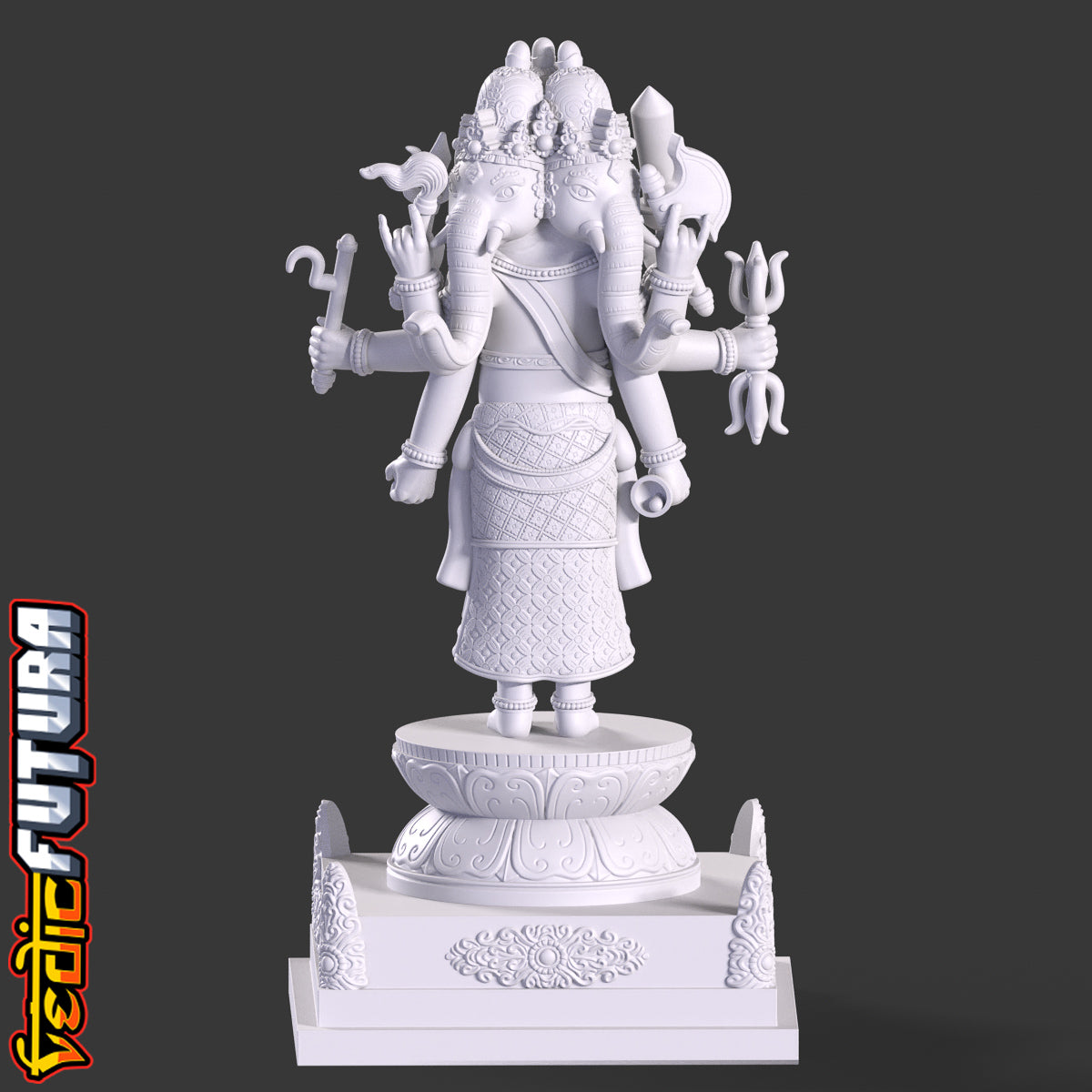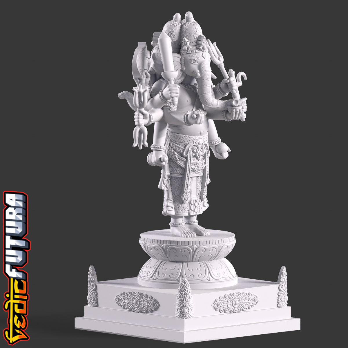 The sculpt showcases eight hands, each holding a unique and symbolic item. The trident he holds is emblematic of the power of Lord Shiva, reflecting the triad of creation, preservation, and destruction. The noose and goad (ankusha) are tools for guiding souls and removing obstacles, respectively. The bell, with its resonant sound, evokes the primordial AUM, a spiritual call to the universe. Instead of the modak, Ganesha is seen holding a pomegranate fruit, symbolizing fertility, abundance, and life's rewards. The broken tusk recounts a legend of sacrifice and the quest for knowledge, while the sword stands as a beacon against ignorance. Each item collectively paints a picture of Ganesha's multifaceted nature and divine attributes.
