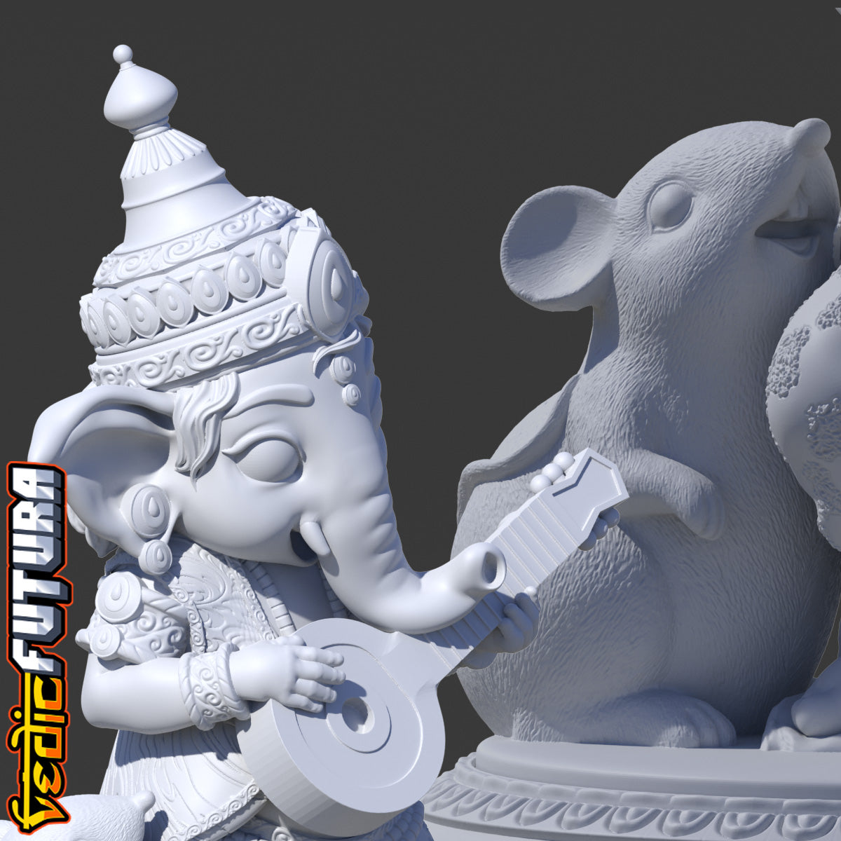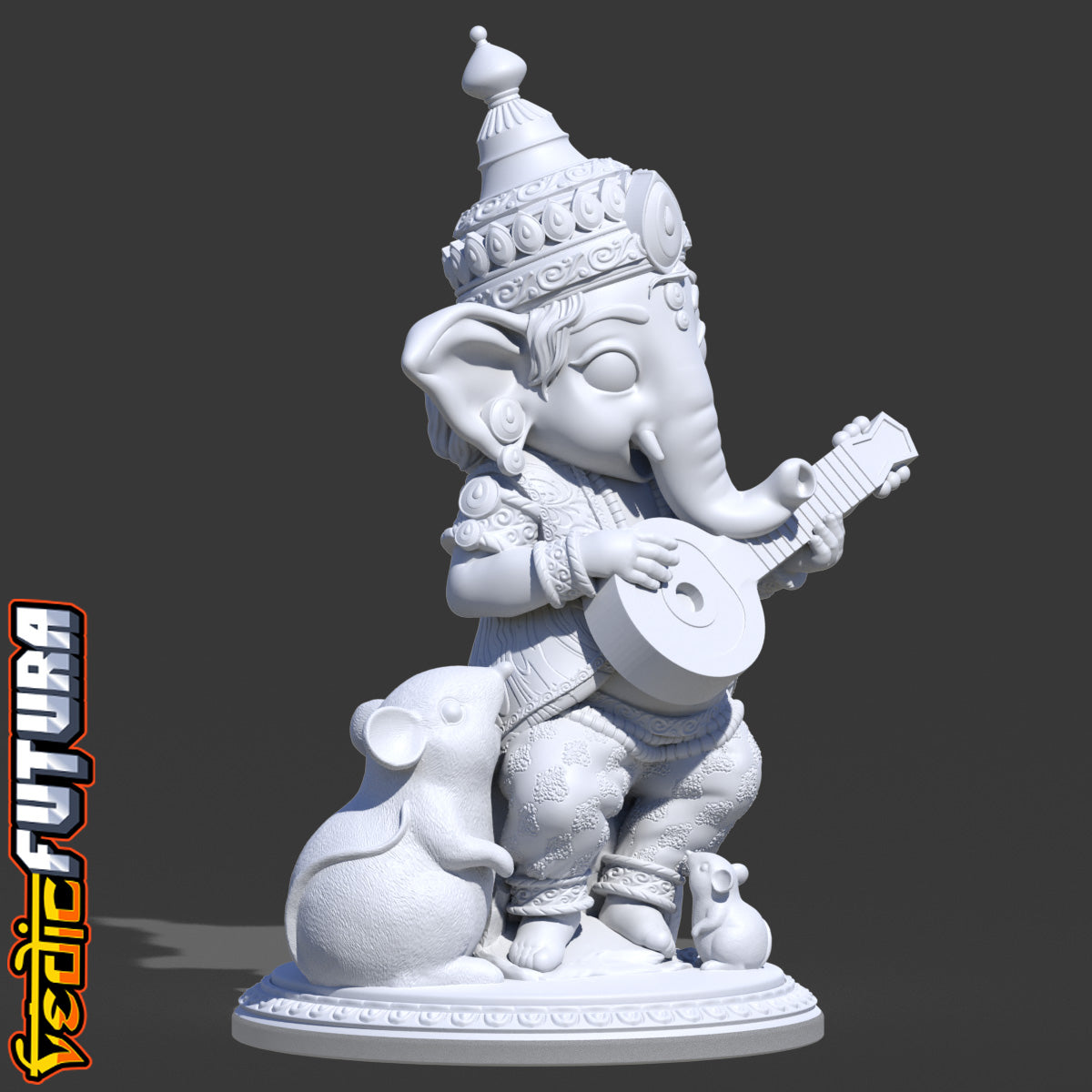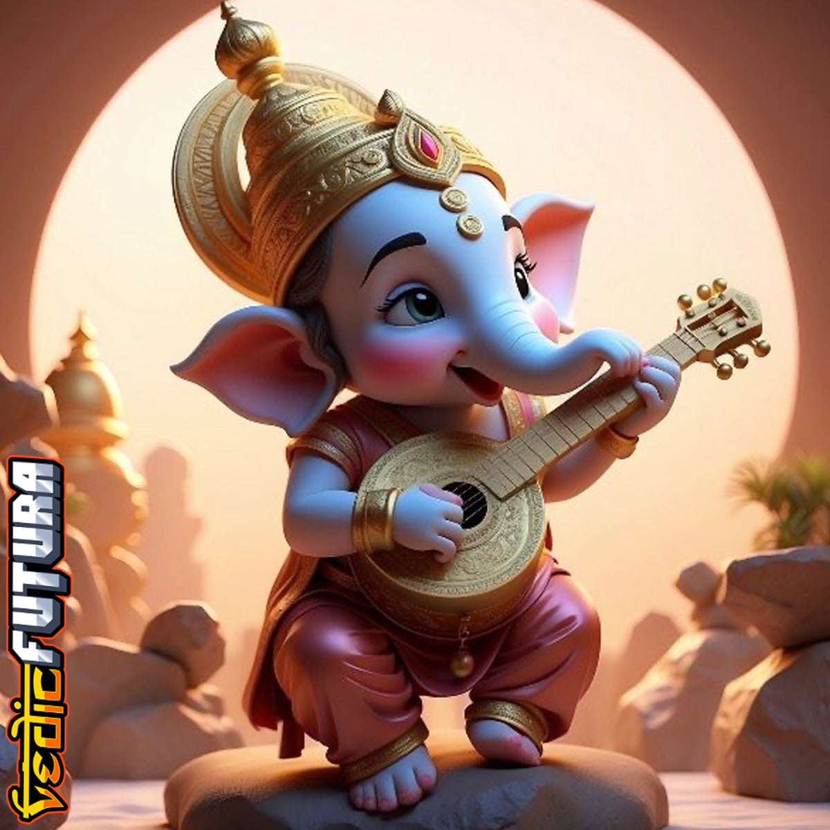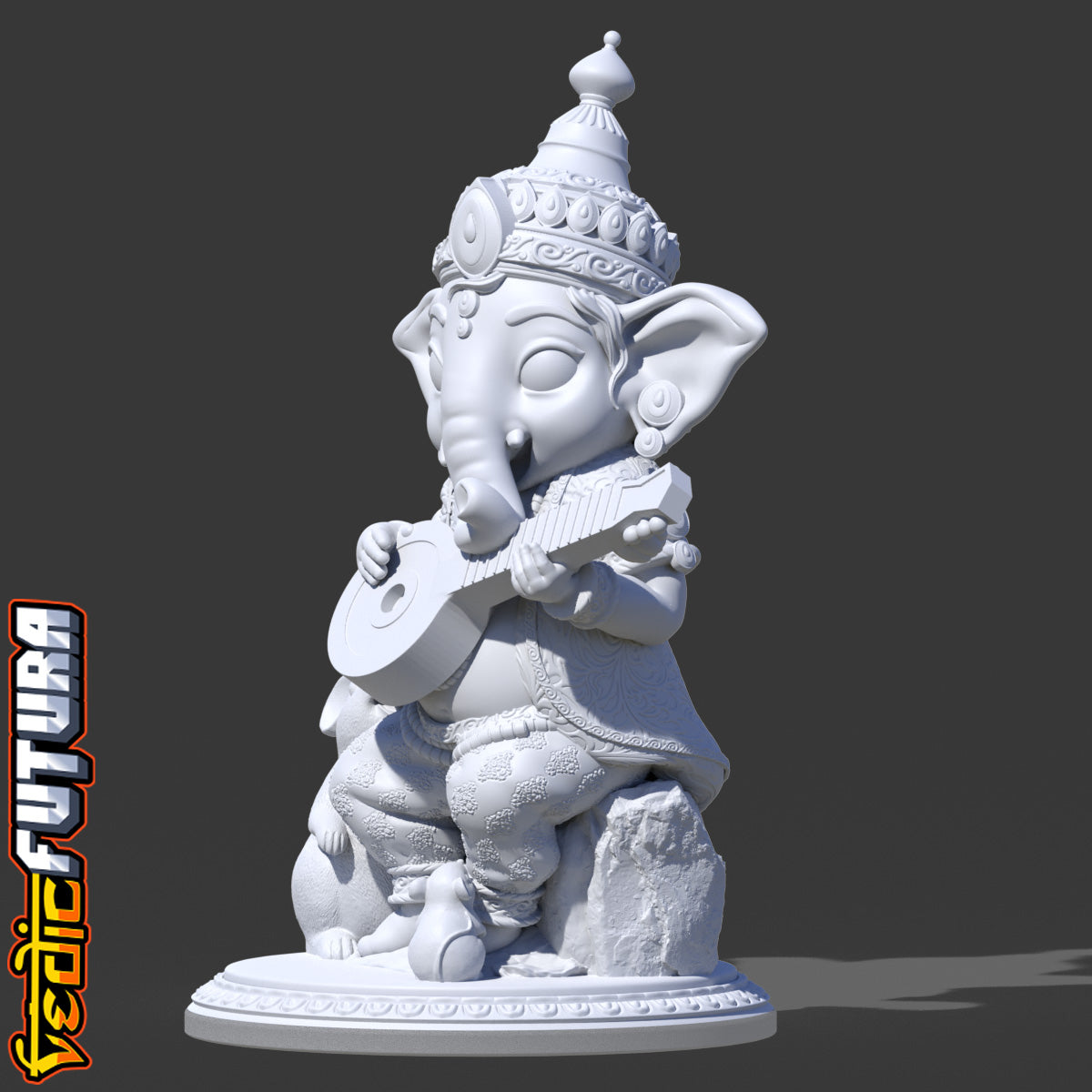 This charming sculpture of Lord Ganesha, rendered in a delightful chibi style, captures the playful and artistic aspects of the deity. Ganesha is depicted playing the veena, a classical Indian string instrument, symbolizing his patronage of the arts and sciences, particularly music and wisdom. His posture and engagement with the instrument reflect a moment of joyous creativity and cultural richness.