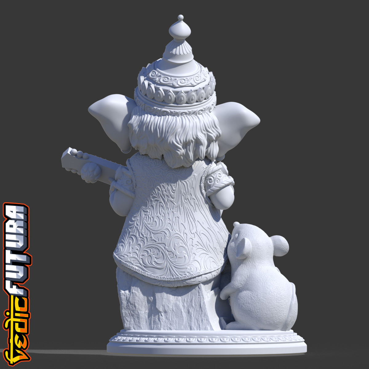Accompanying Ganesha is his vahana (vehicle), the mouse, which sits beside him, looking up adoringly. The mouse in Hindu mythology typically symbolizes desire and the mind's restless nature, which Ganesha, as the remover of obstacles, helps to control. In this depiction, the mouse adds a touch of companionship and loyalty, emphasizing Ganesha's role in harmonizing the spiritual and practical aspects of life.