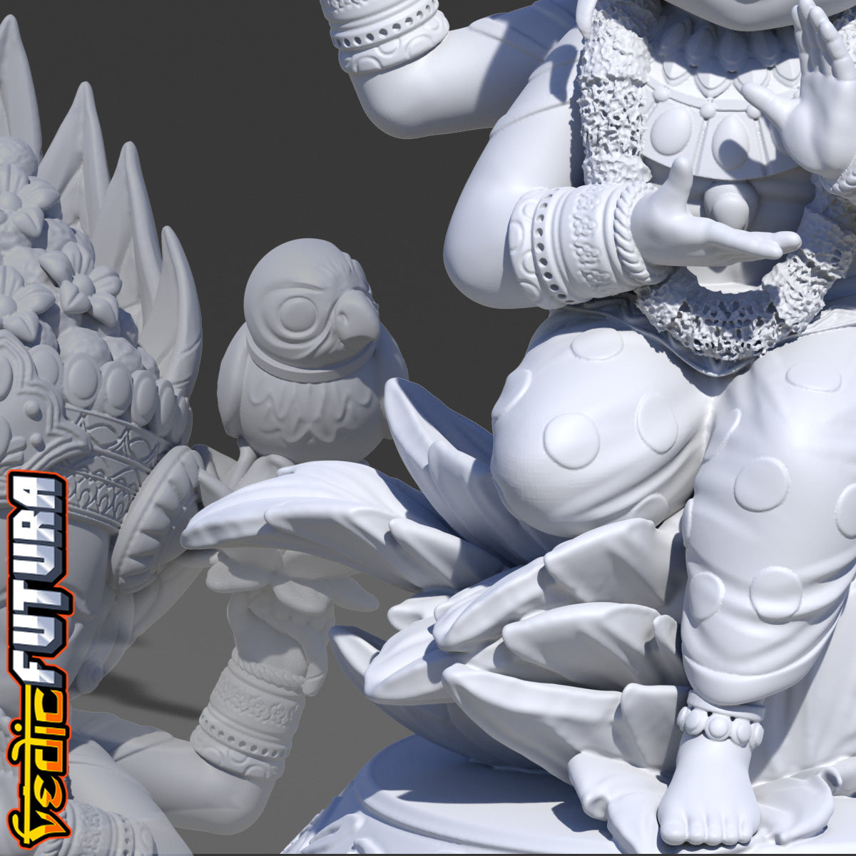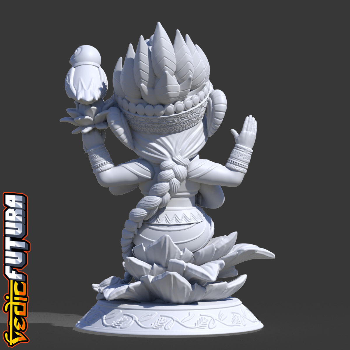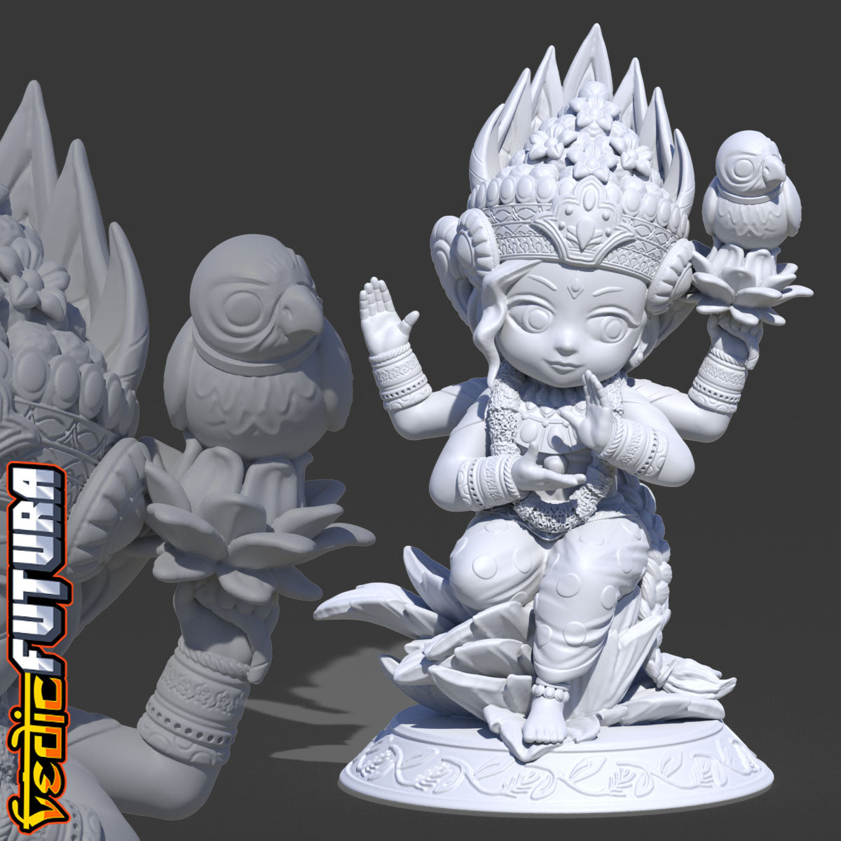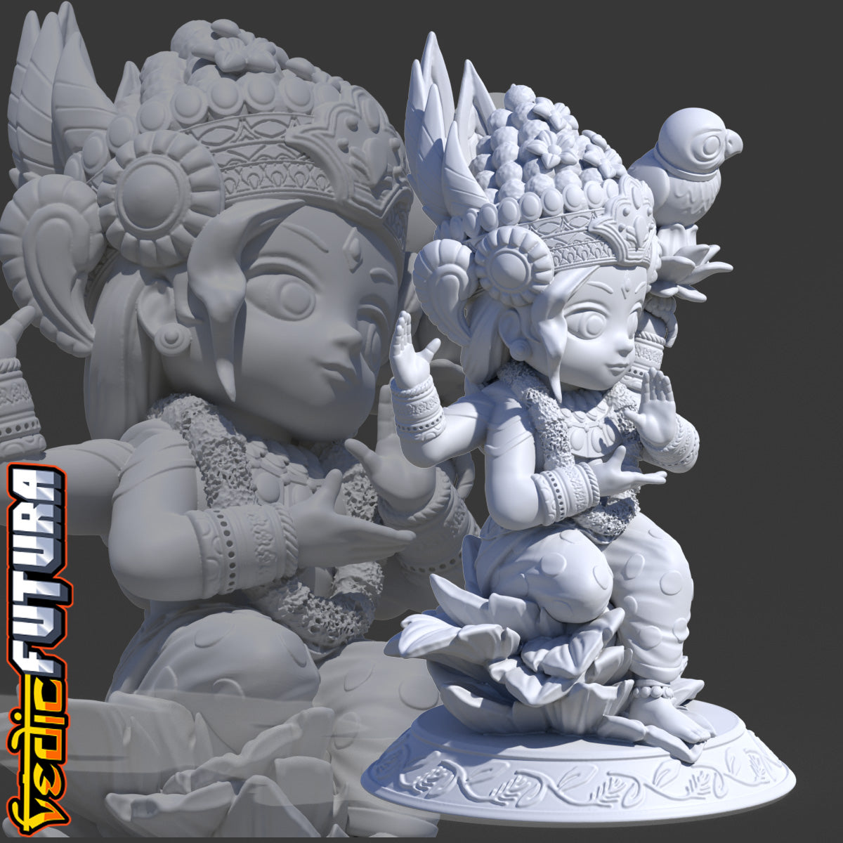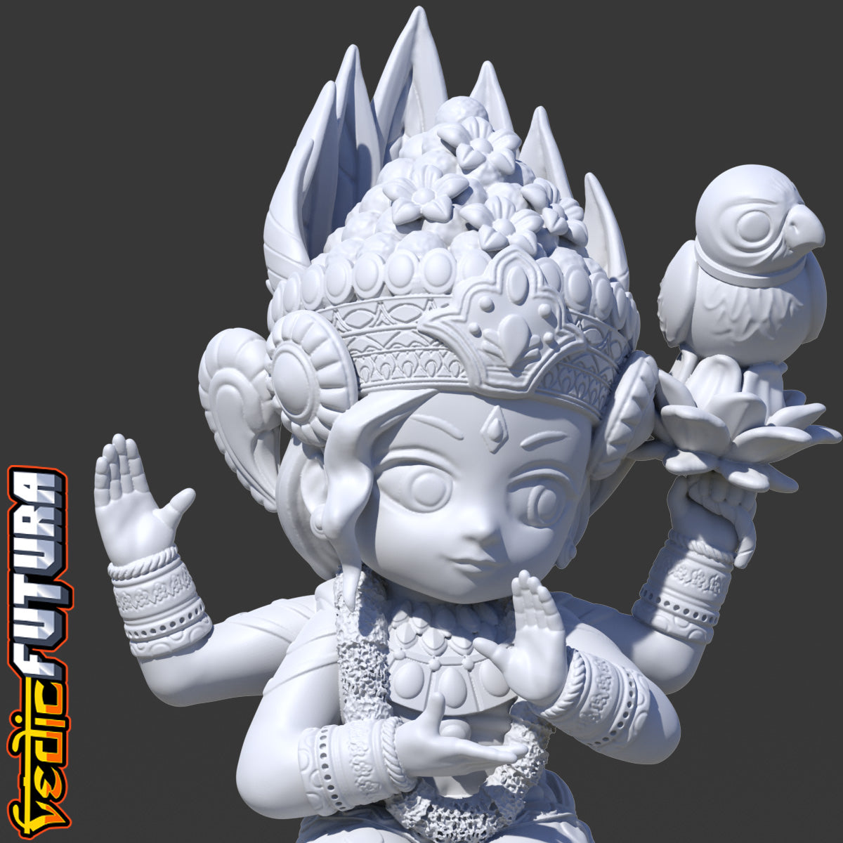 The sculpture is intricately detailed, highlighting Tulsi’s long flowing locks and the ornate jewelry that adorns her celestial form, echoing her status as a divine being. Her playful expression and the stylized, exaggerated features typical of chibi art give this portrayal a contemporary appeal while maintaining its deeply rooted cultural significance. The lotus and parrot are not merely accessories but integral symbols that enhance the narrative of Tulsi’s sanctity and her role in the spiritual and daily lives of her devotees.