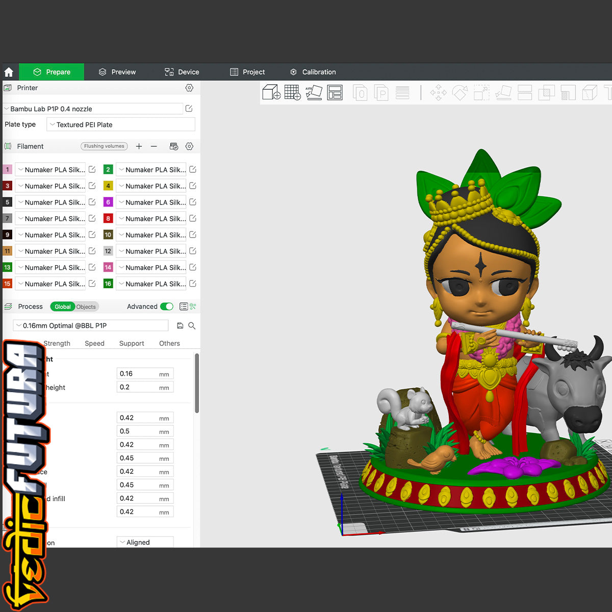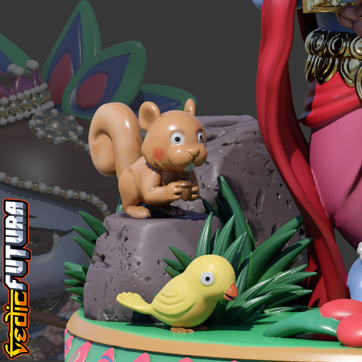 "This is Gopala Krishna in the chibi style, standing in his classic flute-playing pose. He wears a peacock feather crown, pearl jewelry, and ornate garments. A gentle cow stands by his side, while a squirrel, bird, and floral elements decorate the base, evoking the pastoral charm of Vrindavan.