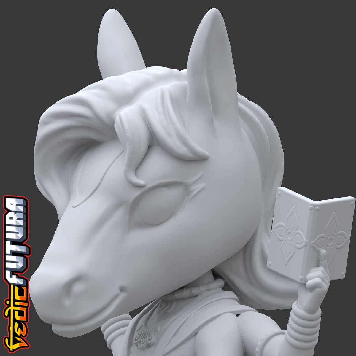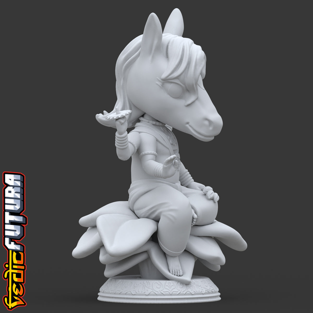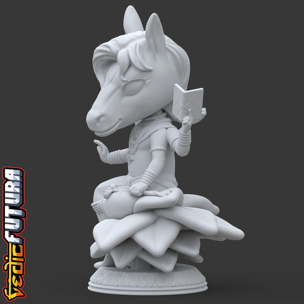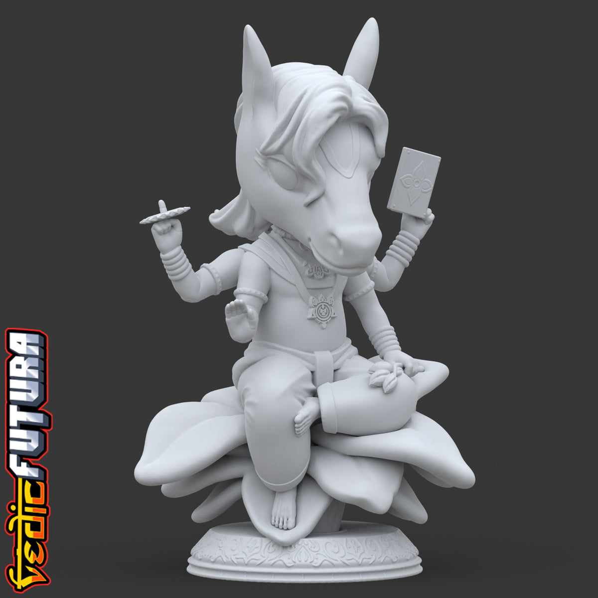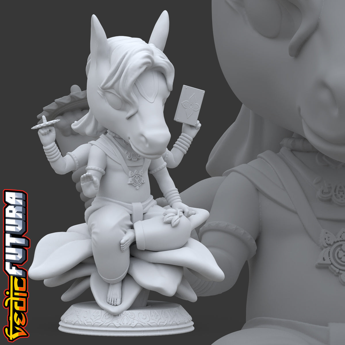 Delightful Chibi style sculpt of Hindu got Hayagreeva or Hayagriva. He is revered as an avatar of Vishnu and embodies knowledge and wisdom. He assumed this form to retrieve the Vedas, the ancient sacred scriptures of Hinduism, which were stolen by two demons named Madhu and Kaitabha.Hayagreeva is considered the supreme god of knowledge. He is invoked by seekers of knowledge and devotees who are students, teachers, scholars, and researchers. Along with his horse head, Hayagreeva is usually depicted with four hands, holding a book of scriptures, a mace, a conch shell, and a lotus. Each of these items is significant. The book represents the Vedas and knowledge, the mace symbolizes strength, the conch stands for the primordial sound and existence, and the lotus denotes purity and spiritual transcendence.
