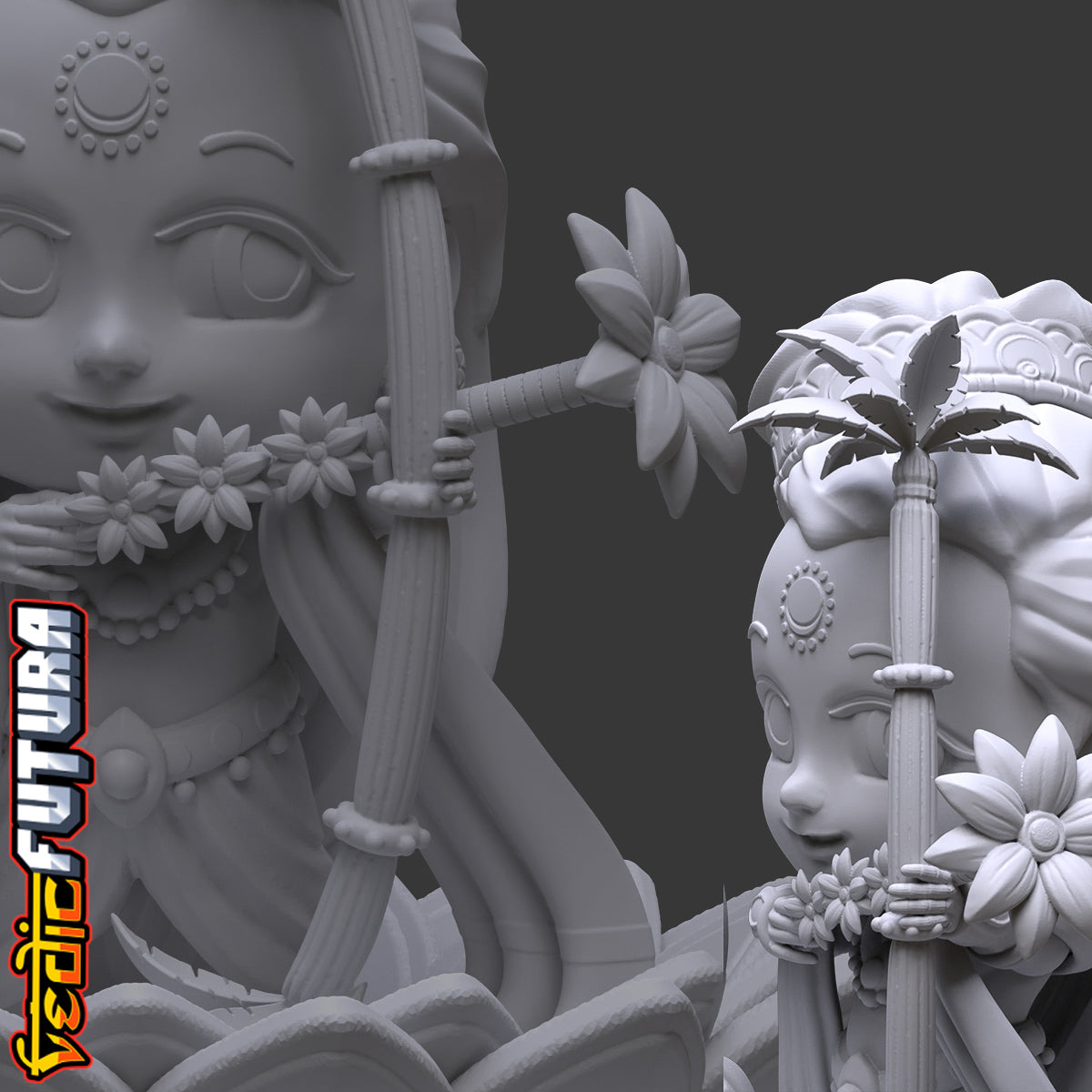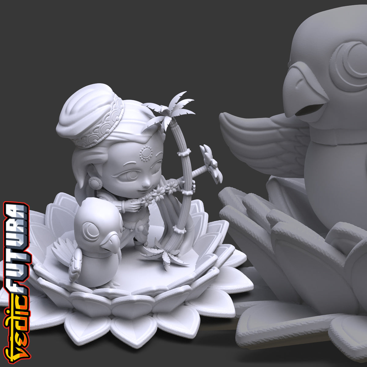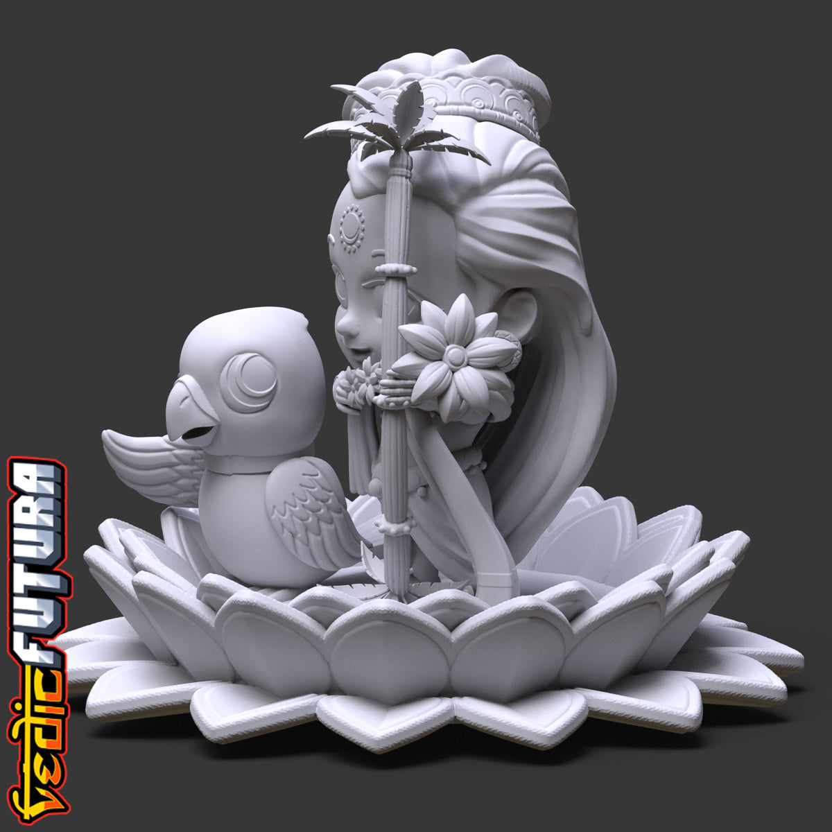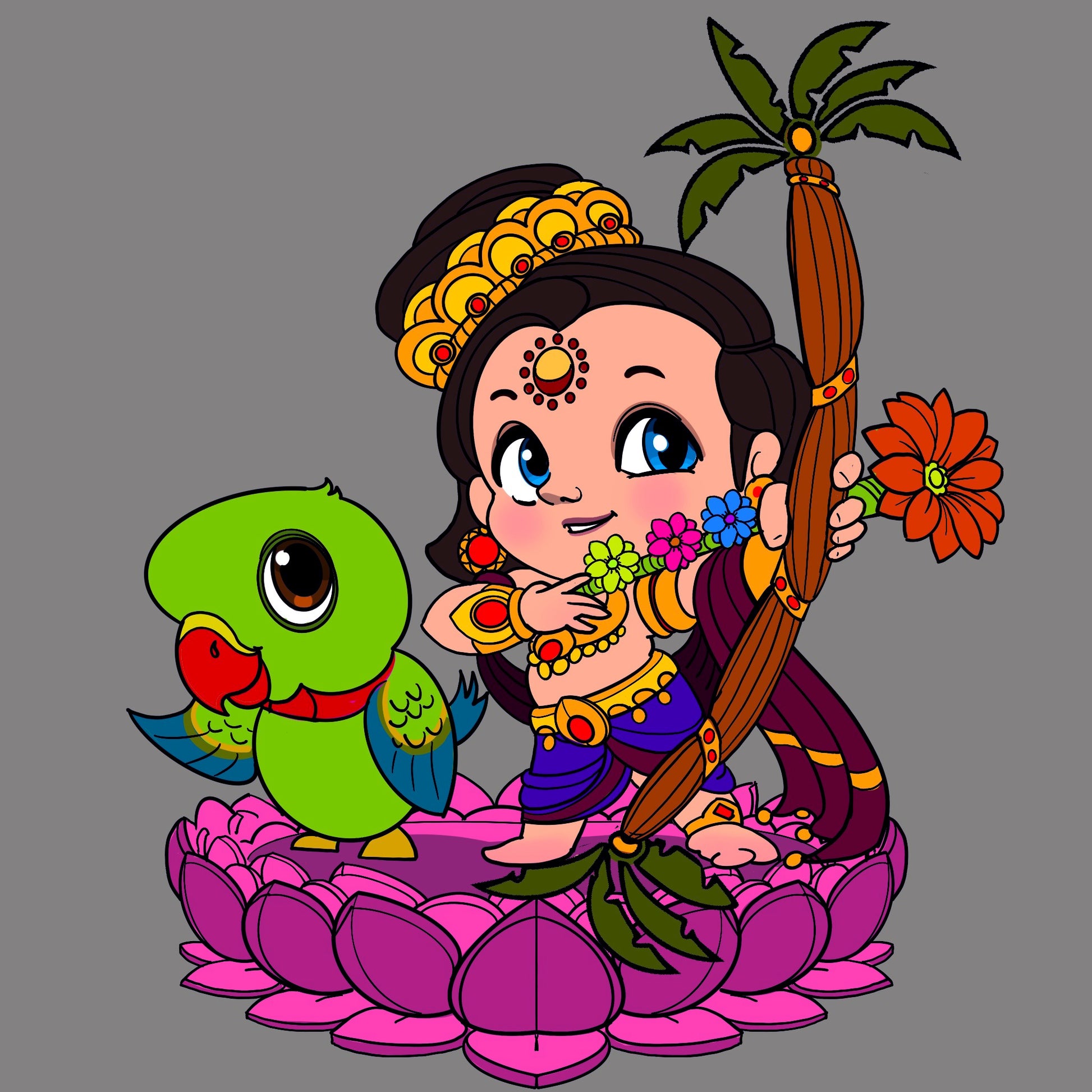 The sculpture depicts Kama Deva, the god of love in Hindu mythology, reimagined in the whimsical Chibi style. The figure exhibits exaggerated and endearing features characteristic of Chibi, such as a large head, big expressive eyes, and a compact body. Kama Deva stands gracefully on a delicately sculpted lotus base, emphasizing purity and spiritual ascension. In his hands, he wields a distinctive bow made of sugarcane, symbolizing the sweet and enticing nature of love. The sugarcane bow is strung with an arrow, its tip adorned with a flower, further emphasizing the gentle and benevolent power of romantic attraction. By his side is his loyal vehicle, a charmingly rendered parrot. The parrot, with its round and plump form, complements the overall cute aesthetics of the sculpture. The presence of the bird resonates with Kama Deva's association with communication and vocal expression in matters of the heart.