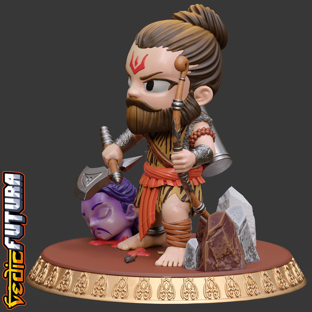 "This model depicts Parashurama in chibi style, standing with a fierce expression. He holds his signature axe and a bow, with a quiver of arrows on his back. Dressed in tiger-skin garments, he stands over the severed head of a fallen warrior, with broken weapons and cracked mountains at his feet.