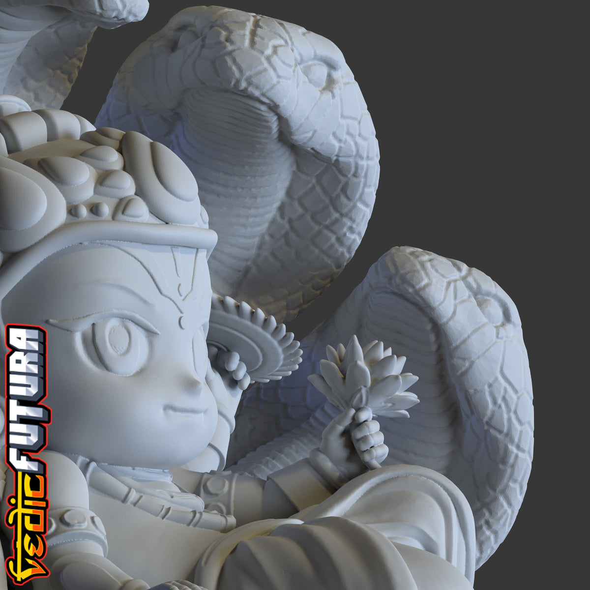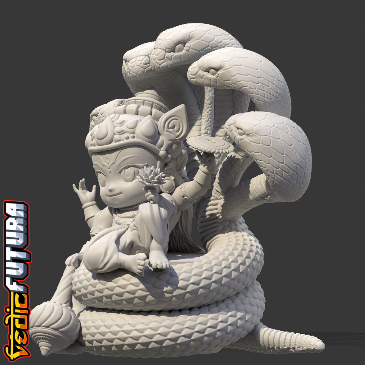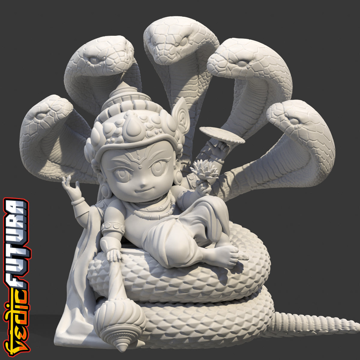 Vishnu reclines gracefully on the divine serpent, Seshnaag, which coils beneath him as a protective bed. The snake, with its five intricately designed heads, arches over Vishnu, forming a protective canopy. Each head of the Seshnaag is attentively crafted, showing off scaled patterns and prominent eyes. Vishnu's face, which beams with a gentle smile. His large, expressive eyes, a hallmark of the Chibi style, radiate kindness and tranquility. The traditional symbolism with the playful Chibi form creates a delightful and endearing representation of Lord Vishnu.