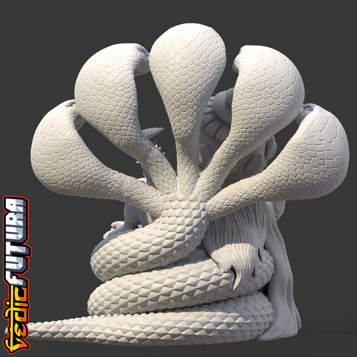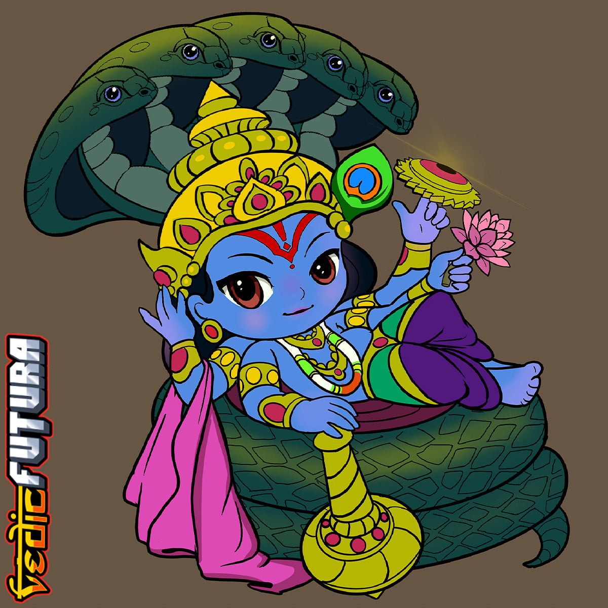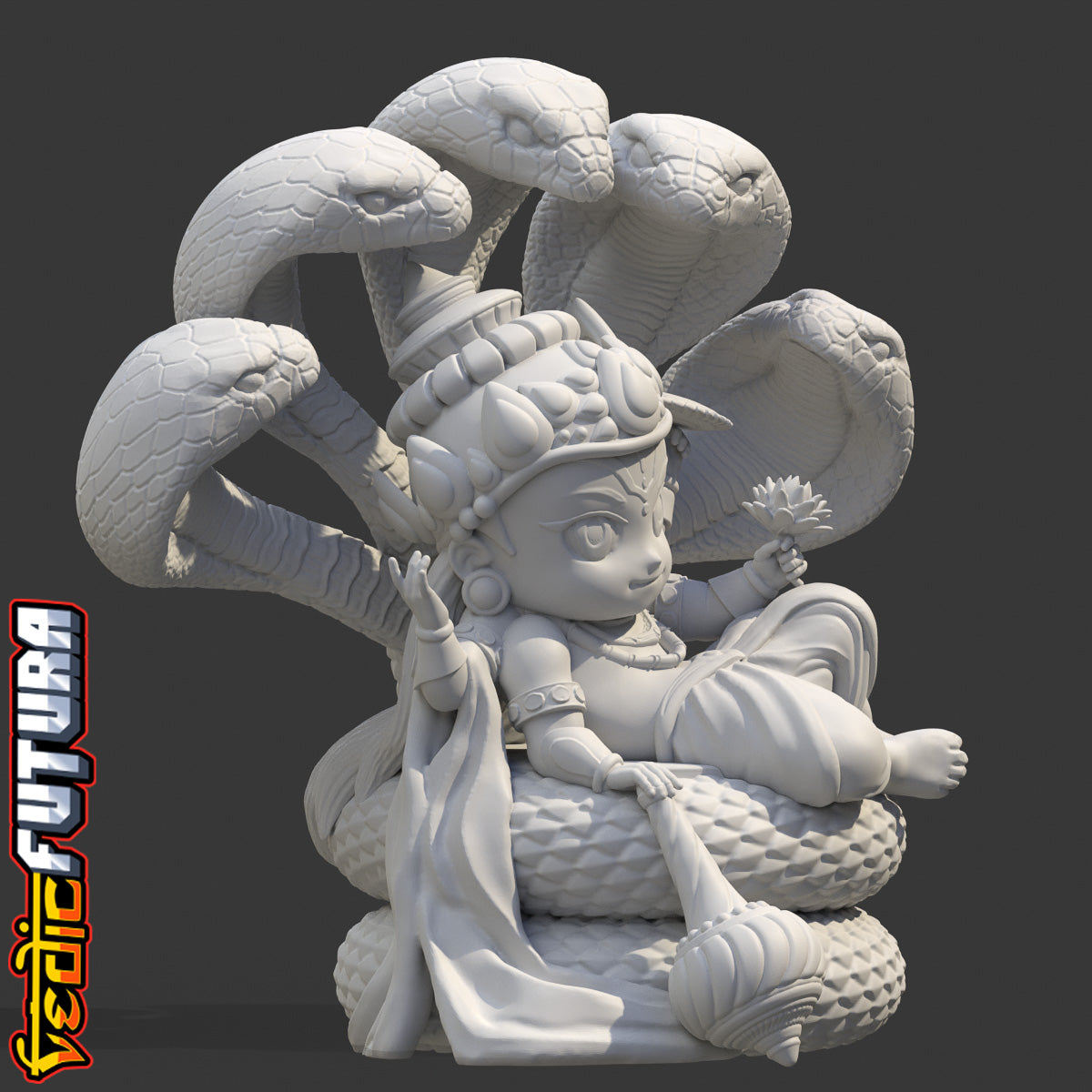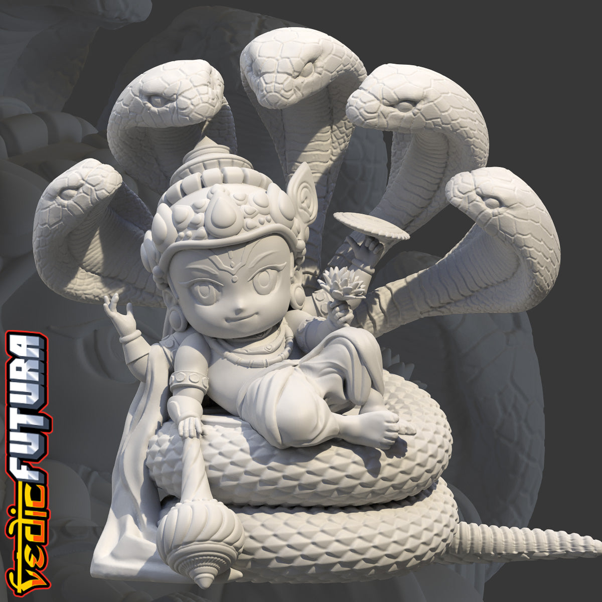 Vishnu reclines gracefully on the divine serpent, Seshnaag, which coils beneath him as a protective bed. The snake, with its five intricately designed heads, arches over Vishnu, forming a protective canopy. Each head of the Seshnaag is attentively crafted, showing off scaled patterns and prominent eyes. Vishnu's face, which beams with a gentle smile. His large, expressive eyes, a hallmark of the Chibi style, radiate kindness and tranquility. The traditional symbolism with the playful Chibi form creates a delightful and endearing representation of Lord Vishnu.