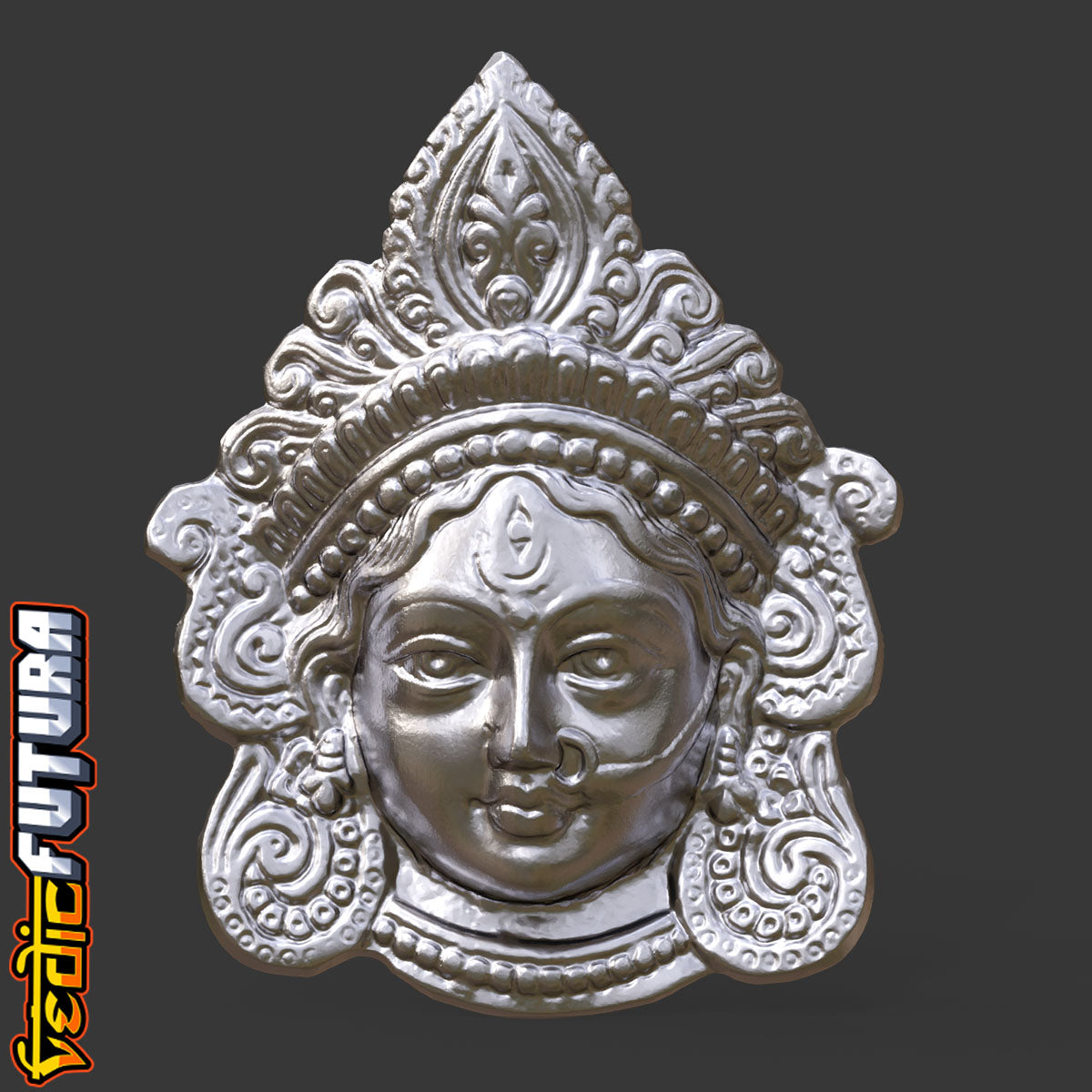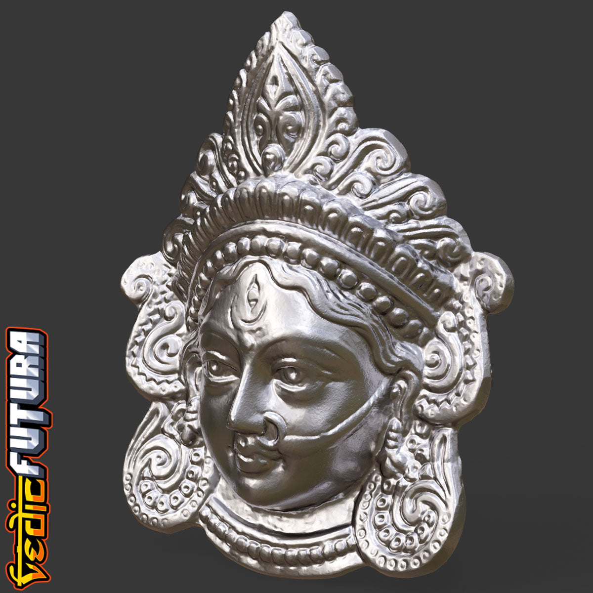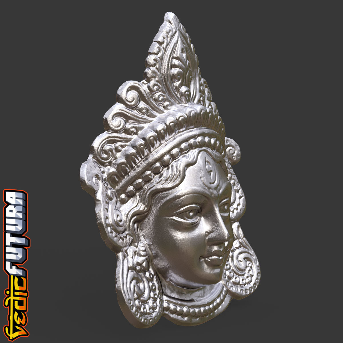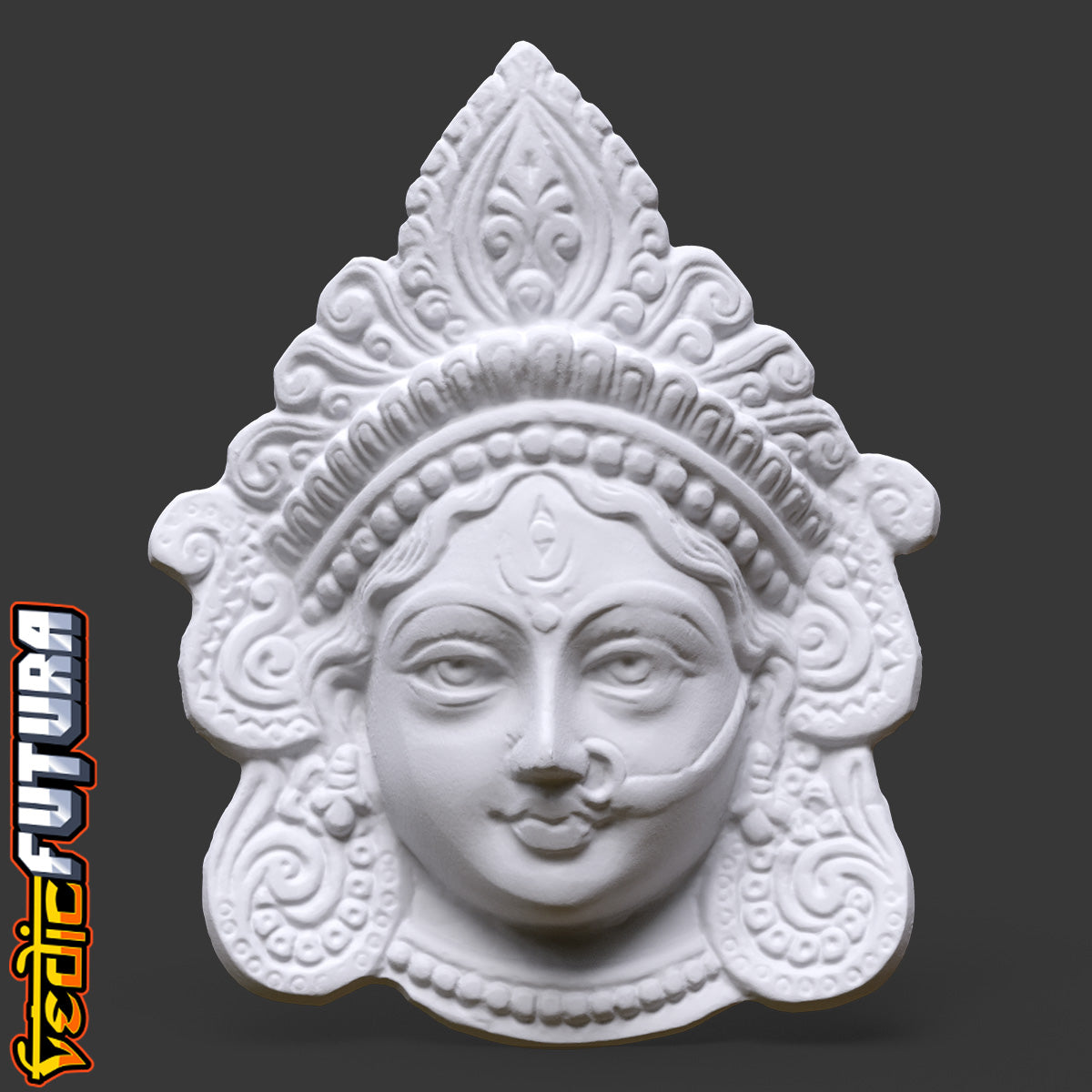 This sculpted head of Goddess Durga features a serene, yet powerful expression. The face is adorned with traditional detailing, including an ornate crown with floral motifs and a prominent third eye symbolizing divine vision. The subtle smile and gently arched brows convey both compassion and strength. The crescent moon on her forehead and delicate earrings enhance her divine presence, embodying her role as a protector and embodiment of Shakti, or cosmic energy.