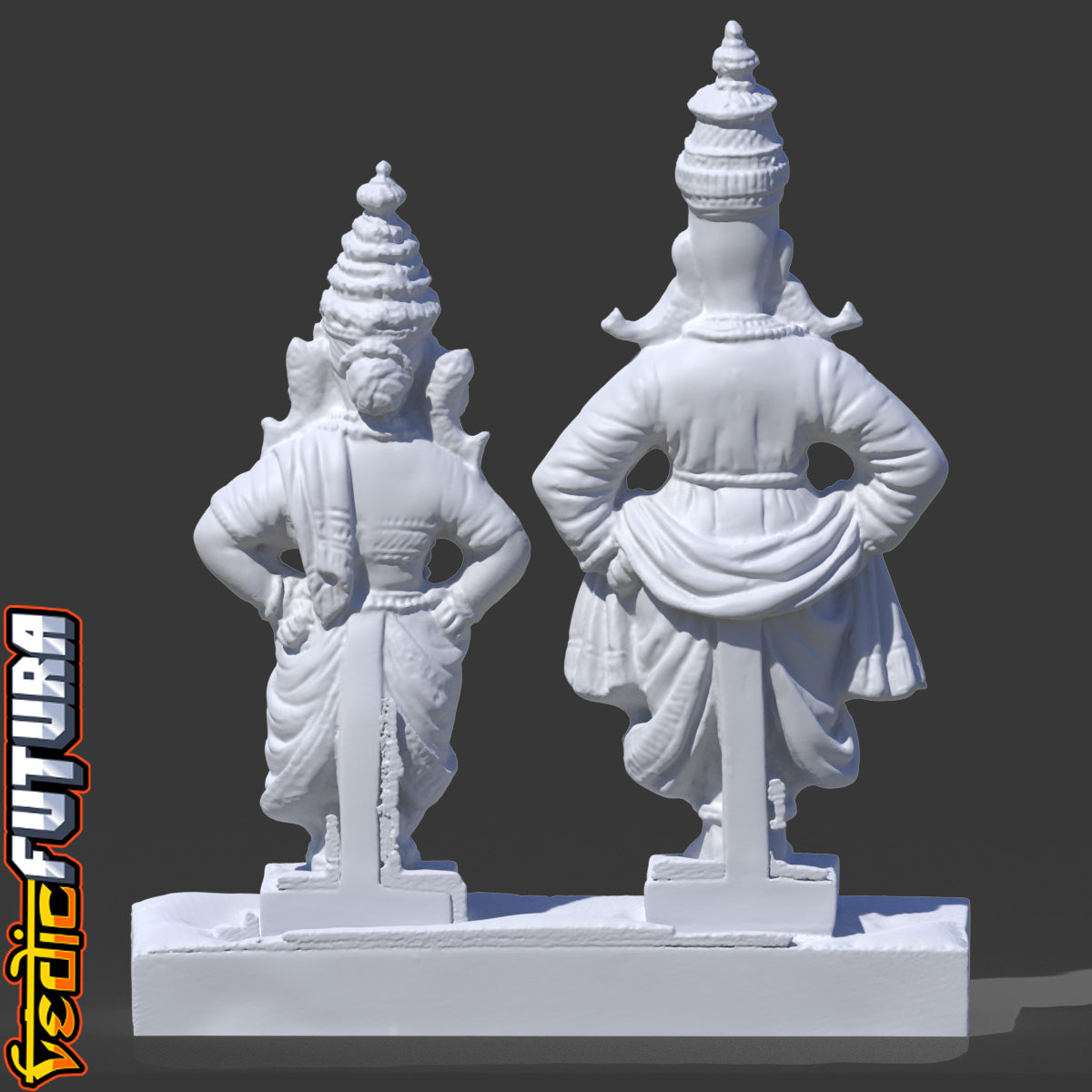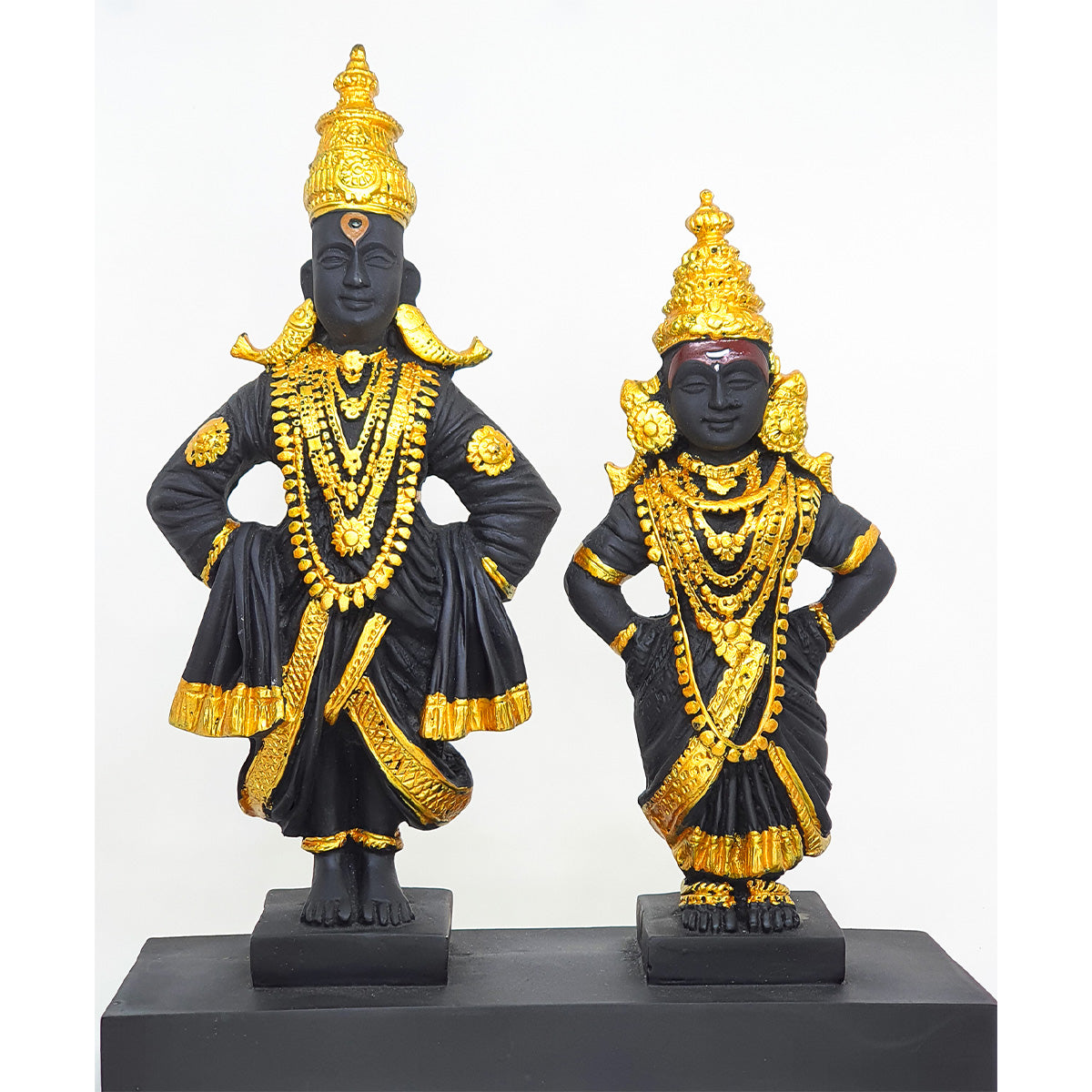 The sculptures exude a sense of divinity and grace, drawing on the deep spiritual connection and adoration Vithoba holds within the hearts of his followers. The intricate detailing in the ornaments and the vibrant contrast of the gold against the dark tones highlight the meticulous craftsmanship, bringing the divine couple to life and inviting worship and reverence. Vithoba's temple in Pandharpur remains a significant pilgrimage site, embodying the essence of devotion encapsulated in this exquisite representation.