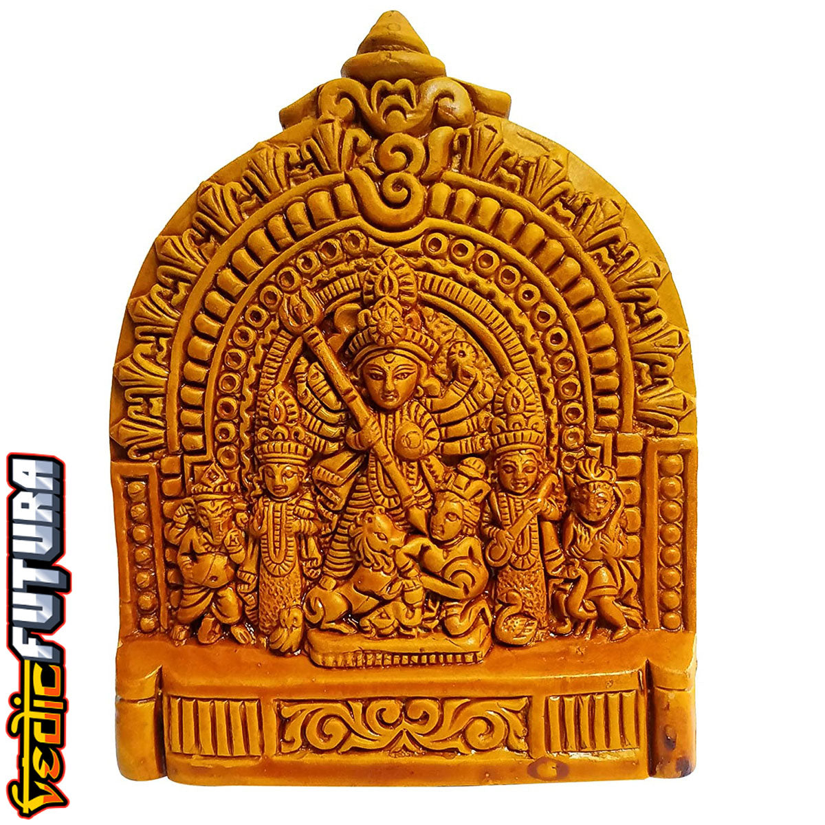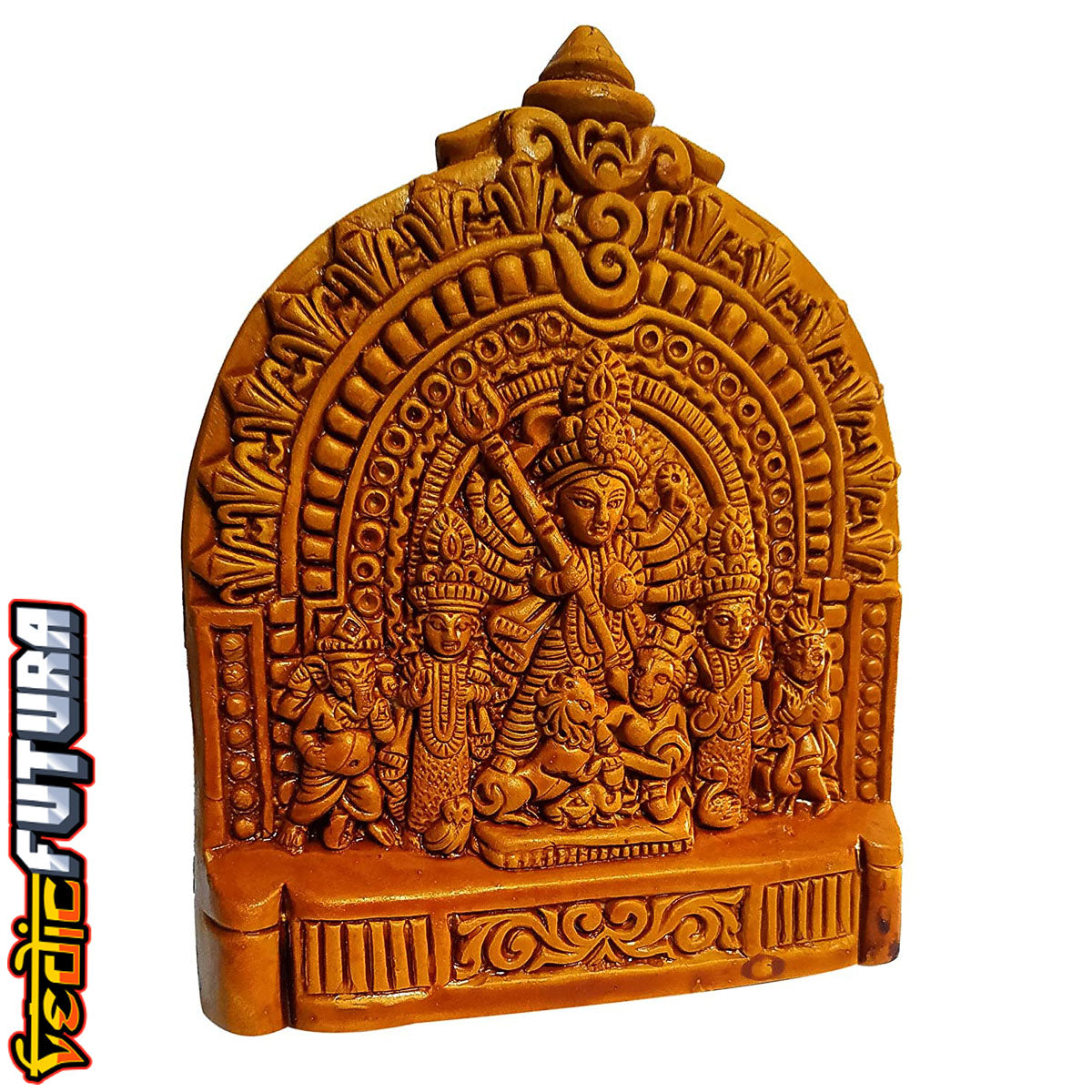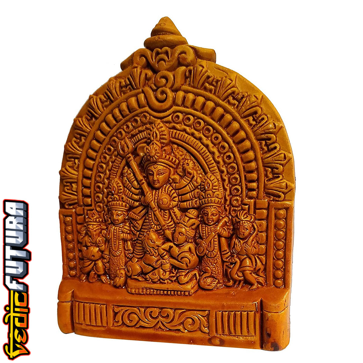 Durga's legend centers around combating evils and demonic forces that threaten peace, prosperity, and dharma, representing the power of good over evil. Durga, on her lion, appeared before Mahishasura where the demon took on different forms and attacked the goddess. Each time, Durga would destroy his forms. At last, Durga slew Mahishasura with her trident when he was transforming as a buffalo demon. On the two extreme ends are Ganesha and Subramanya (aka Kartikeya) riding a peacock. With this avatar of their mother Paravati, the boy gods signify knowledge and strength respectively. Identifiable by the swan (purity) and owl (wisdom) this intricately crafted terracotta piece is flanked on the sides by the two supreme goddesses, Saraswati and Lakshmi. Along with the Mother of the Vedas, Saraswati and the Goddess of Prosperity Lakshmi, these three together form the Hindu pantheon.