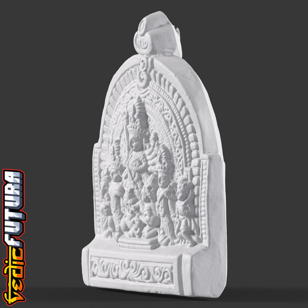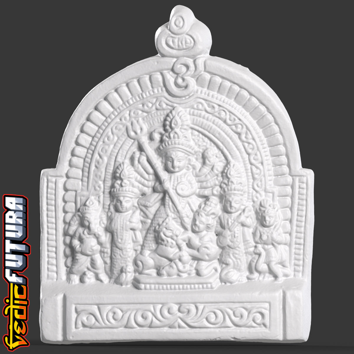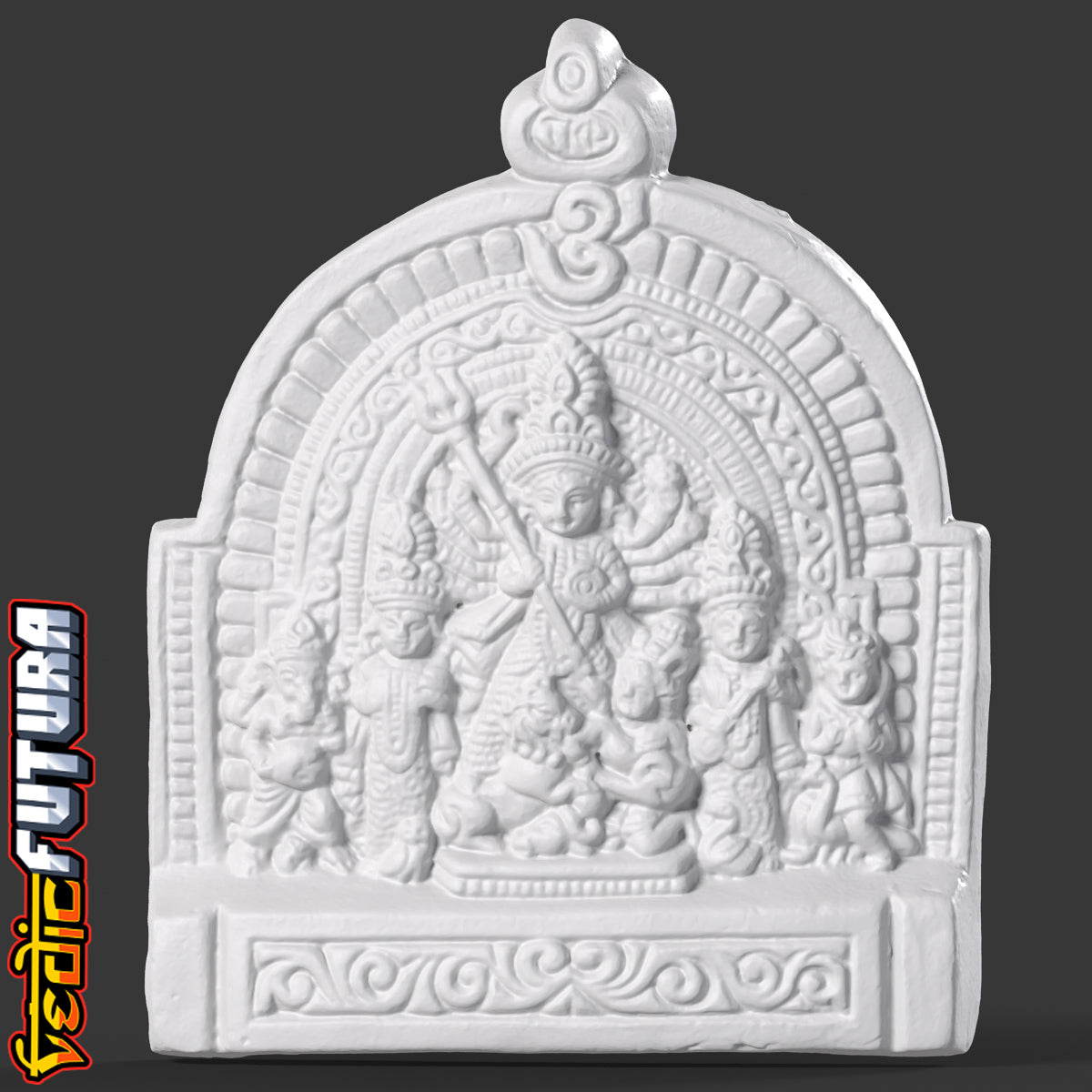 Durga's legend centers around combating evils and demonic forces that threaten peace, prosperity, and dharma, representing the power of good over evil. Durga, on her lion, appeared before Mahishasura where the demon took on different forms and attacked the goddess. Each time, Durga would destroy his forms. At last, Durga slew Mahishasura with her trident when he was transforming as a buffalo demon. On the two extreme ends are Ganesha and Subramanya (aka Kartikeya) riding a peacock. With this avatar of their mother Paravati, the boy gods signify knowledge and strength respectively. Identifiable by the swan (purity) and owl (wisdom) this intricately crafted terracotta piece is flanked on the sides by the two supreme goddesses, Saraswati and Lakshmi. Along with the Mother of the Vedas, Saraswati and the Goddess of Prosperity Lakshmi, these three together form the Hindu pantheon.