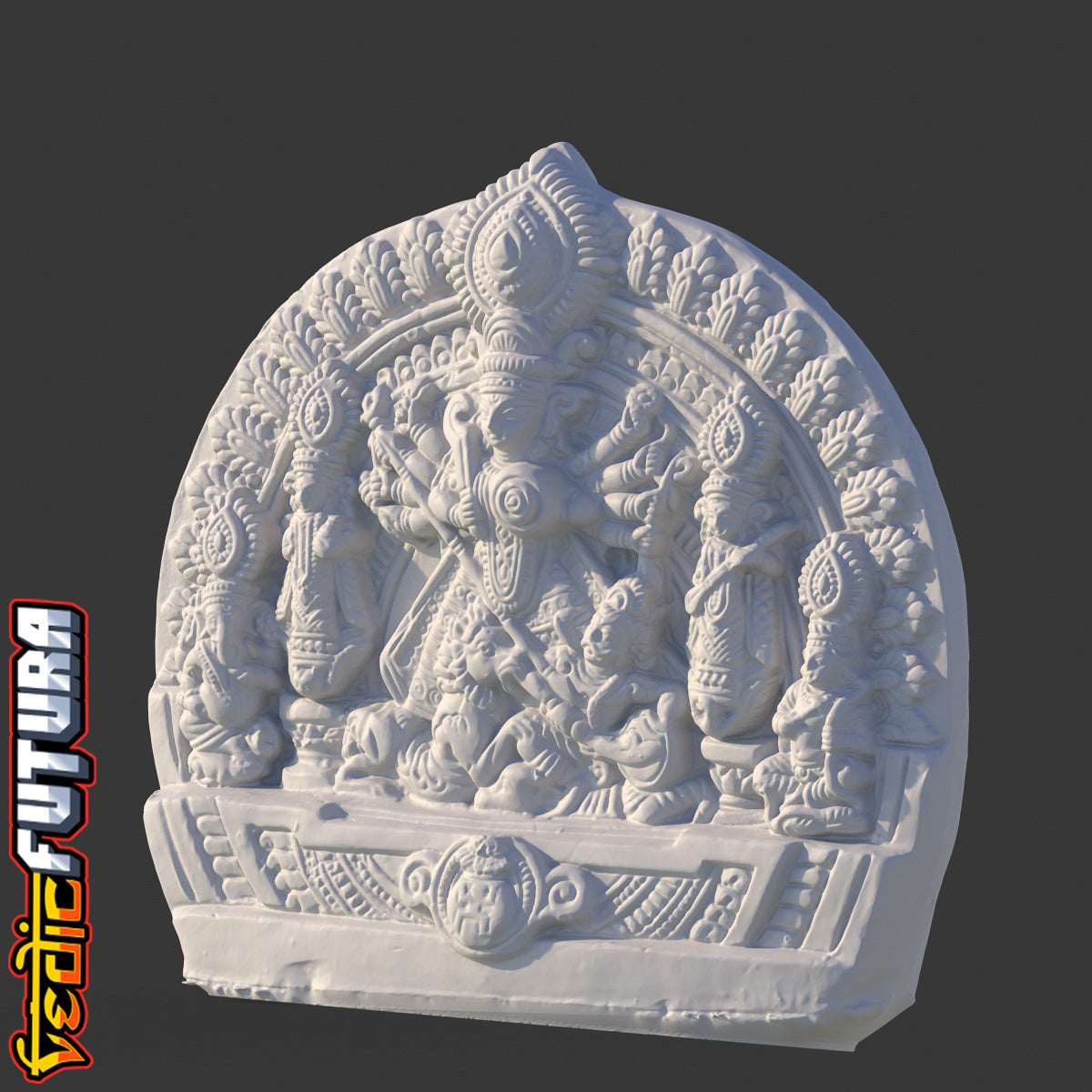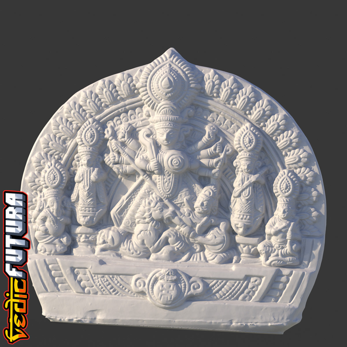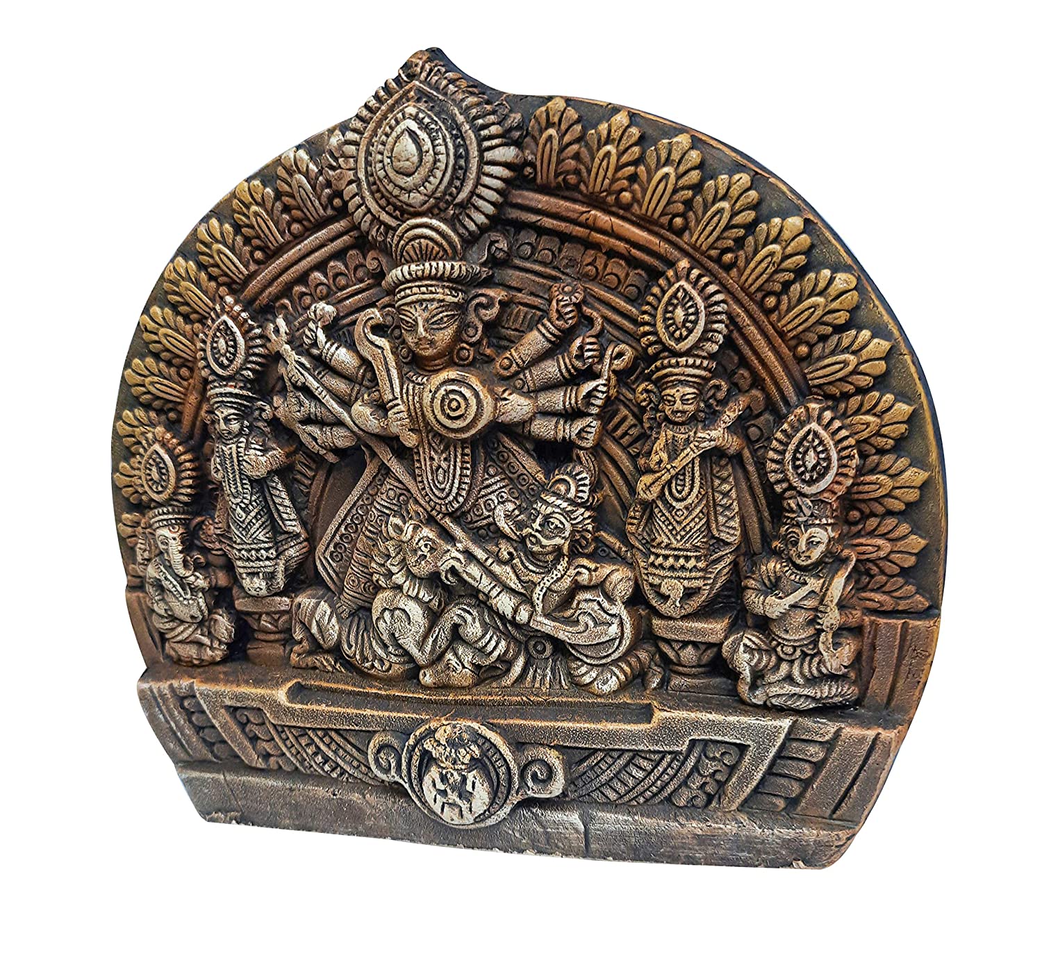 This intricately crafted terracotta sculpture vividly portrays the significant event of Goddess Durga slaying the buffalo demon, Mahisasura. The sculpture captures the intensity of the moment, presenting a dynamic tableau of divine triumph over demonic force. Dominating the scene is Goddess Durga, depicted with multiple arms, each holding a different weapon. She is shown in the act of slaying Mahisasura, the buffalo demon, who is depicted below her. Flanking Goddess Durga on either side are two other revered goddesses—Lakshmi and Saraswati.On the outer edges of the sculpture are Durga's children Ganesha and Skanda, who are blessed to witness the awesome power of their mother.