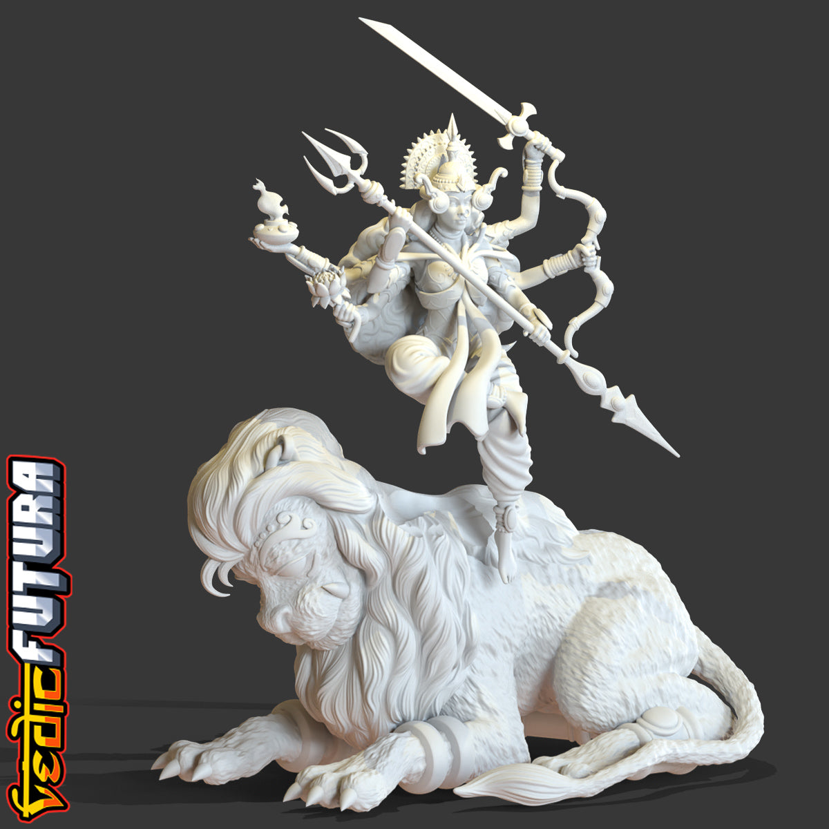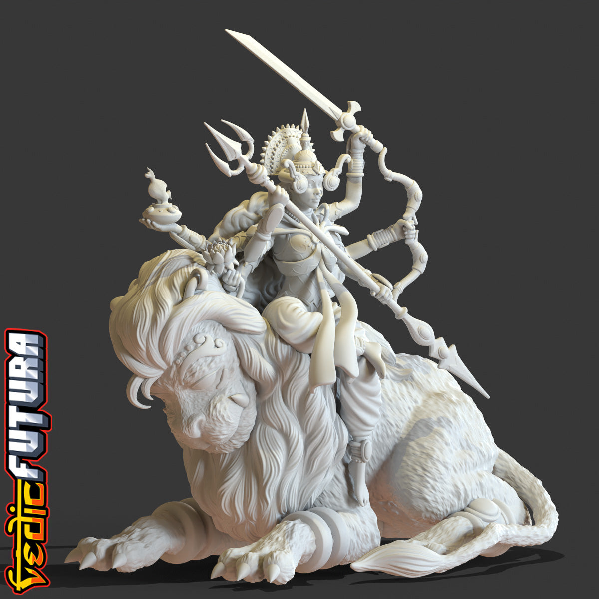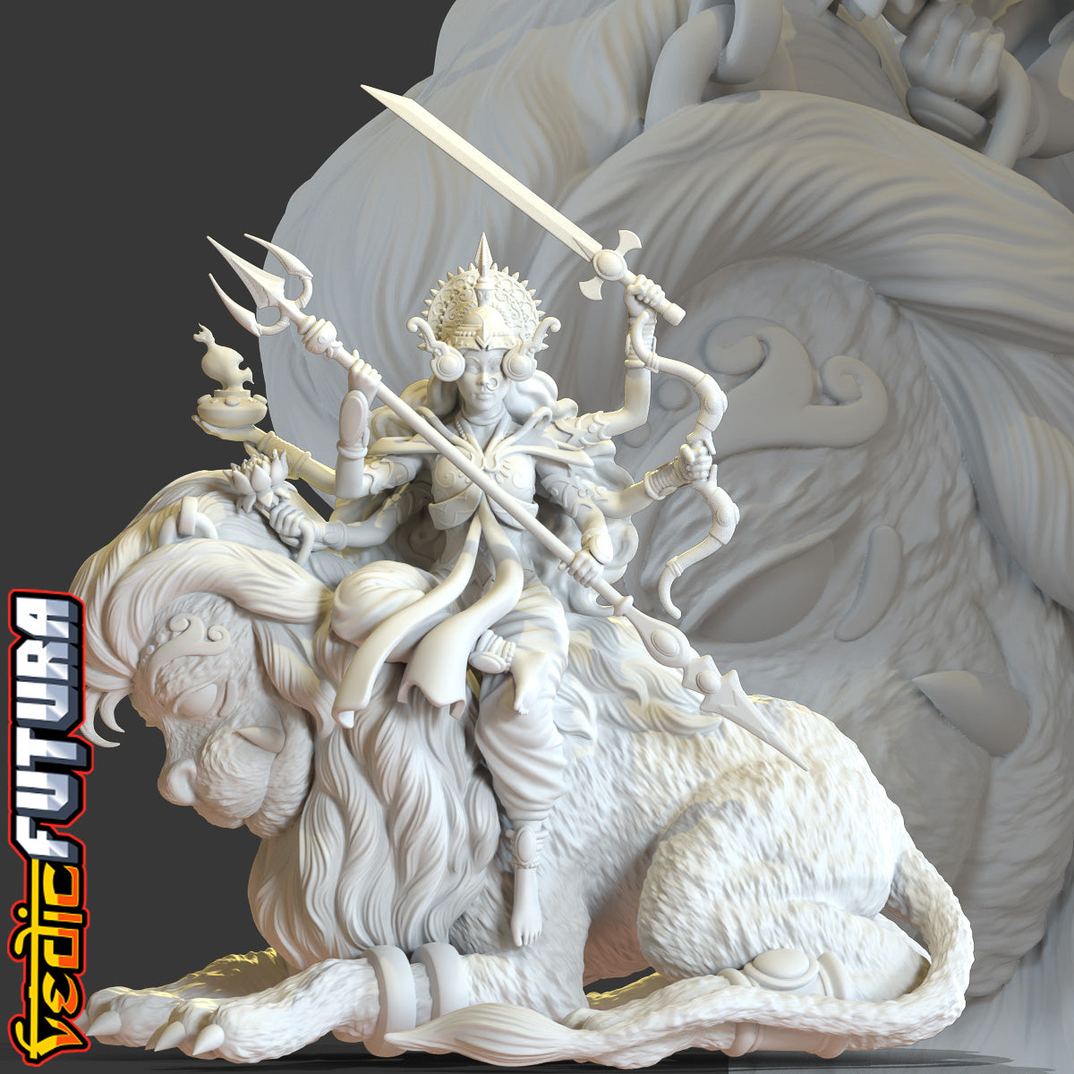 Considered as the feminine epitome of strength, Durga is depicted in a variety of Vedic literature as a goddess having feminine prowess, power, determination, wisdom. When the three Supreme Gods, Brahma, Vishnu and Shiva were unable to overcome the demon Mahishasura, they decided to combine their powers and created Durga. Embodying their collective energy (shakti), she is both derivative from the male divinities and the true source of their inner power. The ten arms of the deity symbolize that she protects her devotees from all directions namely the eight corners and from the sky and the earth. The ten hands of Goddess Durga hold in them a conch, discus, lotus, sword, bow with arrow, trishul, mace, thunderbolt, snake and flame. The lion of Mother Durga is a symbol of “Dharma”. It represents power, will and determination. Mother Durga riding the lion symbolizes her mastery over all these qualities.