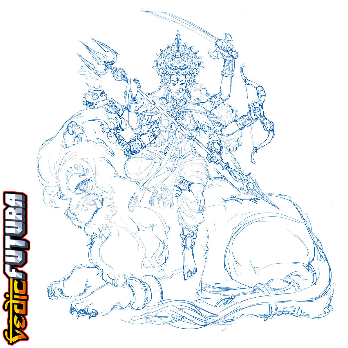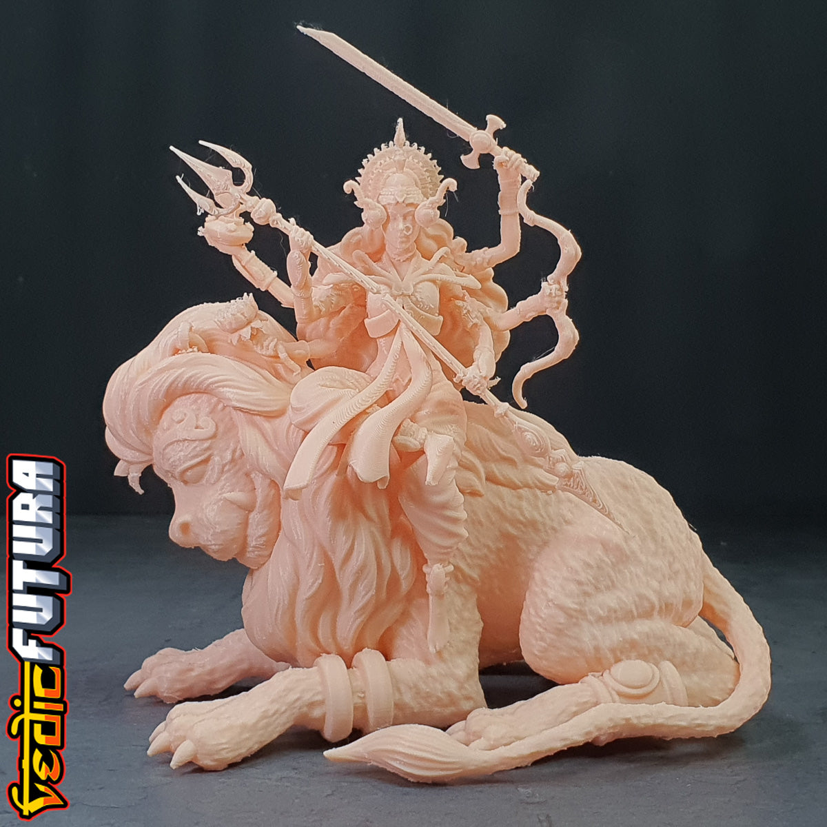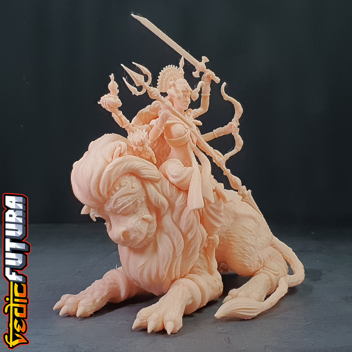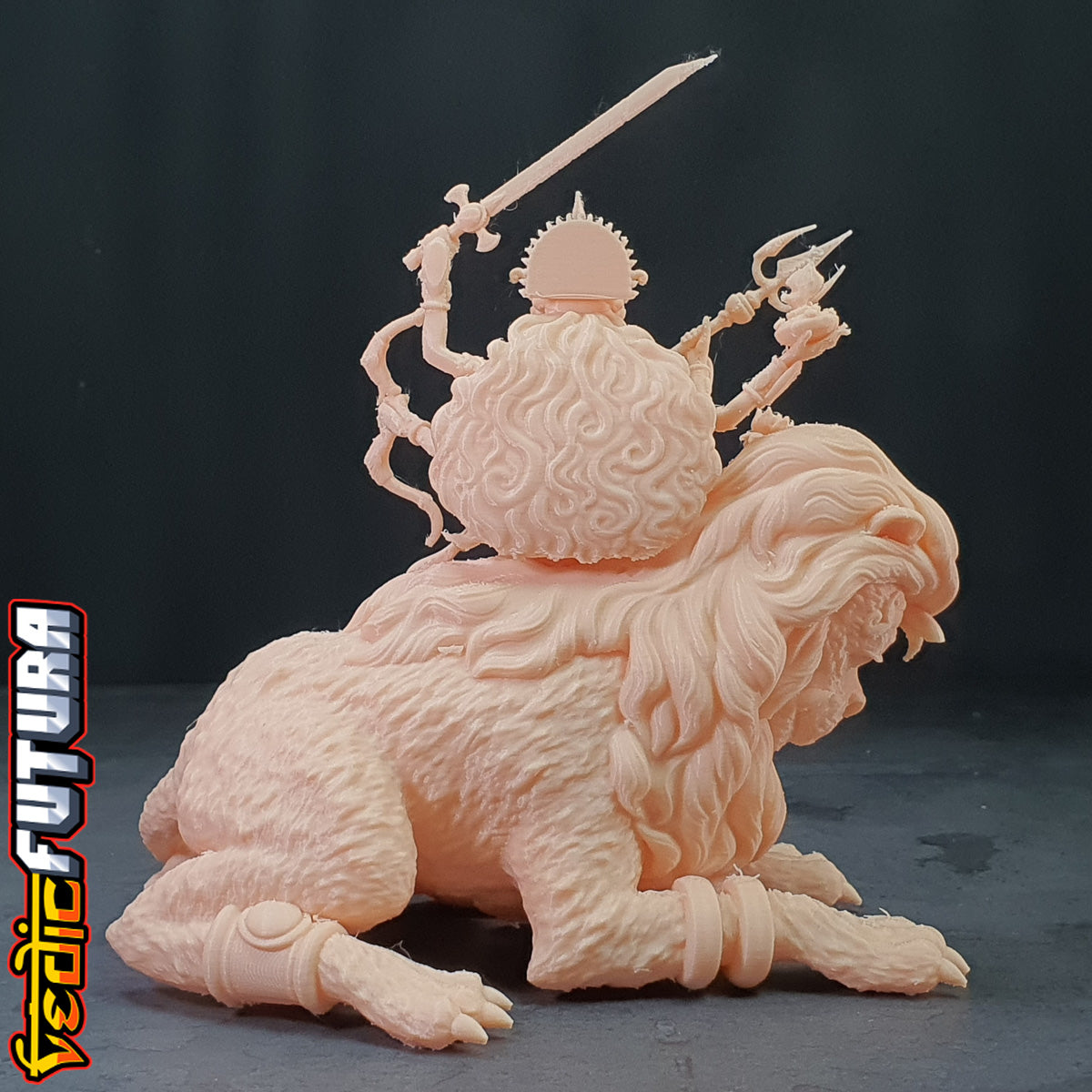 Considered as the feminine epitome of strength, Durga is depicted in a variety of Vedic literature as a goddess having feminine prowess, power, determination, wisdom. When the three Supreme Gods, Brahma, Vishnu and Shiva were unable to overcome the demon Mahishasura, they decided to combine their powers and created Durga. Embodying their collective energy (shakti), she is both derivative from the male divinities and the true source of their inner power. The ten arms of the deity symbolize that she protects her devotees from all directions namely the eight corners and from the sky and the earth. The ten hands of Goddess Durga hold in them a conch, discus, lotus, sword, bow with arrow, trishul, mace, thunderbolt, snake and flame. The lion of Mother Durga is a symbol of “Dharma”. It represents power, will and determination. Mother Durga riding the lion symbolizes her mastery over all these qualities.