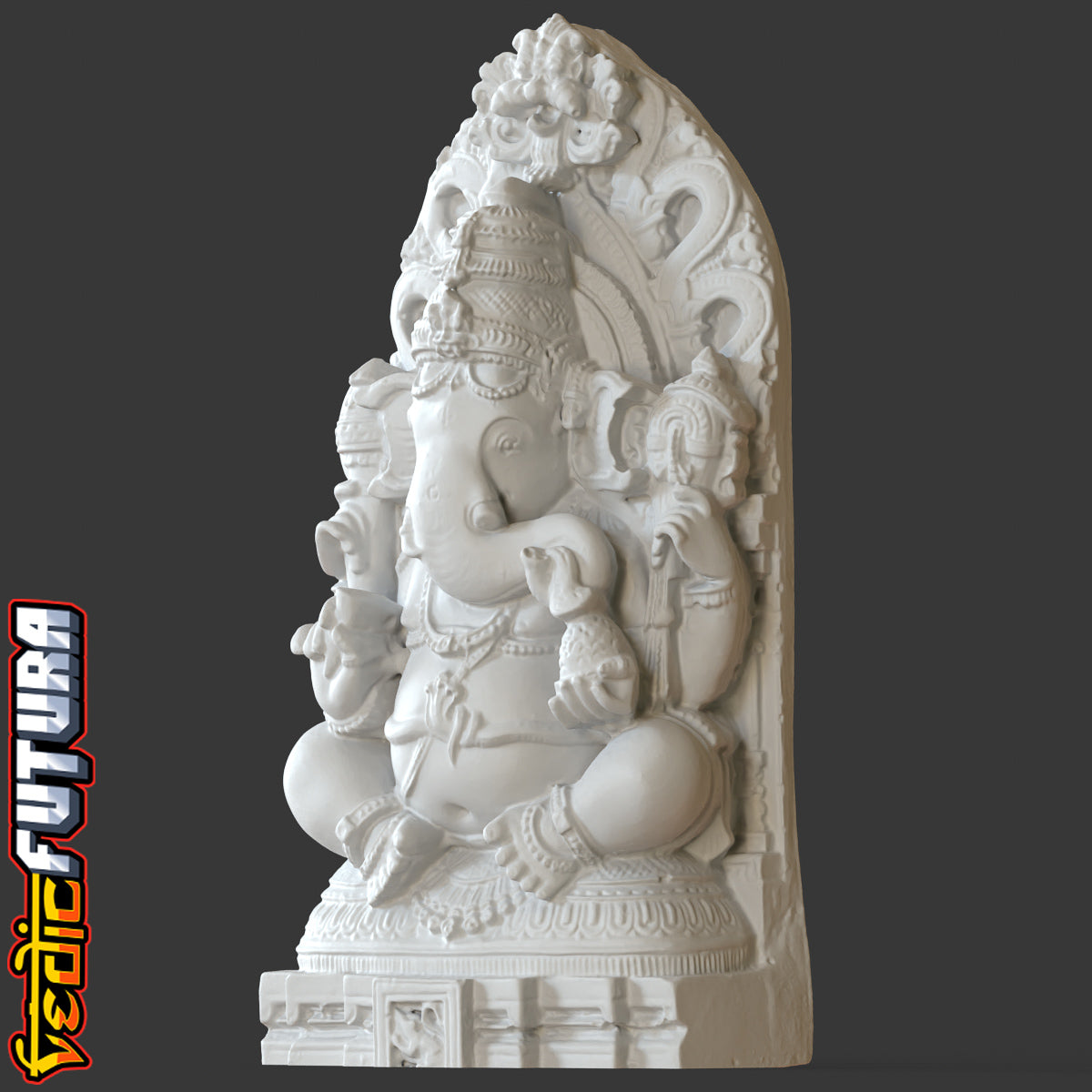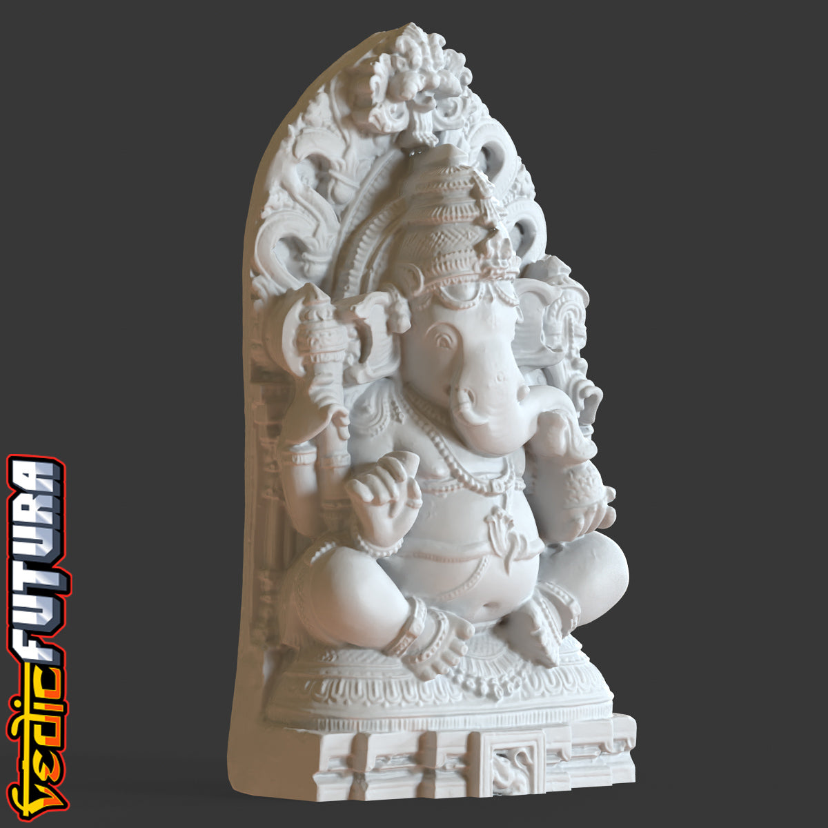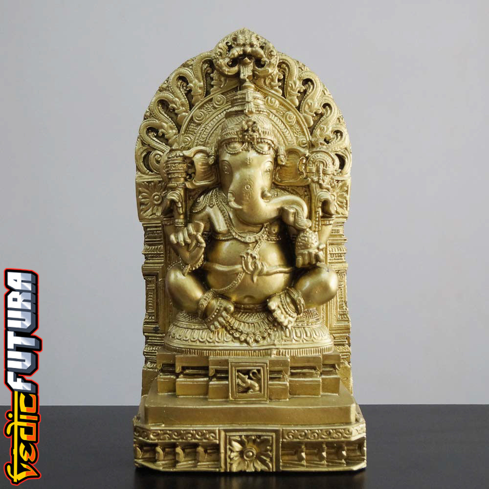This beautiful gold Ganesha carving shows all of his characteristic traits. Depicted with four hands, one holding a goad, a tool used to prod and guide animals. This hand symbolizes his ability to guide and direct his followers on the right path. Another hand holds a noose, which represents the god's power to bind and control negative forces. The third hand is holding a sweet dish, which is a symbol of the sweetness of spiritual attainment and the fourth hand holds a broken tusk, which represents the god's willingness to sacrifice for the attainment of wisdom. The statue features Ganesha with a big belly, which is believed to symbolize his ability to consume and overcome obstacles and negative energy. The serpent tied around his big belly is a symbol of his mastery over the material world and his ability to control the forces of nature.