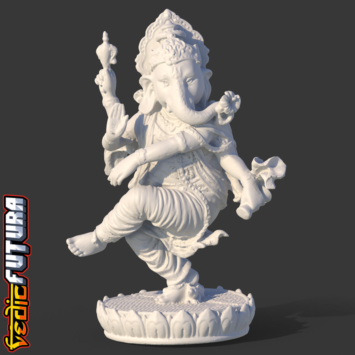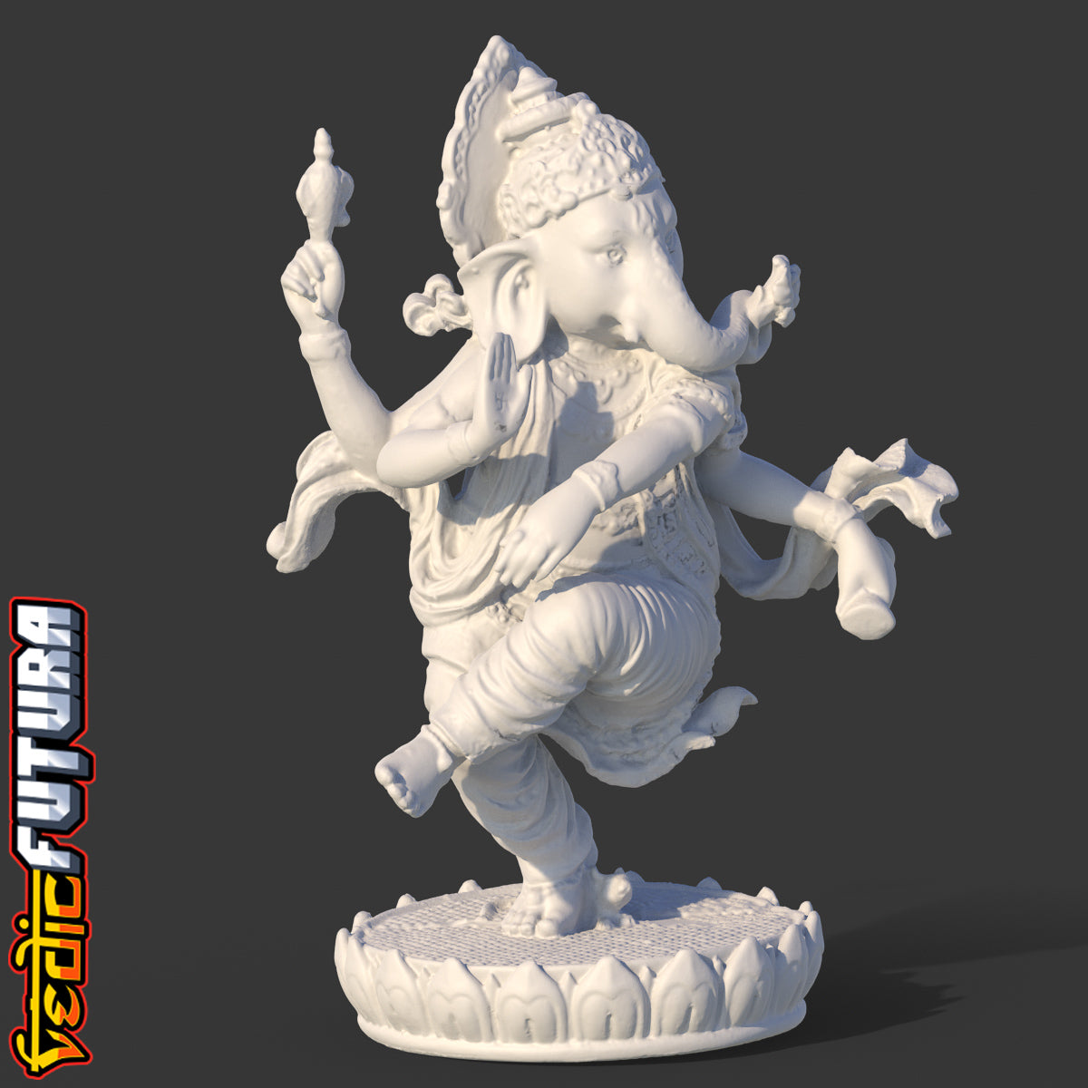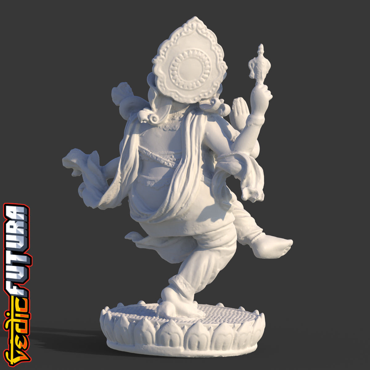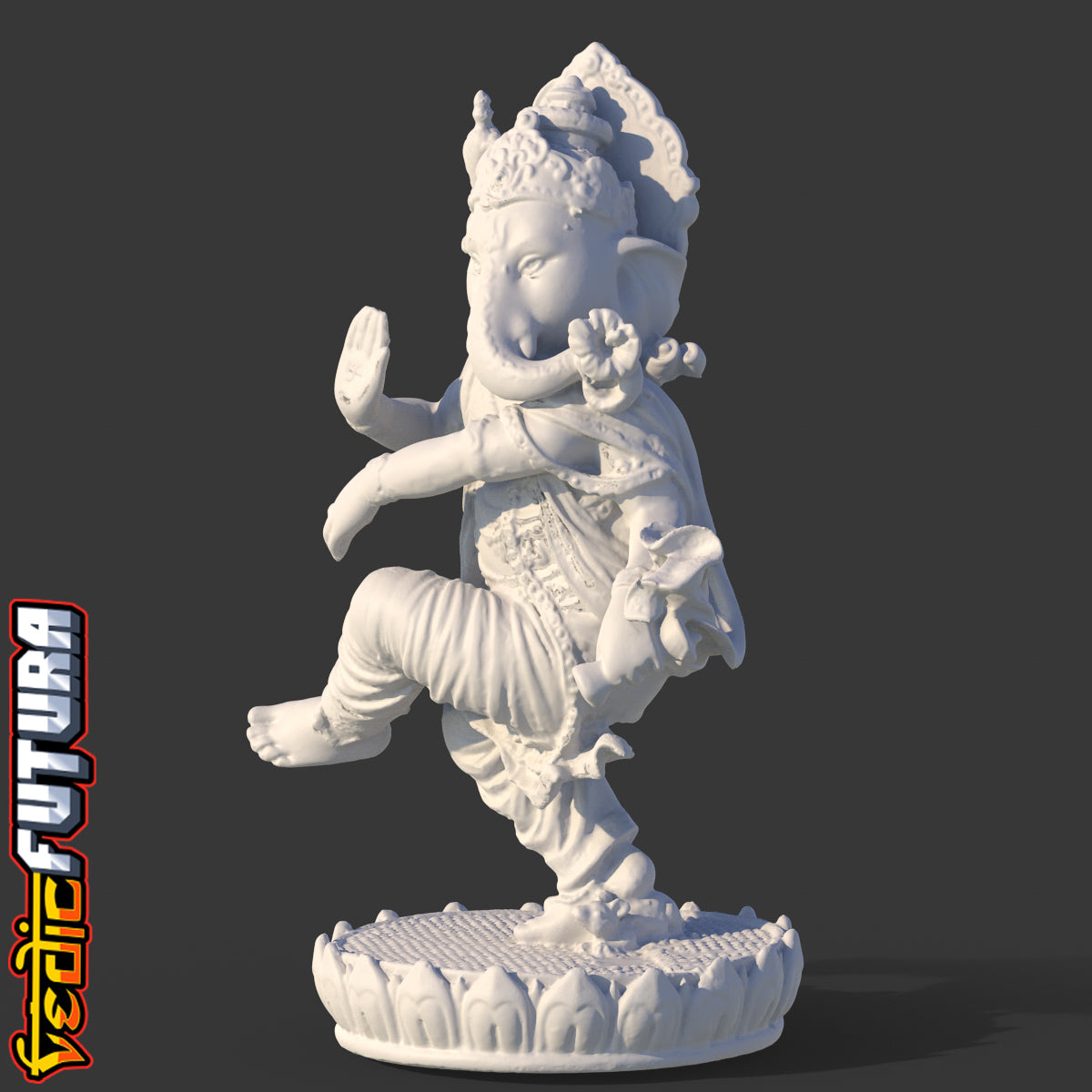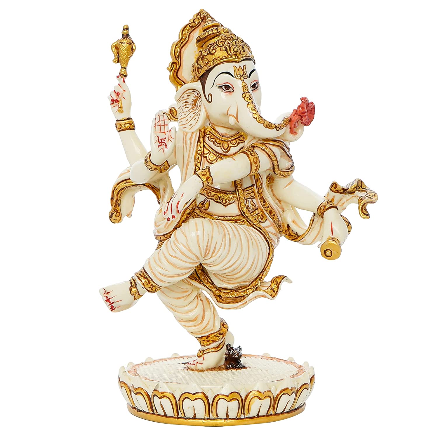 This captivating sculpture captures Lord Ganesha in a unique and dynamic pose, reminiscent of the Nataraja, the cosmic dance form of Lord Shiva. He is adorned with ornate jewellery and wears a detailed crown, both accentuated with gold embellishments. His trunk tenderly holds a blooming lotus while his other hands hold a dumroo (a drum) and goad. A juxtaposition of elements from Shiva and Ganesha.The pose adopted by Ganesha is evocative of the Nataraja, a form of Lord Shiva representing his dance of destruction and creation in the universe. This dance is symbolic of the cyclic nature of creation, preservation, and dissolution in the cosmos. In this sculpture, Ganesha's raised leg and the flow of his lower garment emulate the dynamic movement of the dance. The placement of his feet and the lifted arms contribute to the rhythmic essence of the pose.