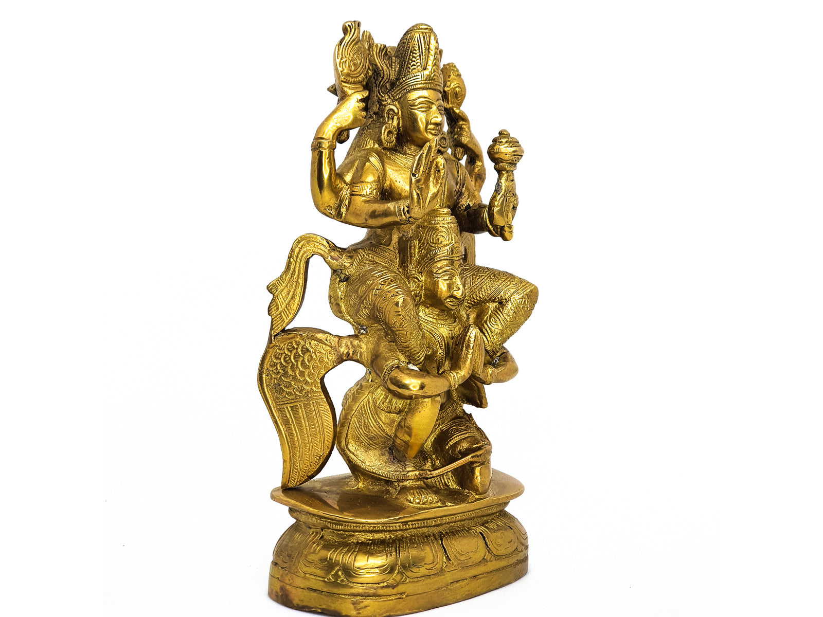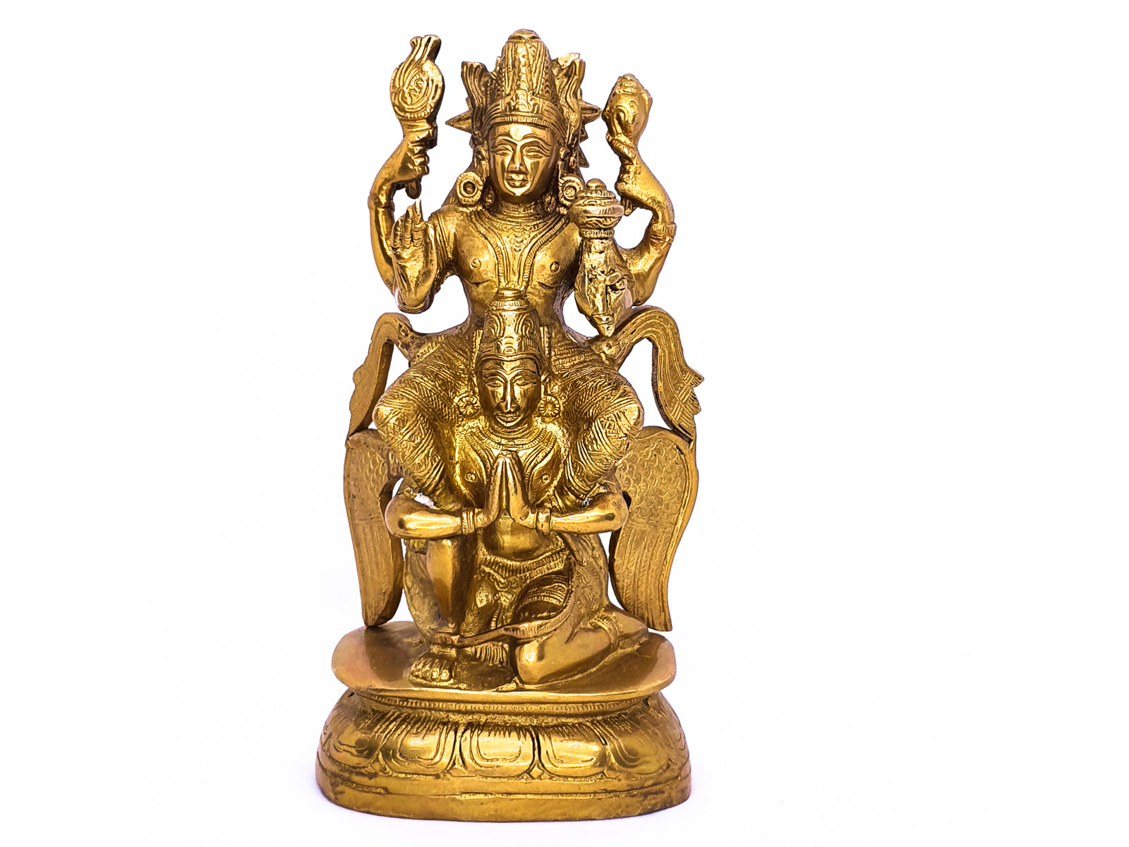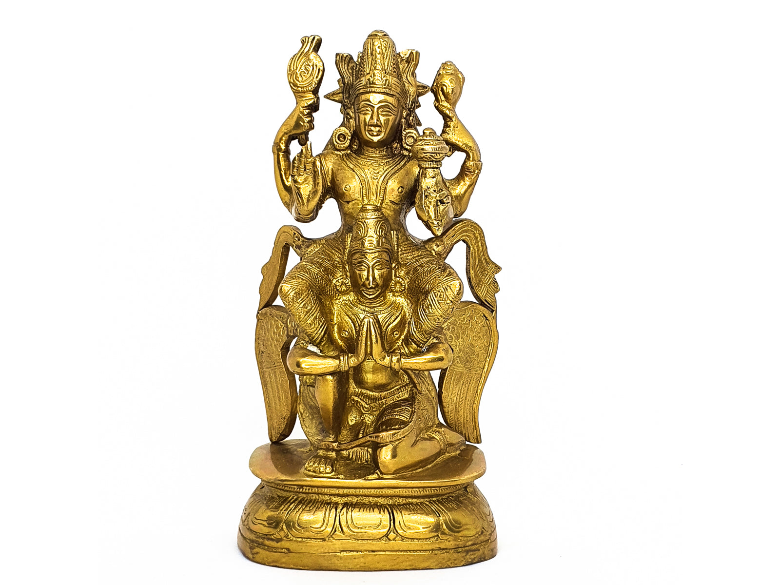 Garuda, in Hindu mythology, the bird (a kite or an eagle) and the vahana (mount) of the god Vishnu. Seen here in a classic pose carrying Vishnu, with his hands in anjali