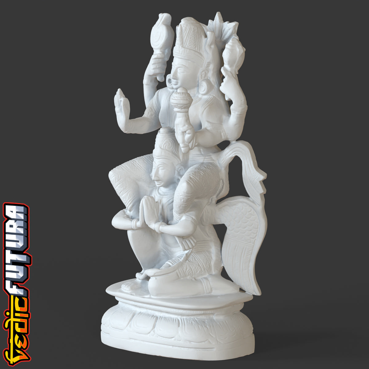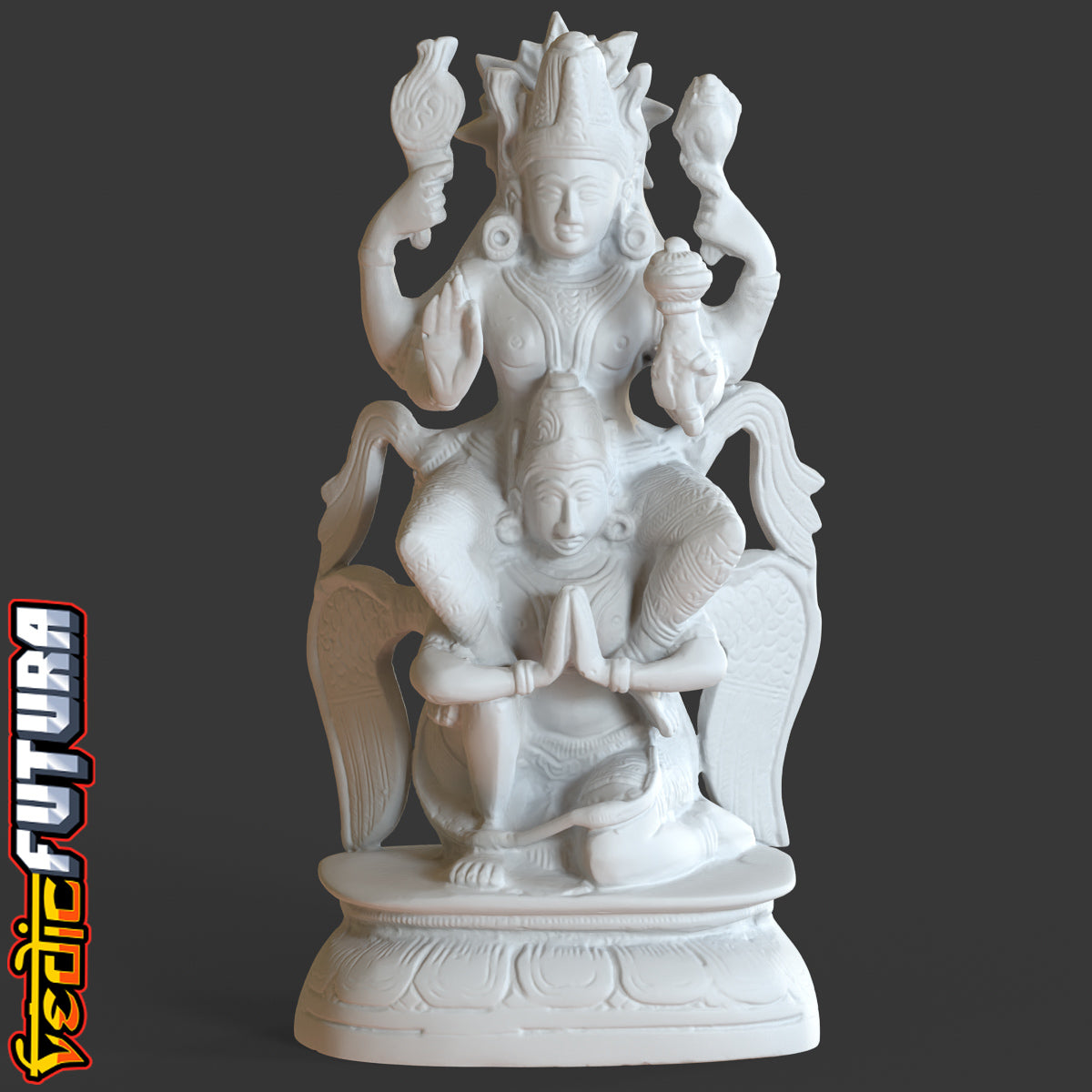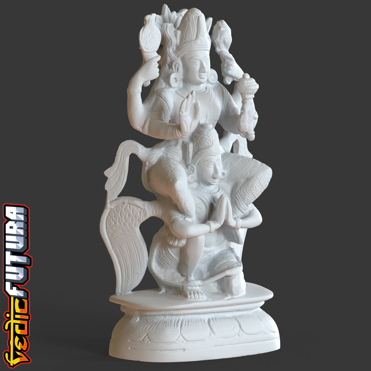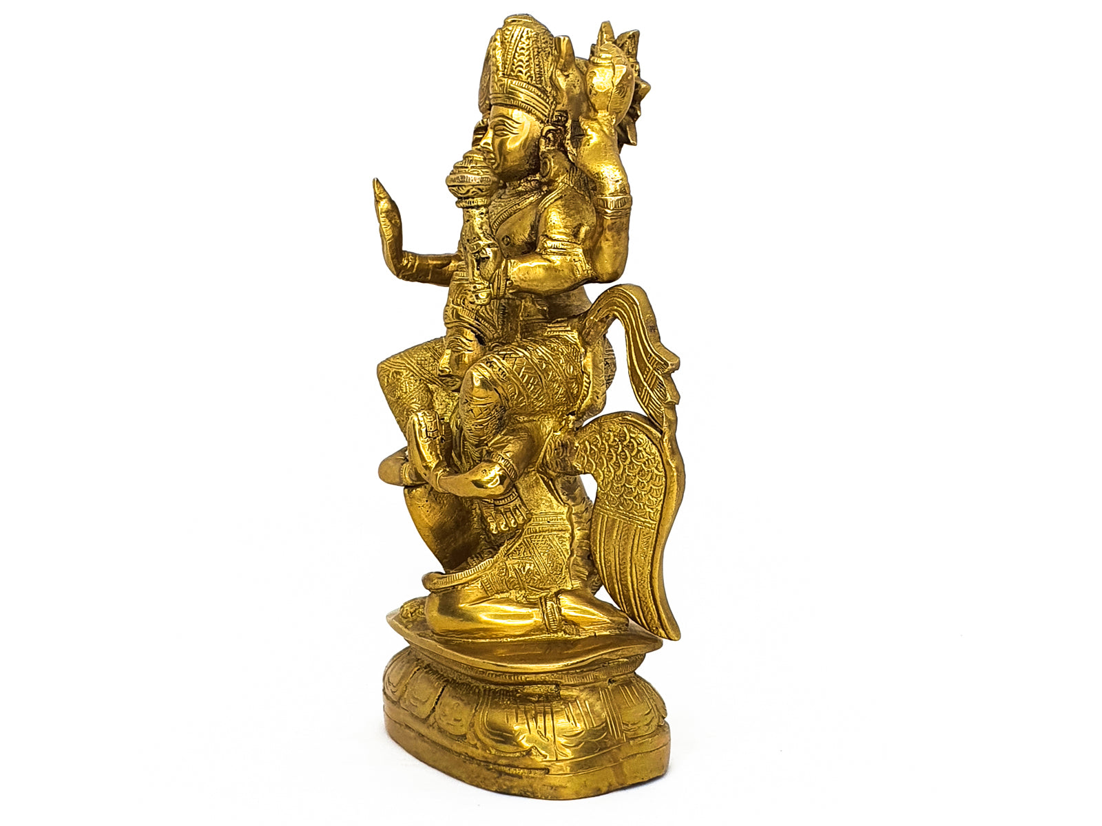 Garuda, in Hindu mythology, the bird (a kite or an eagle) and the vahana (mount) of the god Vishnu. Seen here in a classic pose carrying Vishnu, with his hands in anjali