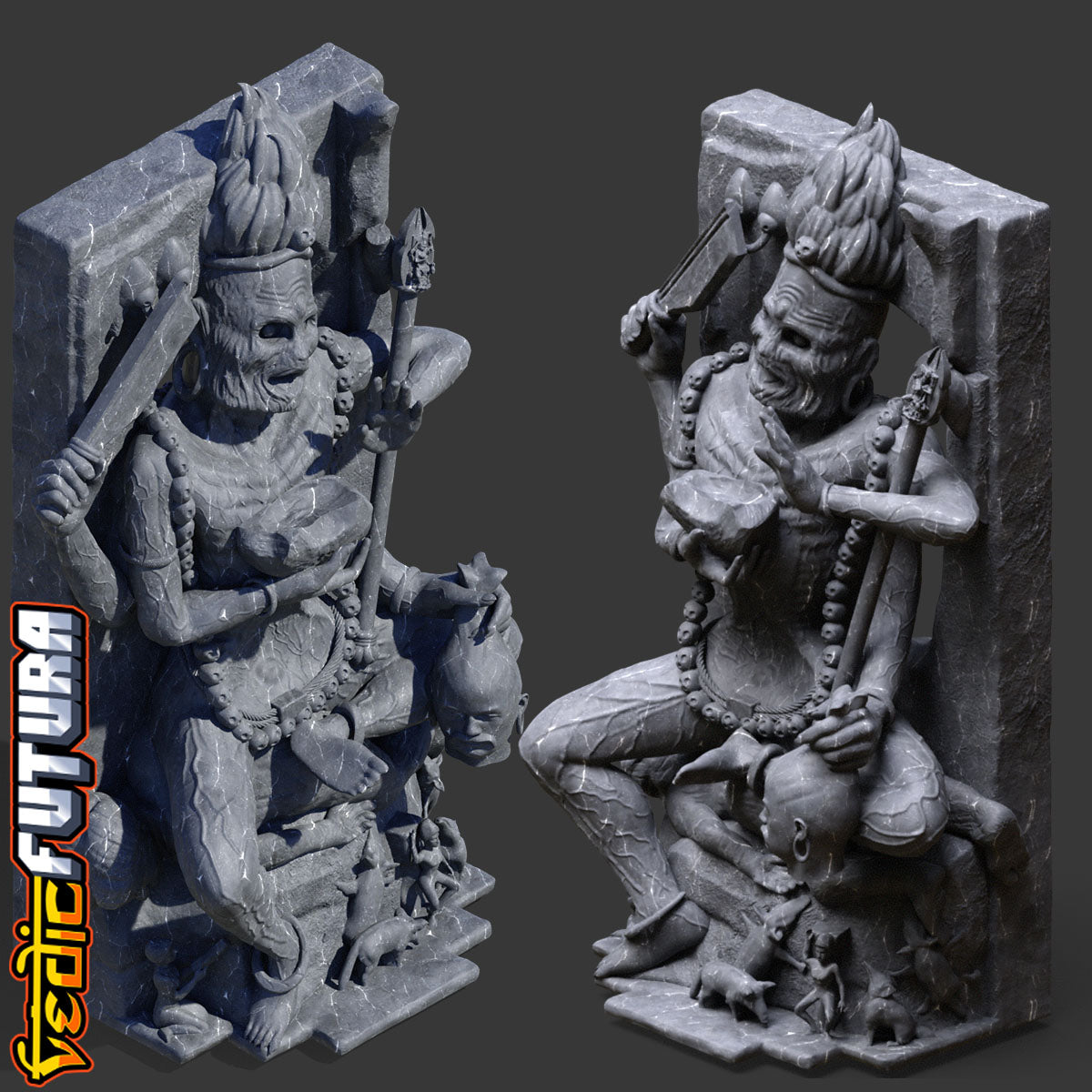 This 8th-century sculpture of Goddess Chamunda captures her in her terrifying and skeletal form, embodying the fierce energies of death and destruction. Closely associated with Kali, Chamunda is depicted with sunken eyes, a skeletal frame, and a garland of skulls, emphasizing her role as a force against unrighteousness. She wears a jatamukut (crown of matted hair) entwined with a serpent, signifying her untamed, primal power. Holding a bowl of blood, Chamunda embodies the aspect of Devi that slays demons like Chanda and Munda, serving as a protector of dharma and cosmic balance.