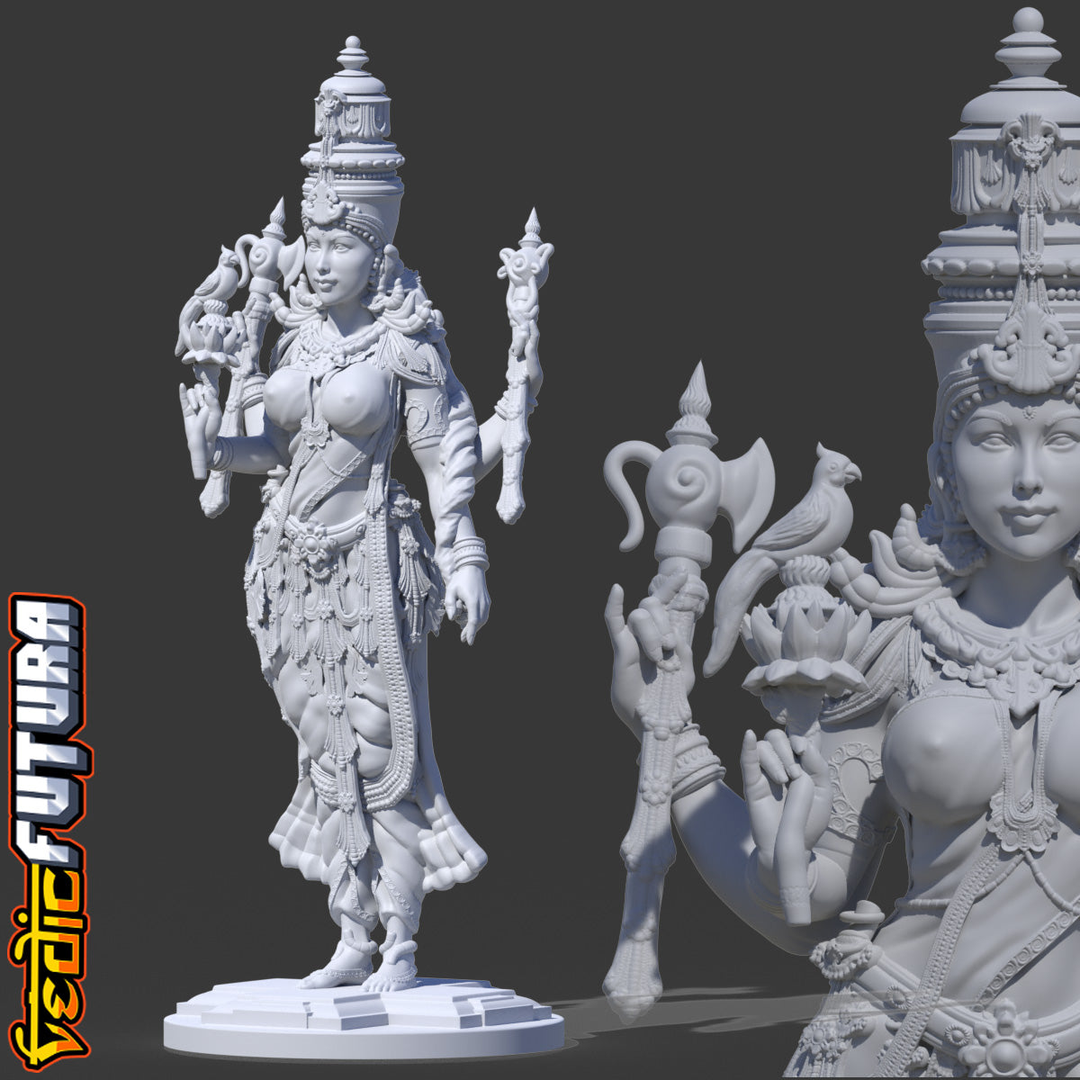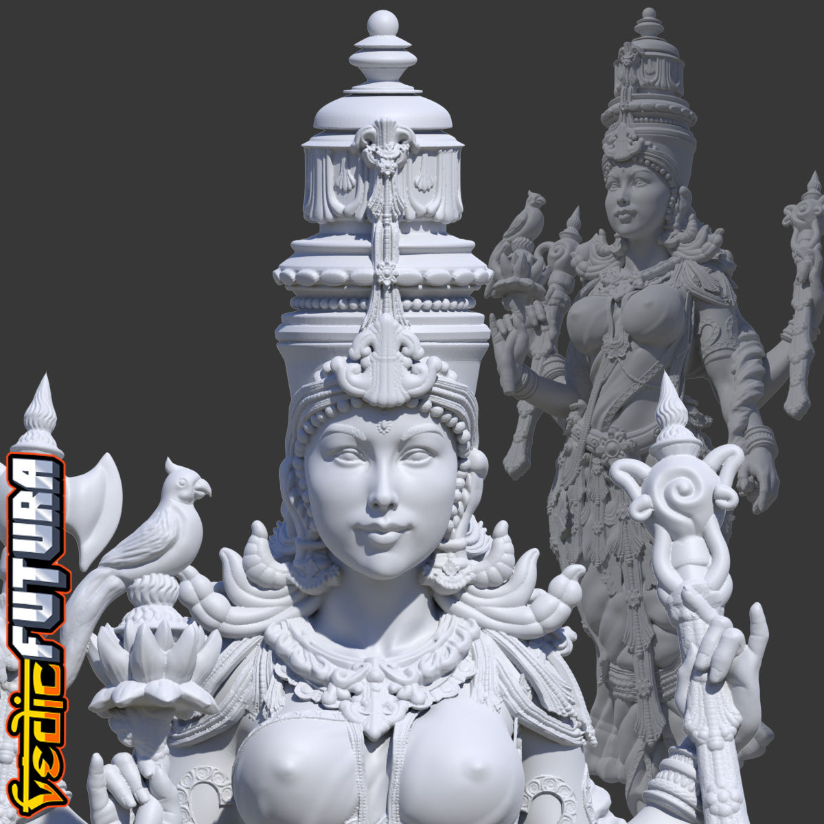This stunning representation of Goddess Meenakshi, a central figure in Tamil Hindu culture and mythology, captures the essence of divine femininity and regal authority. The sculpture portrays Meenakshi with four arms, a hallmark of her divine status, each hand holding symbolic attributes that emphasize her multifaceted roles: governance, prosperity, and spiritual enlightenment. Her right hands gracefully hold a lotus, a symbol of purity and spiritual power, and a parrot, which is not merely ornamental but signifies her deep connection to the arts, particularly music and dance. This parrot, associated with the Goddess Raja Mathangi or Raja Shyamala, is considered her celestial partner, embodying the transmission of knowledge across the 64 classical arts.