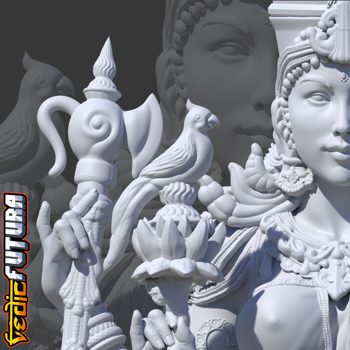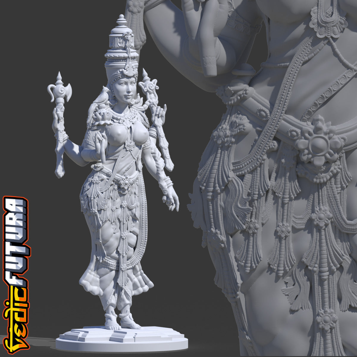 Artistically, the sculpture is a marvel of detailed craftsmanship, mirroring the richly decorated form of the goddess as described in mythological texts. Her attire, an intricately designed saree adorned with heavenly motifs and an array of jewelry, from heavy necklaces to ornate armlets and crowns, reflects the zenith of royal Dravidian fashion. The divine architecture of her form, symmetrical and balanced, suggests her role as Shiva's consort, embodying ideal beauty and moral virtue.