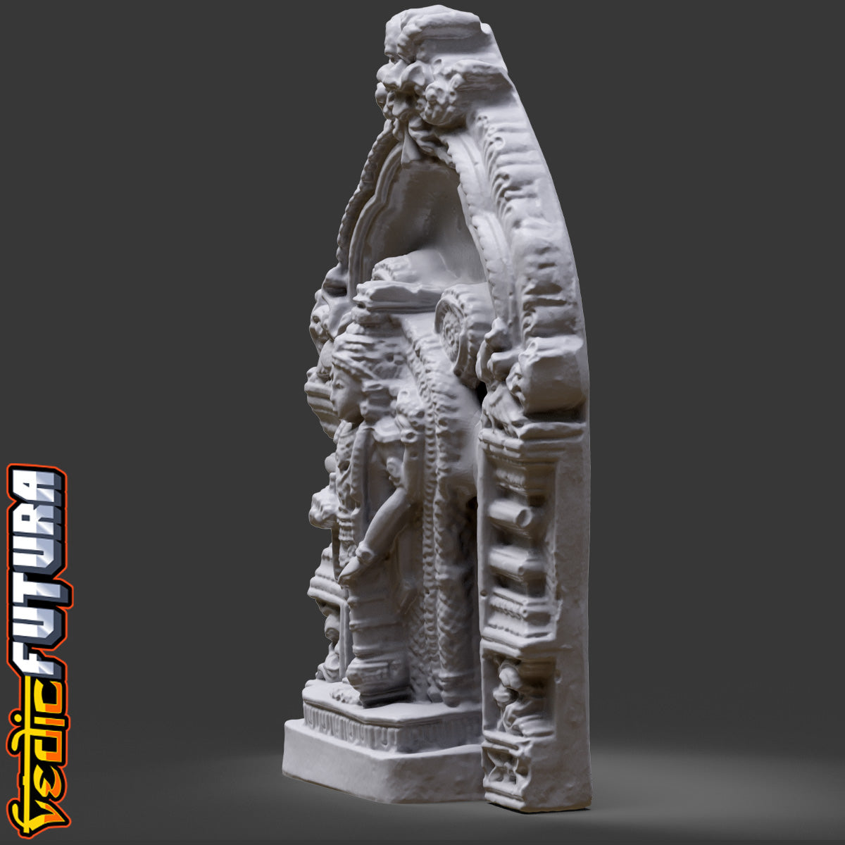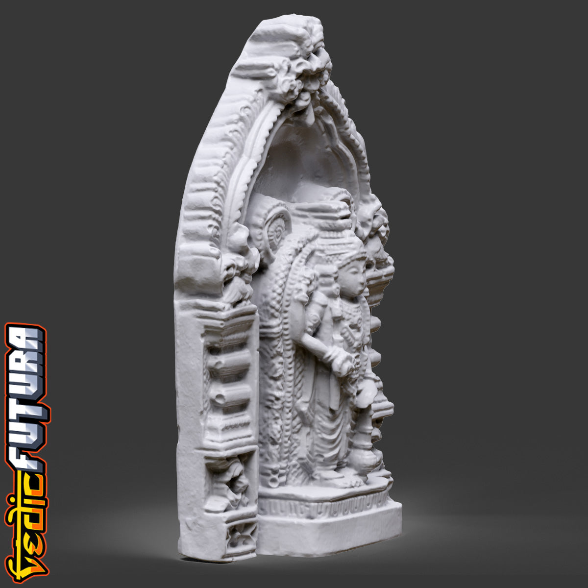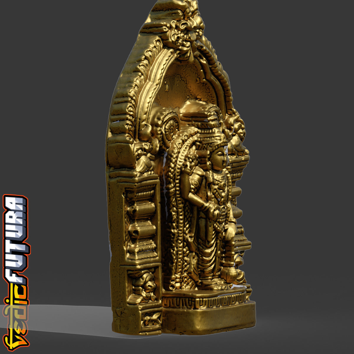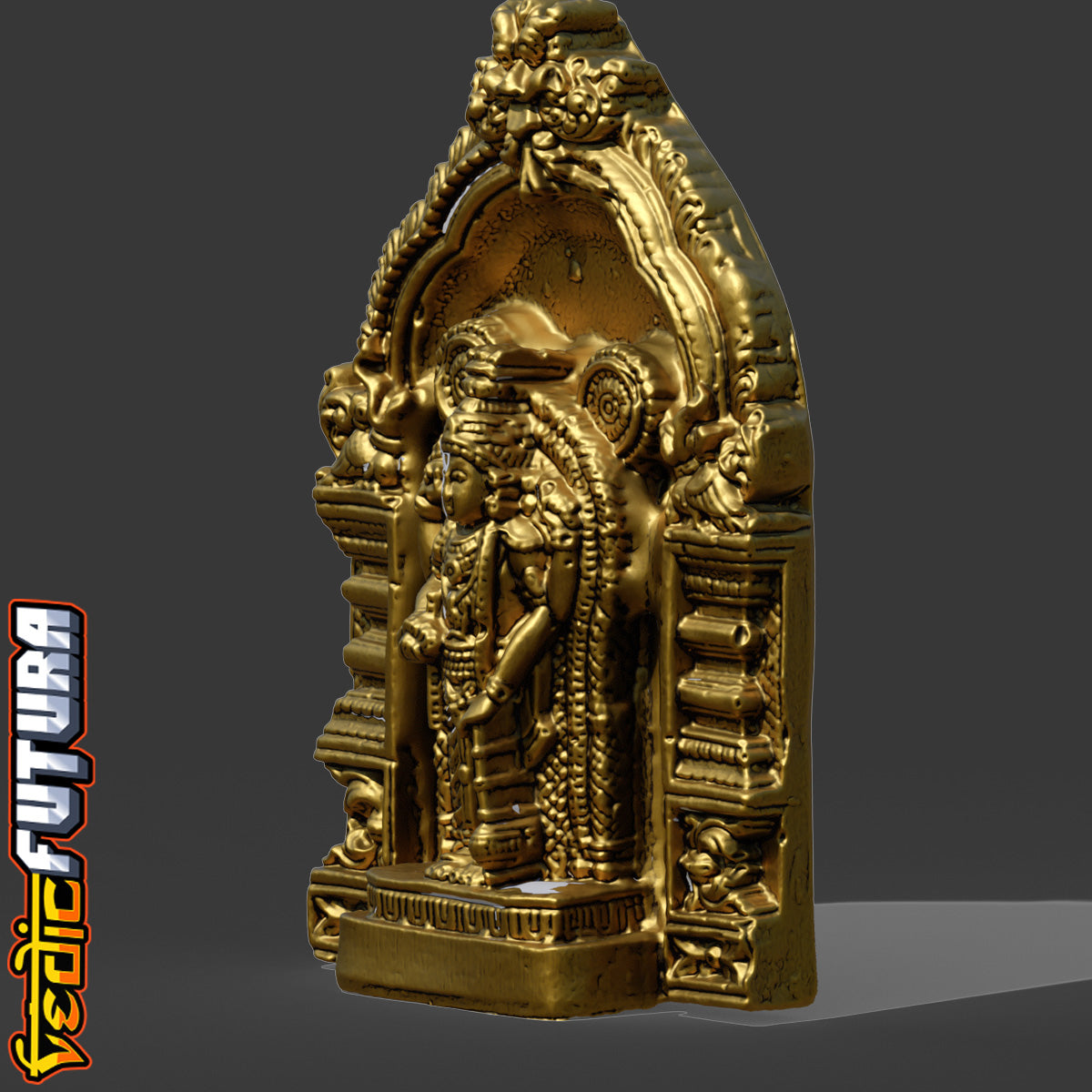 This is a finely detailed representation of Guruvayurappan, a revered form of Lord Krishna worshipped in the famous Guruvayur Temple of Kerala. Modeled in the classical Chola or Kerala temple style, this 3D sculpture depicts the deity standing within a traditional shrine alcove (shrikovil), with rich ornamental work and elaborate prabhavali (halo) framing the figure.