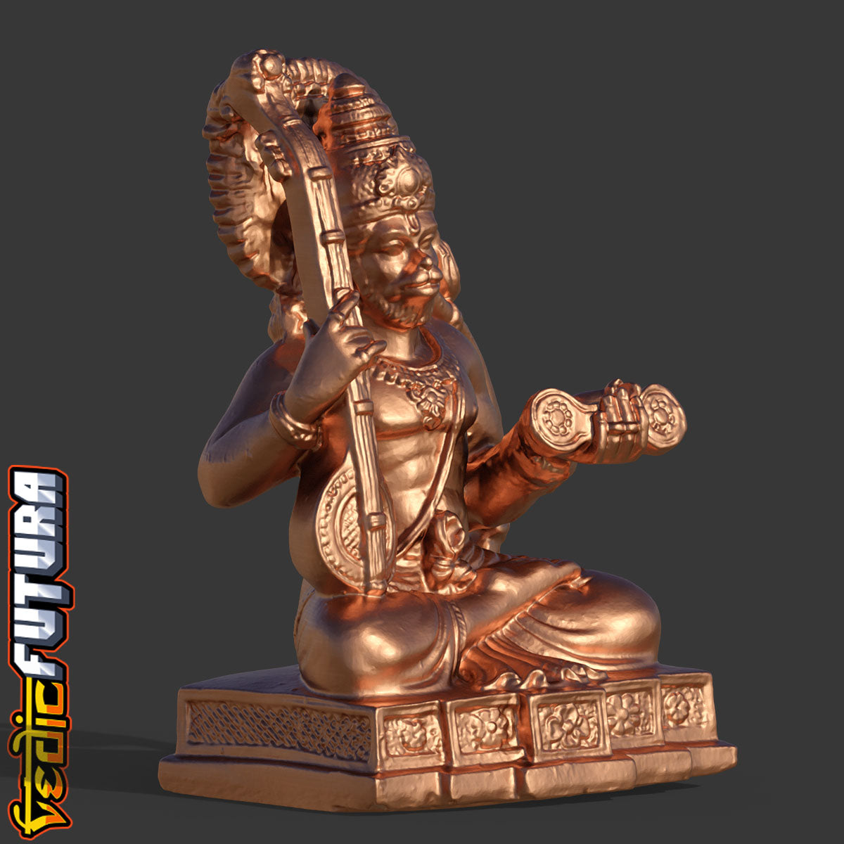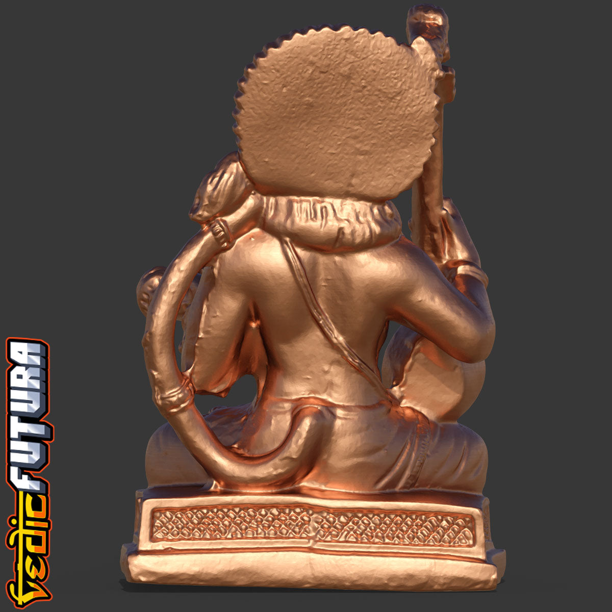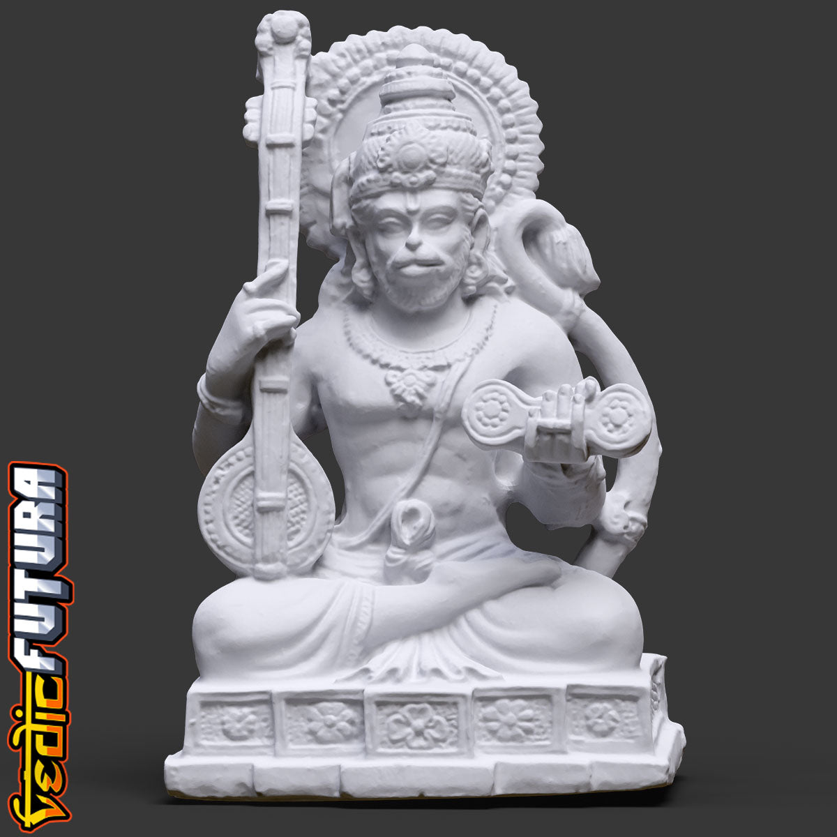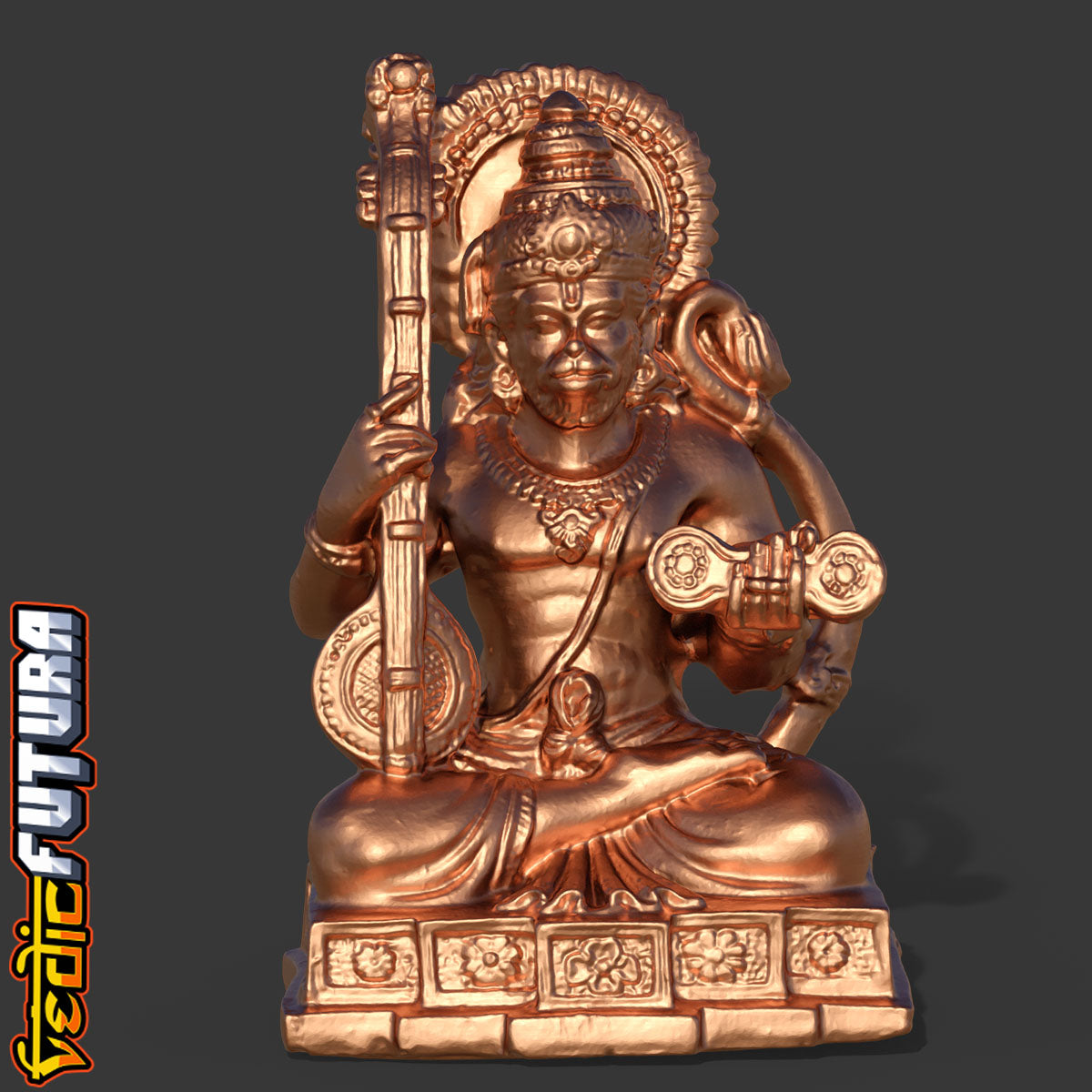 This unique statue presents Lord Hanuman as a divine musician, seated gracefully with a sitar and cymbal. Known for his loyalty and strength, Hanuman is depicted here expressing devotion through music, offering a rare glimpse into his contemplative and artistic side. His focused expression and gentle posture suggest deep reverence, emphasizing that devotion can be expressed through peaceful, creative acts alongside heroic deeds.