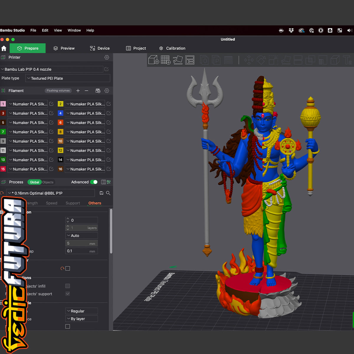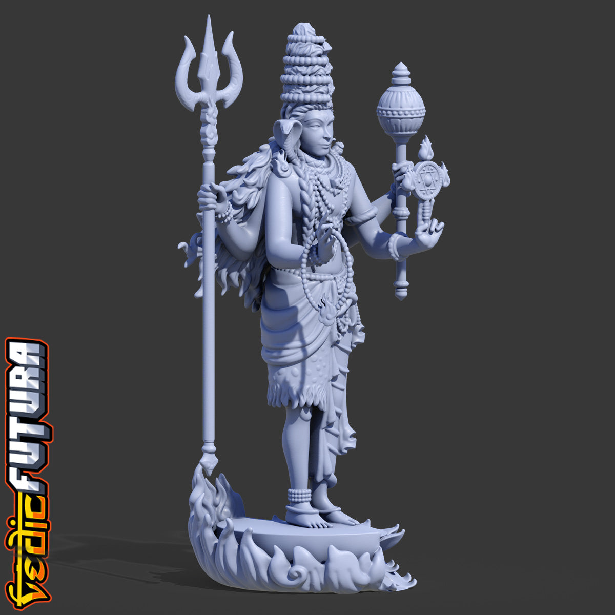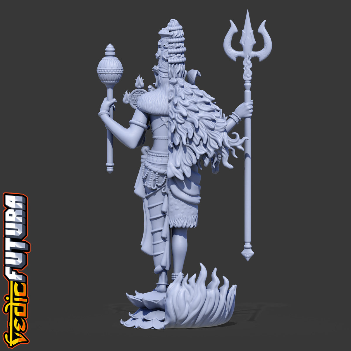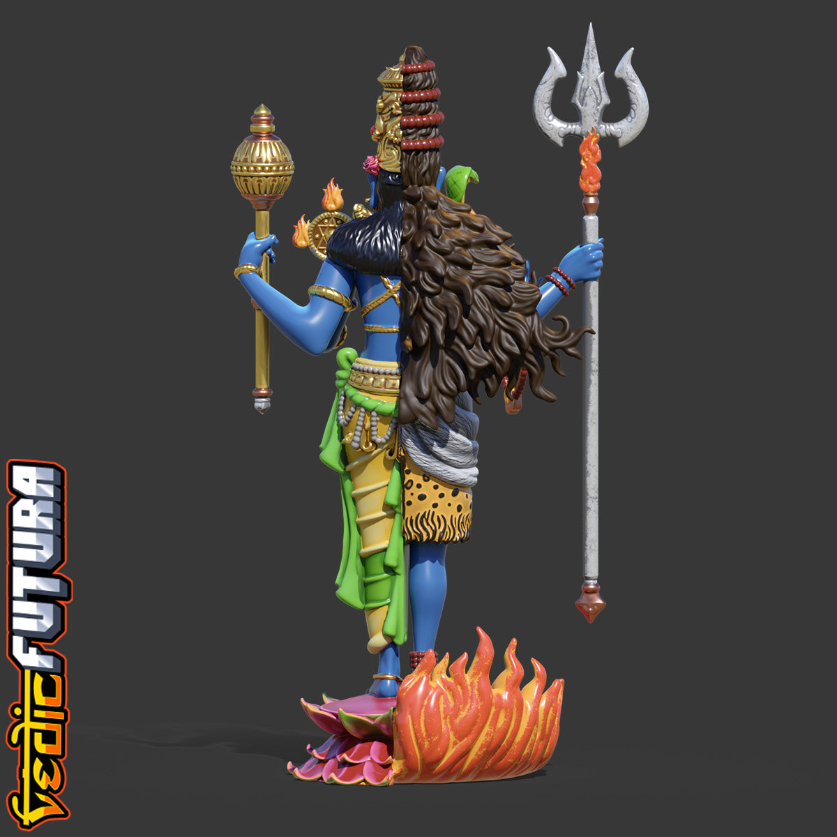 "This detailed 3D model portrays Hari Hara, the syncretic form combining Vishnu and Shiva—two principal deities of the Hindu pantheon—into a single harmonious figure. The left half depicts Shiva as the ascetic yogi, with matted locks, tiger skin, and holding the trishula. Serpents adorn his shoulders, and he stands upon a fiery pedestal.