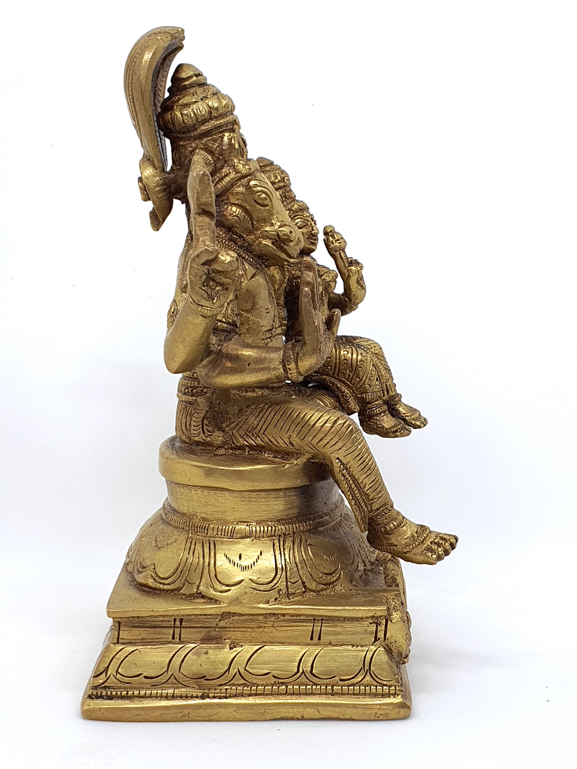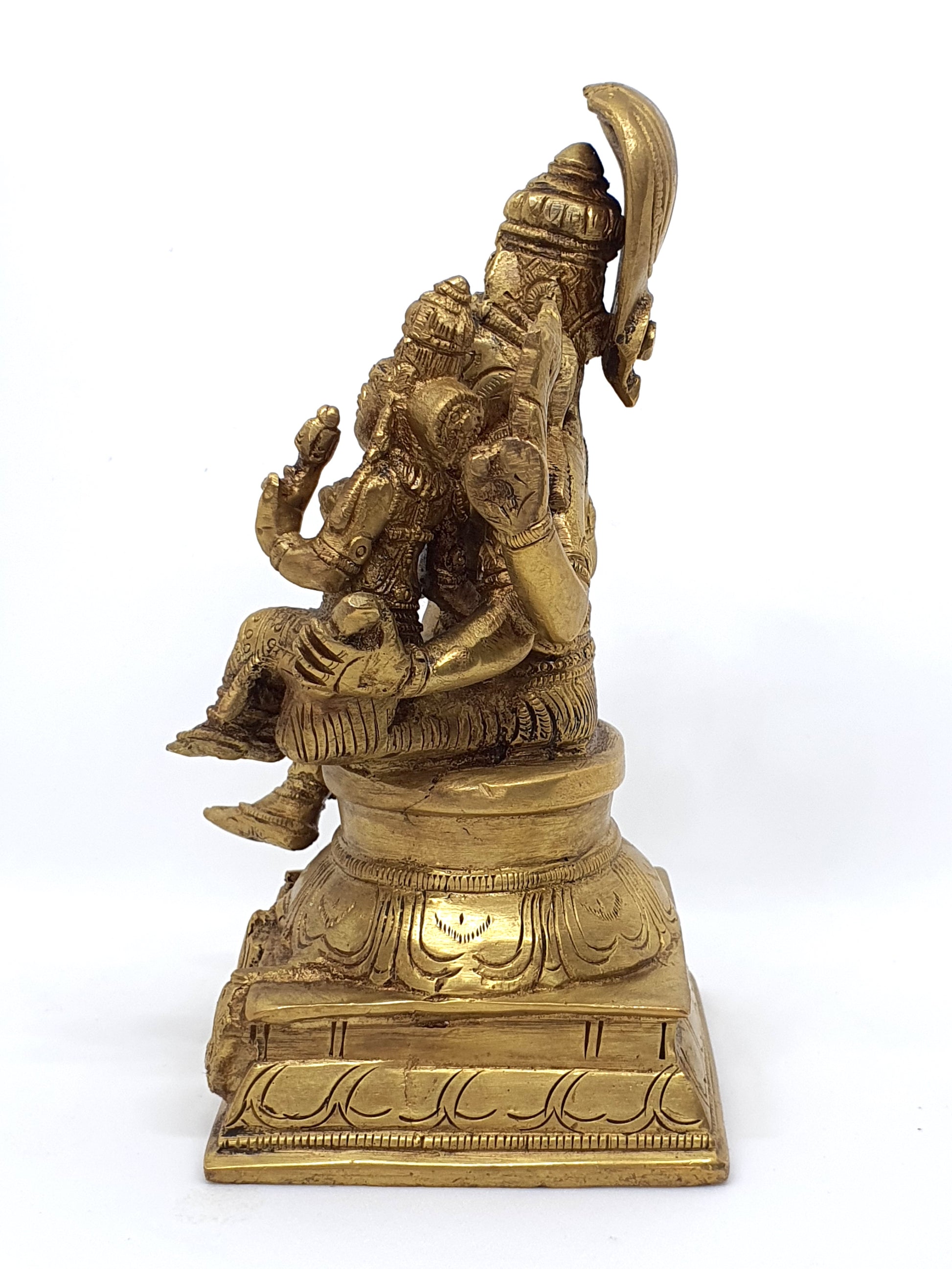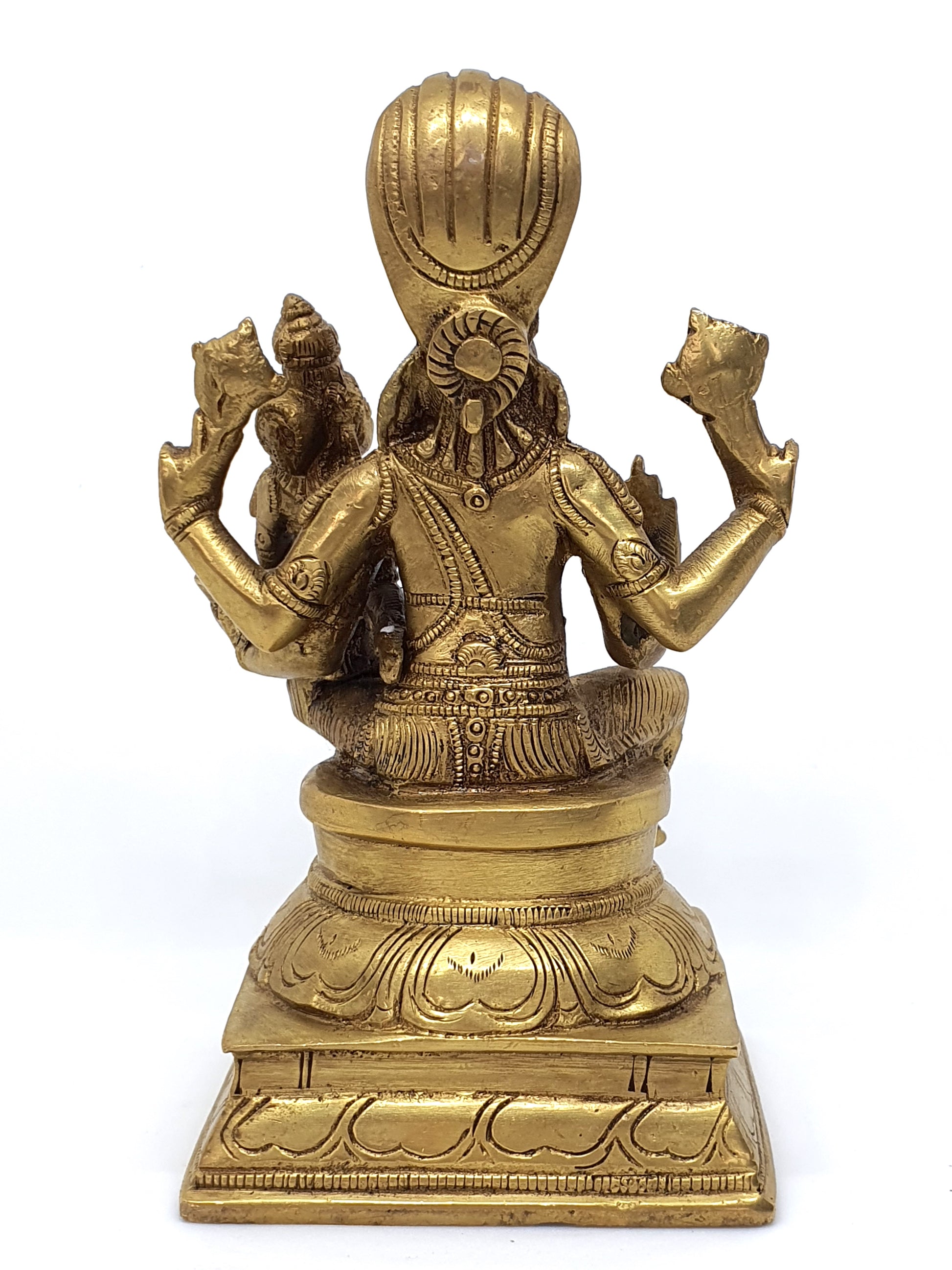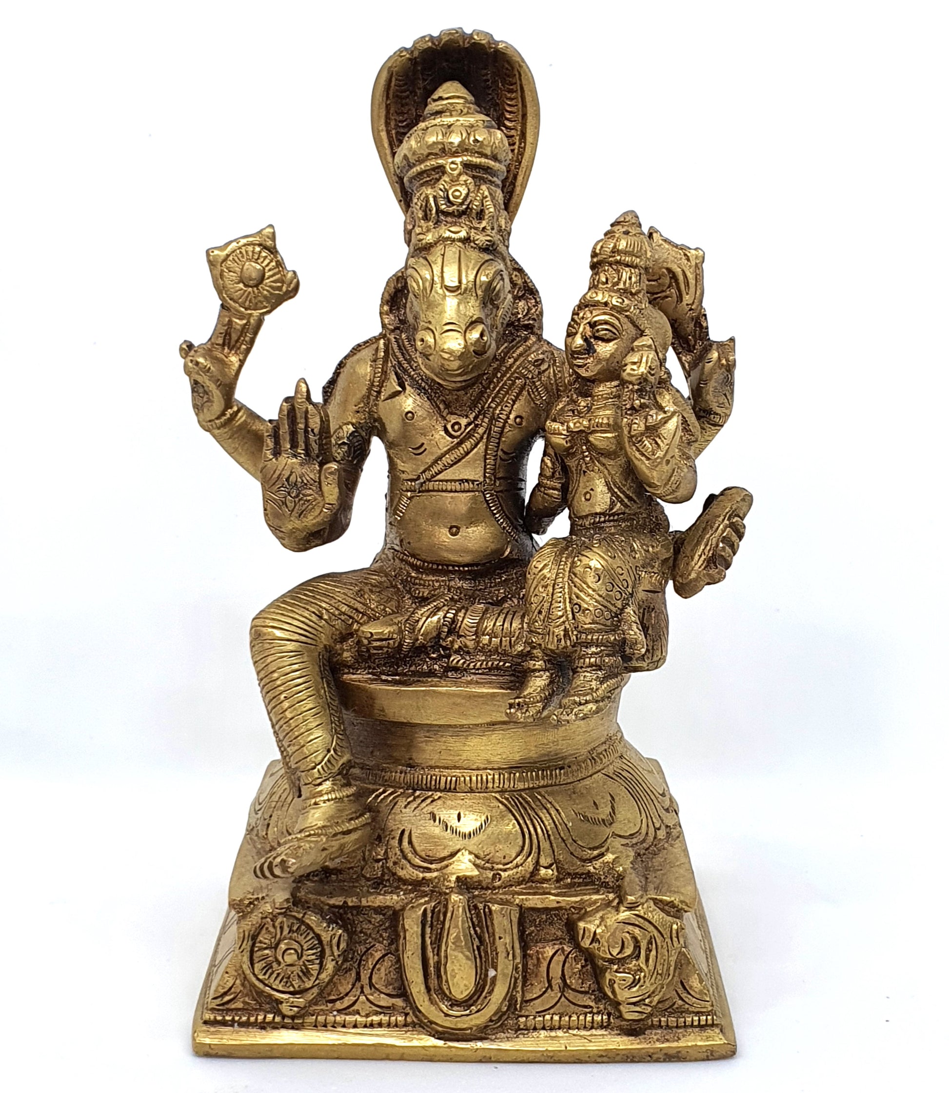 He has four hands, with one in the mode of bestowing knowledge; another holds books of wisdom, and the other two hold the Conch and Discus. He is considered the Guru of goddess Saraswati - the goddess of Knowledge. His blessings are sought when beginning study of both sacred and secular subjects. His face is always serene and peaceful, if not smiling. He is most commonly worshipped along with his consort Lakshmi, seen here sitting on his lap. This signifies the coming together of wisdom symbolised by Hayagriva and wealth symbolised by goddess Lakshmi. Lakshmi Hayagriva form combines wisdom and prosperity.