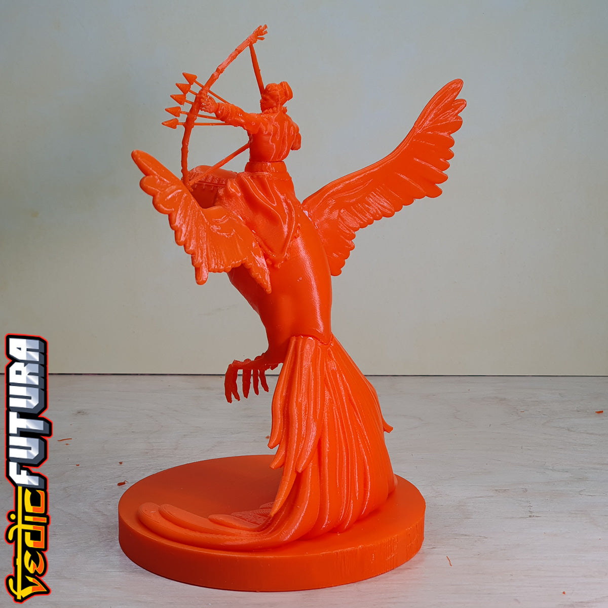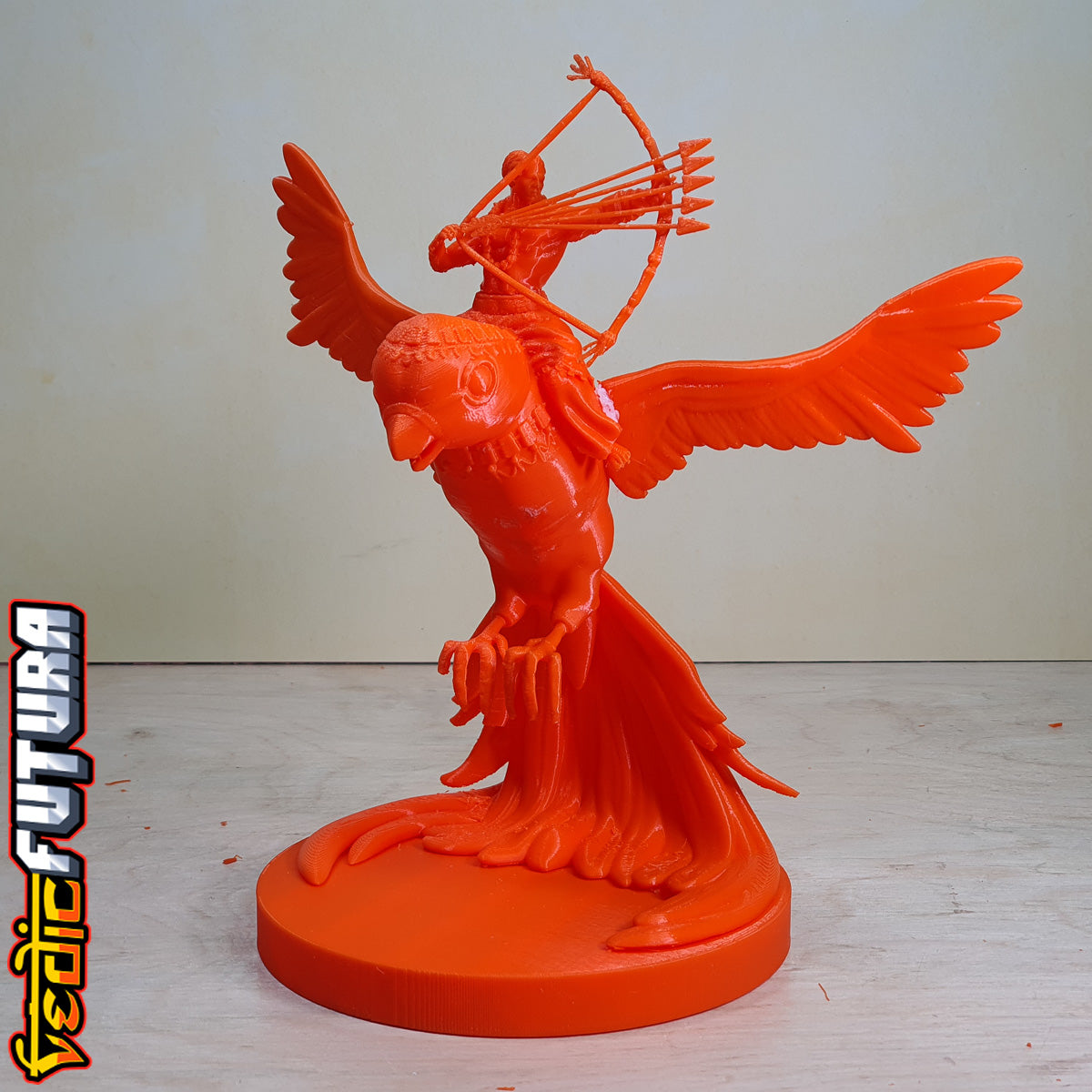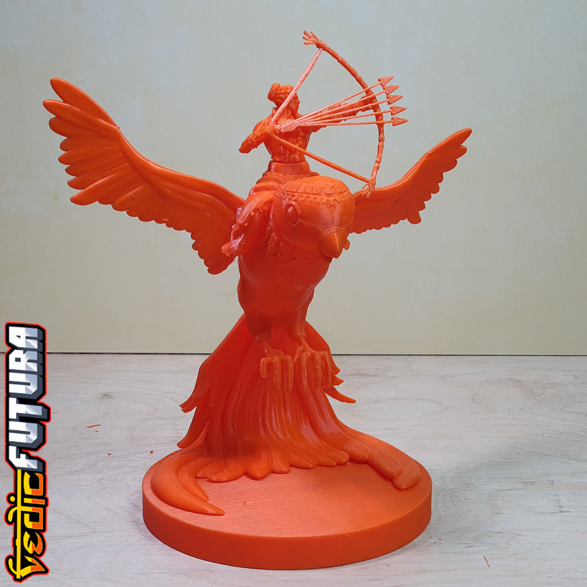 Kamdev is often depicted seated on a parrot, carrying a bow made of sugarcane stalk, strung by a line of bees.