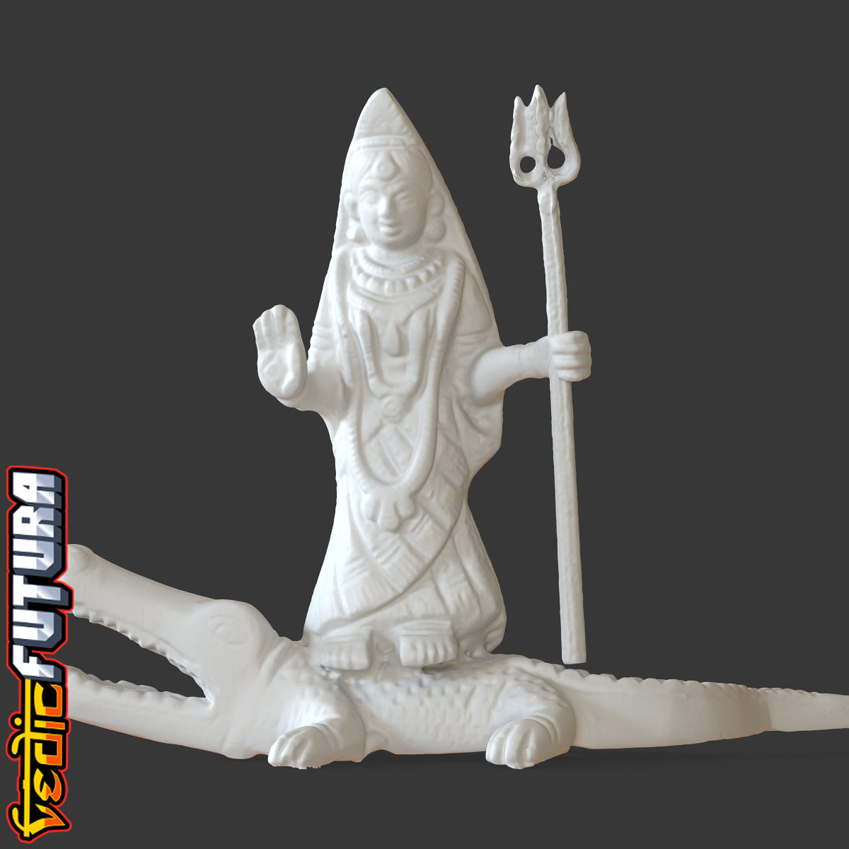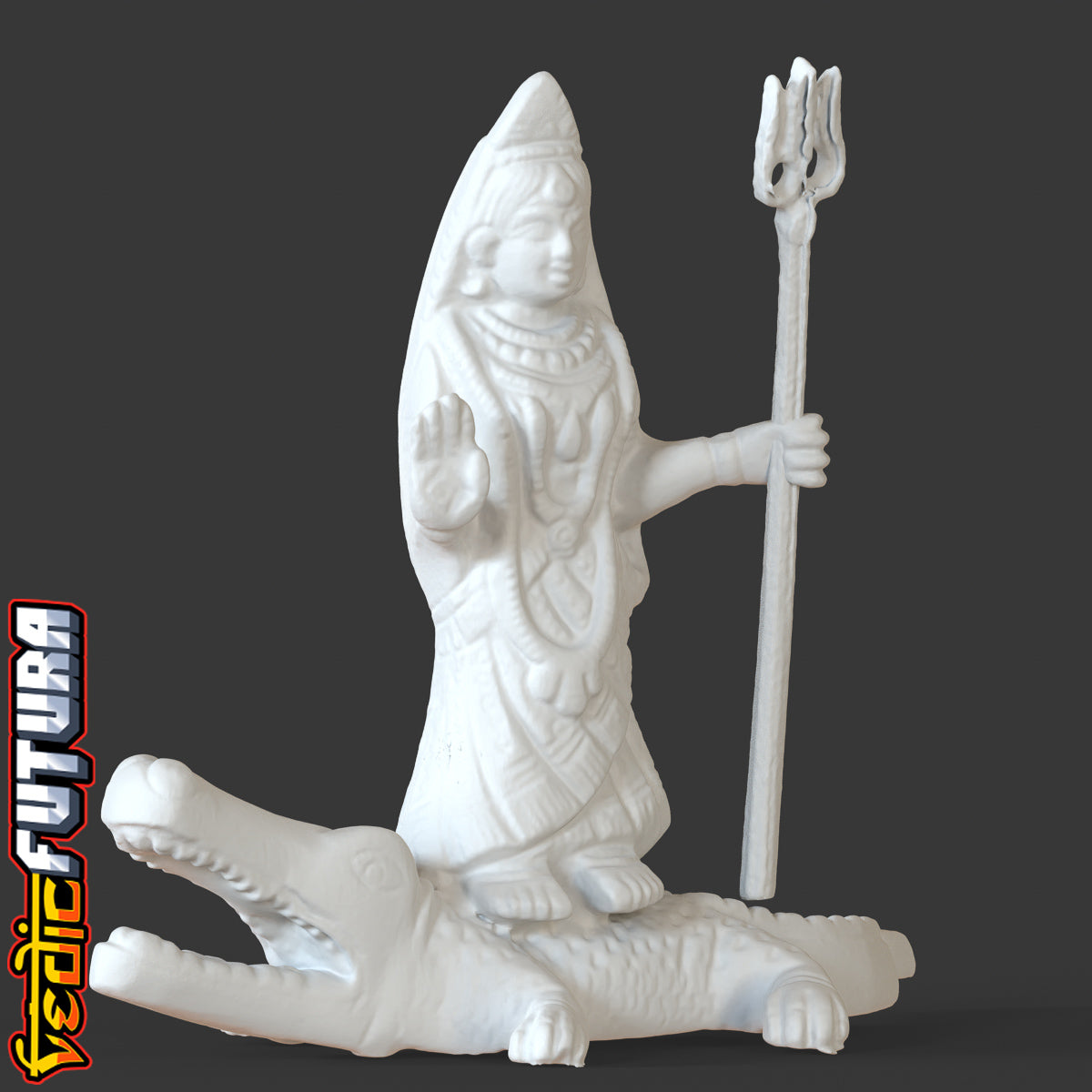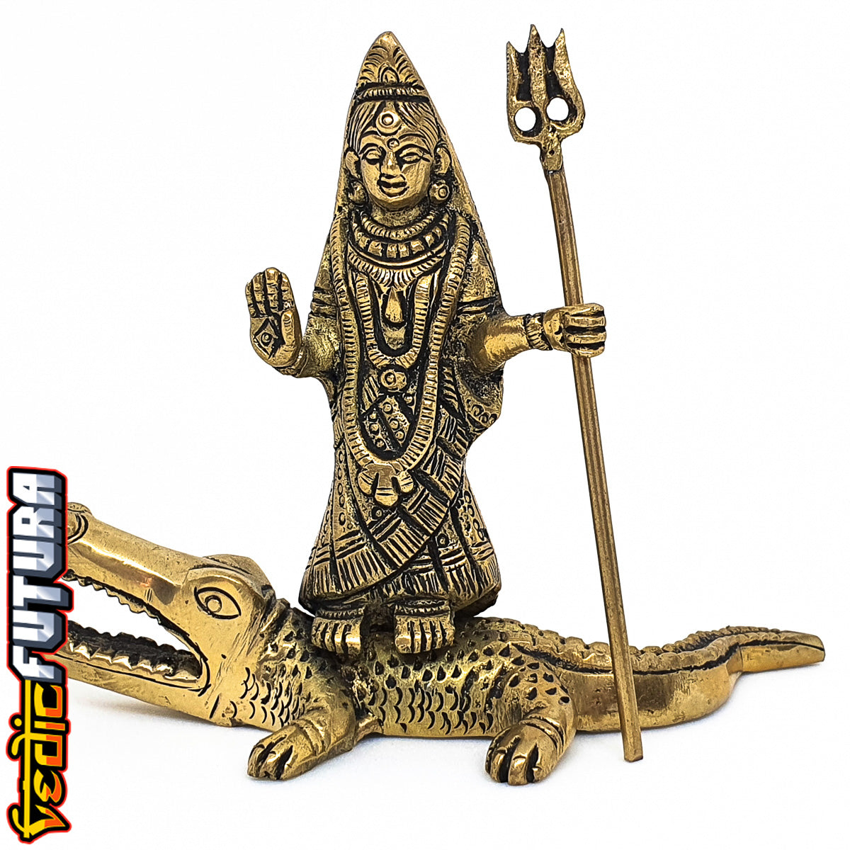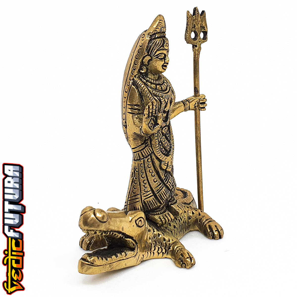Khodiyar Mata is a Hindu folk goddess worshiped in Gujarat and Rajasthan states in India. Her weapon is the Trishul and she has a crocodile as her vehicle. The crocodile represents our reptilian brain telling us that we use our intellect to outgrow fear in facing problems. The Goddess not only faces her fear, but she uses it as a vehicle to move her forward on her path to greater growth, strength, and beauty. This vehicle is symbolic of outgrowing and fracturing self-concepts, behaviors, situations to move closer to her highest form and to the highest truth.