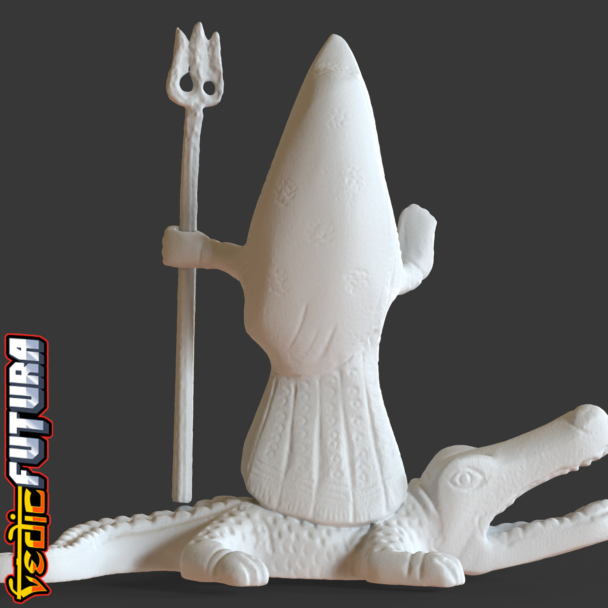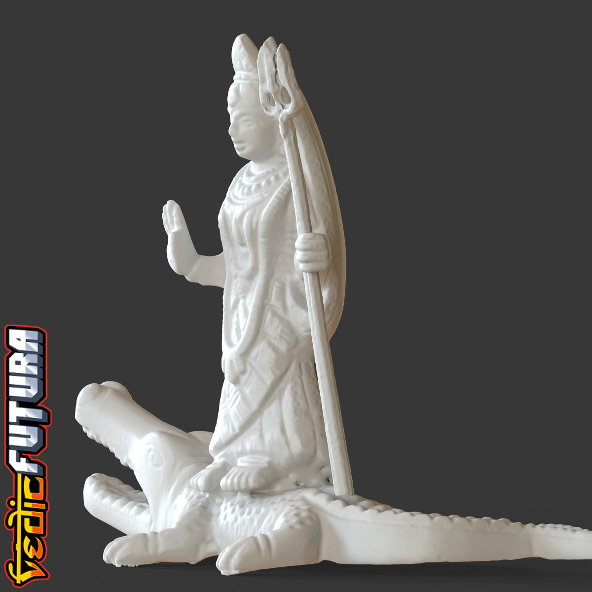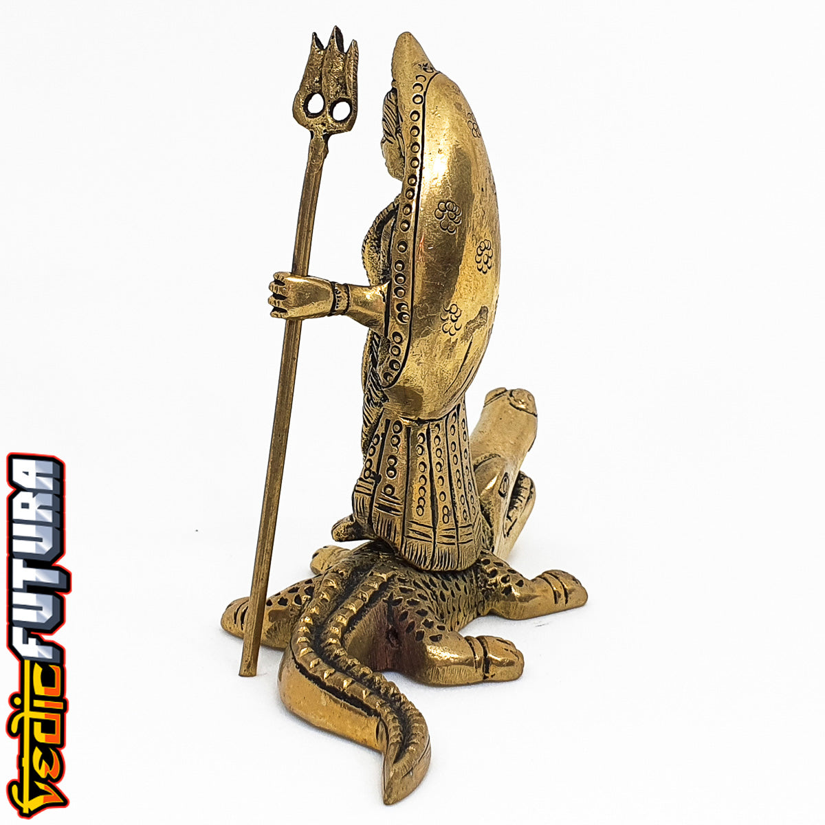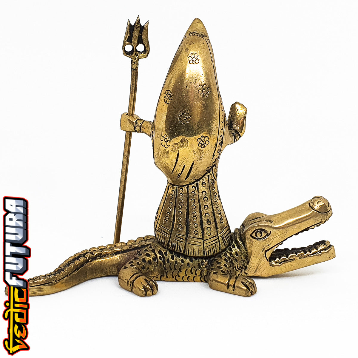 Khodiyar Mata is a Hindu folk goddess worshiped in Gujarat and Rajasthan states in India. Her weapon is the Trishul and she has a crocodile as her vehicle. The crocodile represents our reptilian brain telling us that we use our intellect to outgrow fear in facing problems. The Goddess not only faces her fear, but she uses it as a vehicle to move her forward on her path to greater growth, strength, and beauty. This vehicle is symbolic of outgrowing and fracturing self-concepts, behaviors, situations to move closer to her highest form and to the highest truth.