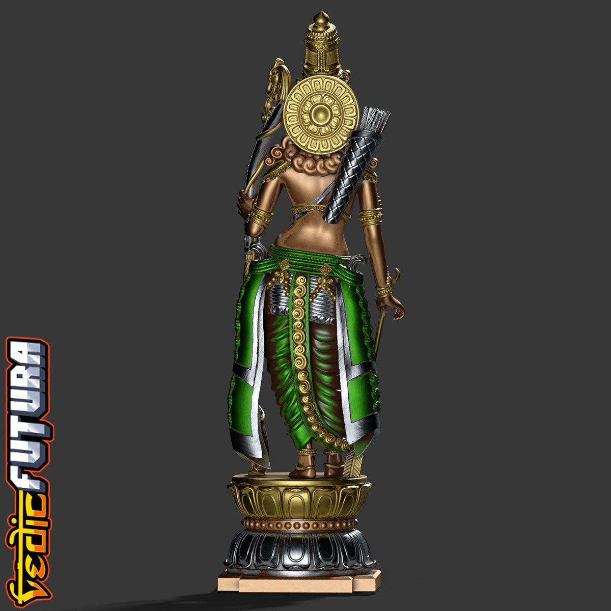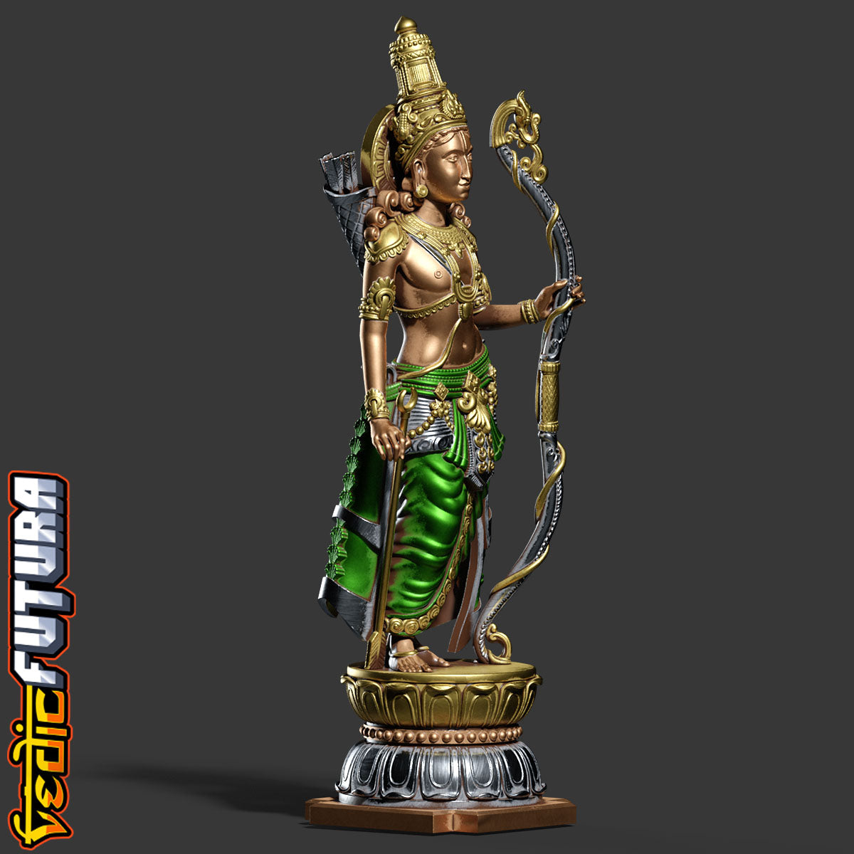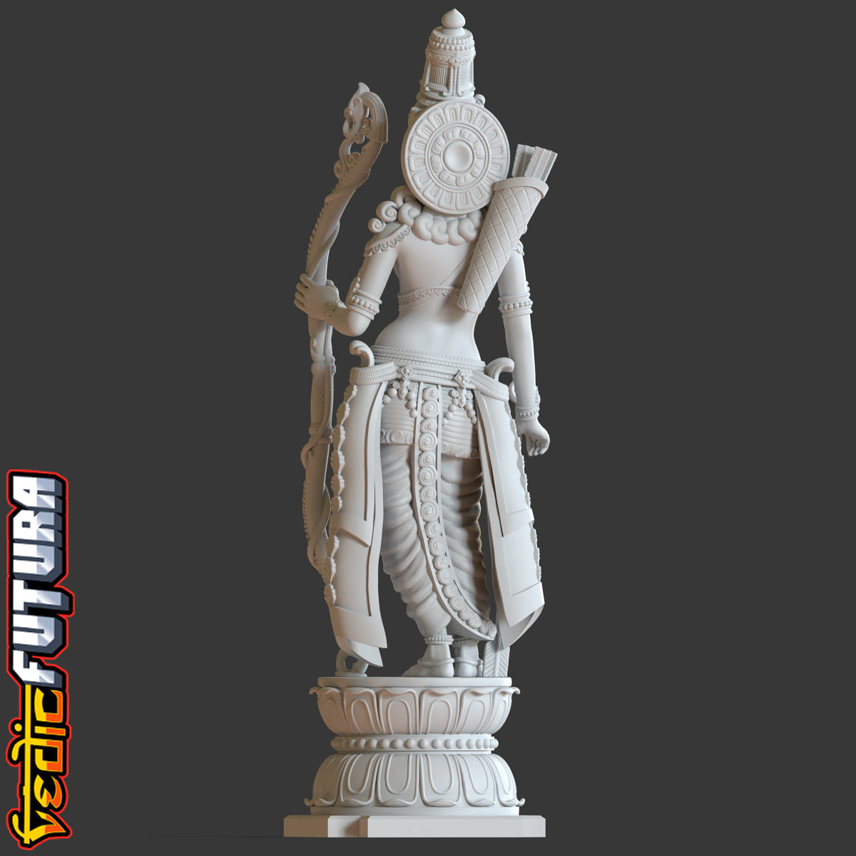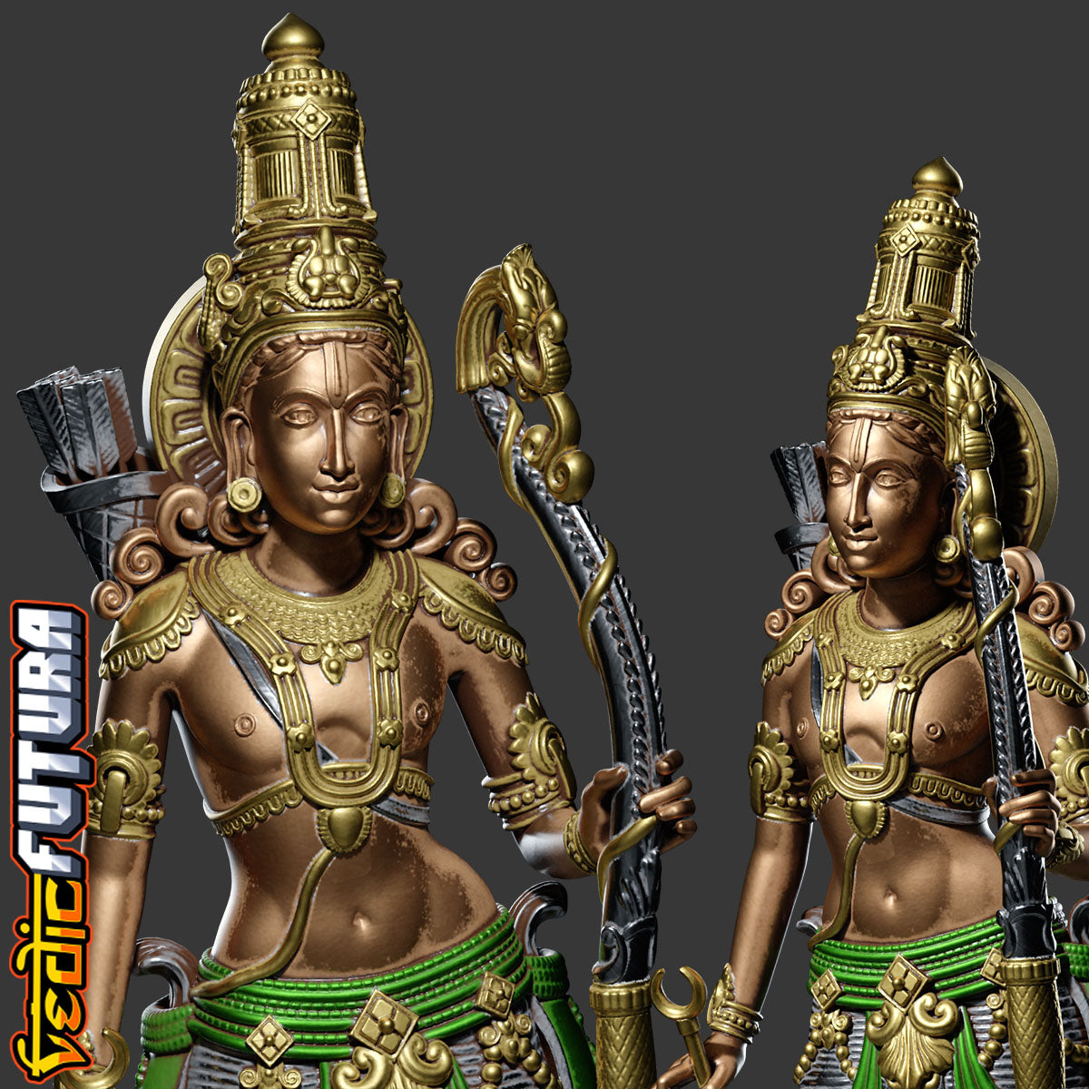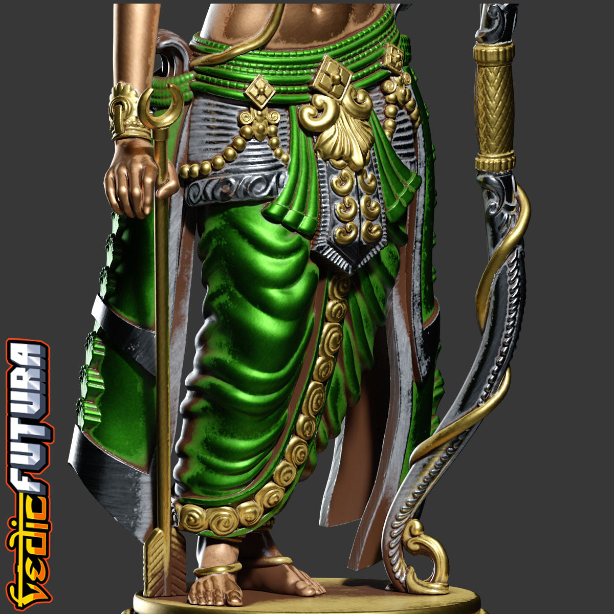 Kodanda Rama is always represented as a royal personage of bewitching beauty, well developed body, having broad eyes, long arms, curly tresses, and auspicious marks. Sharanga is the celestial bow of the Hindu god Vishnu. In South India, the Sharanga is also simply known as the Kodanda, literally meaning bow. Vishnu's avatar Rama is often praised as Kodandapani, the holder of the Kodanda. The sculpture is inspired by the Kakatiya and Chola style of sculpting with elements of Hoysala style and Belur-Halebid styles depicted in the Kerala wood carving tradition. Lord Rama is richly ornamented indicating the time of his coronation in Ayodhya after the defeat of Asura king Ravana.