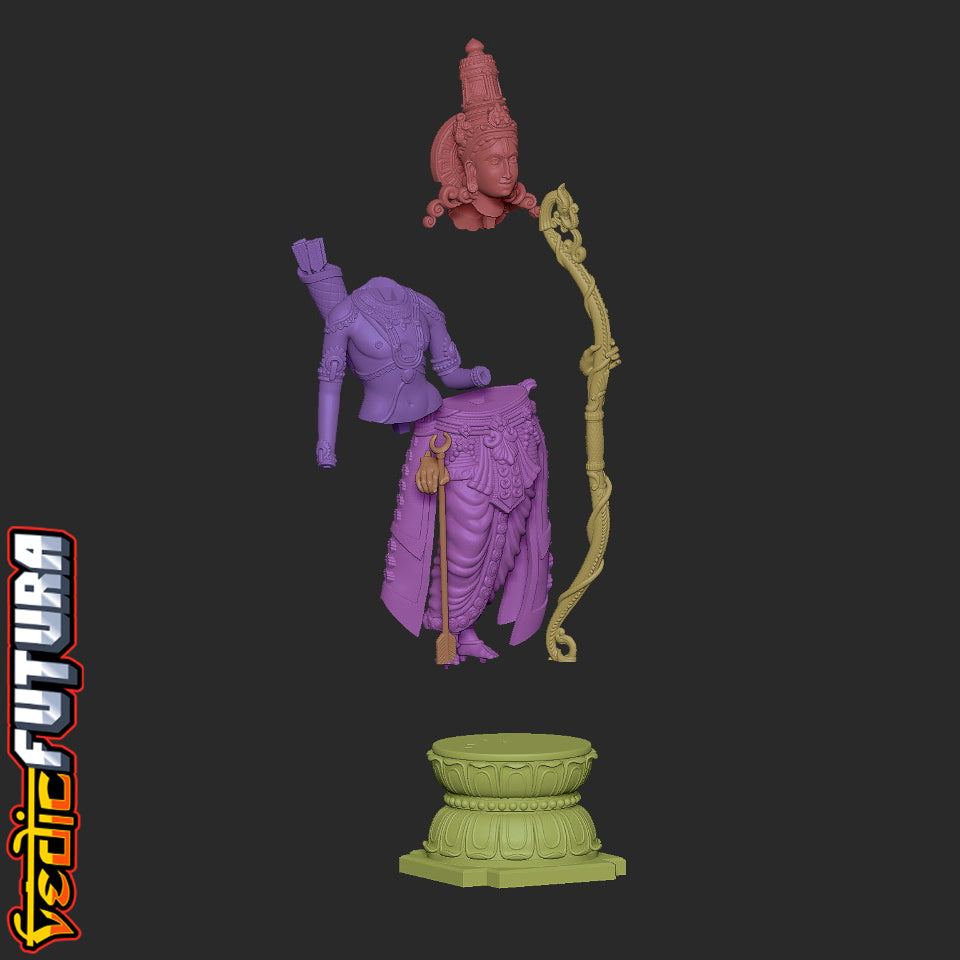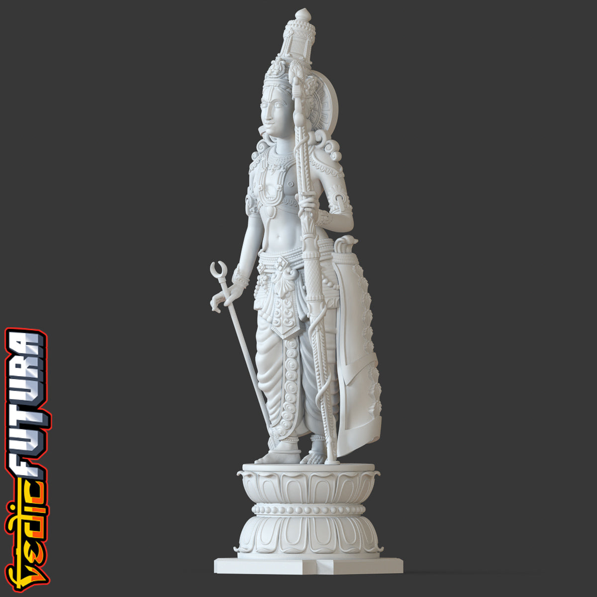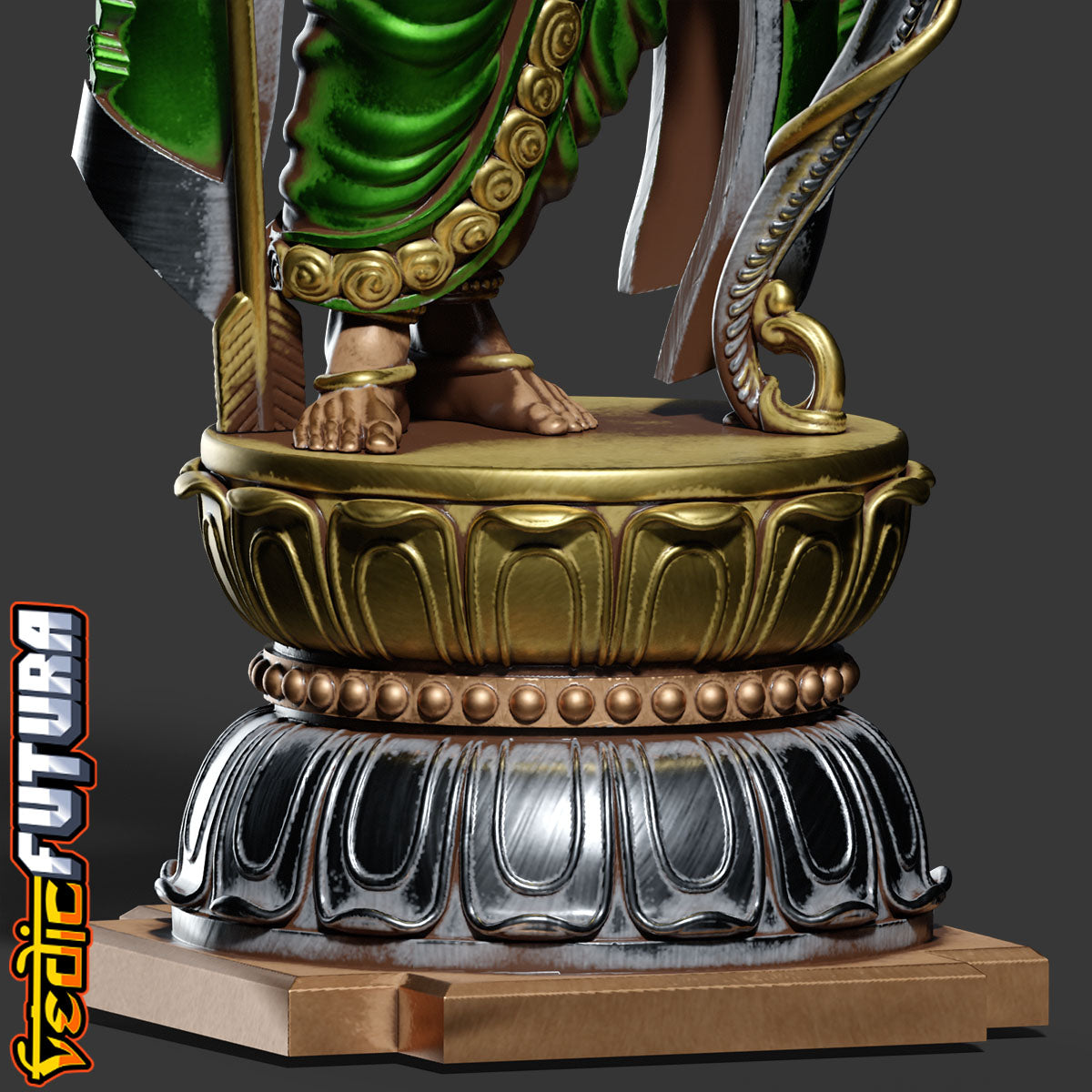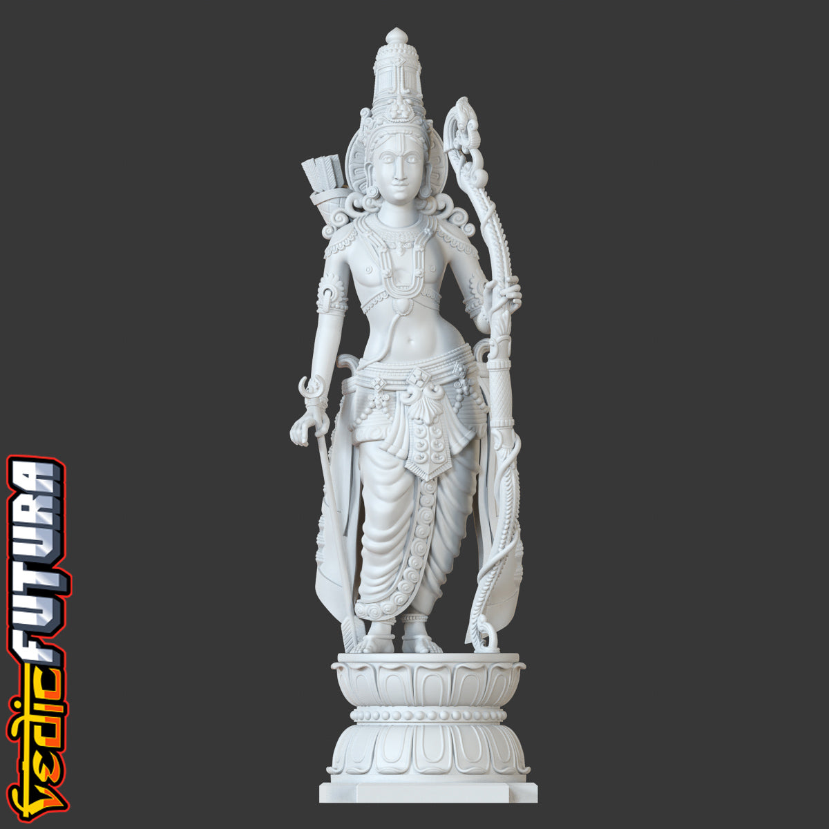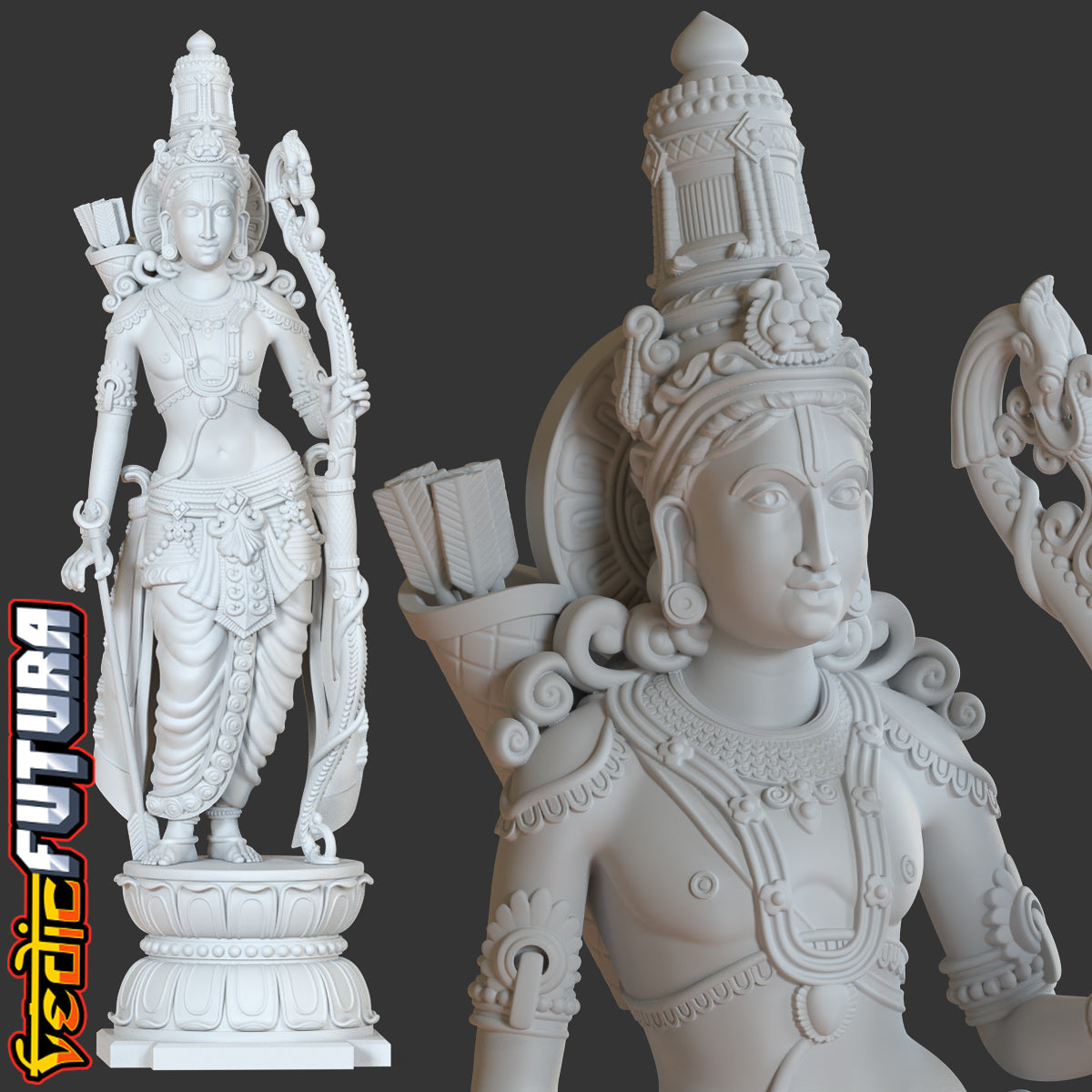 Kodanda Rama is always represented as a royal personage of bewitching beauty, well developed body, having broad eyes, long arms, curly tresses, and auspicious marks. Sharanga is the celestial bow of the Hindu god Vishnu. In South India, the Sharanga is also simply known as the Kodanda, literally meaning bow. Vishnu's avatar Rama is often praised as Kodandapani, the holder of the Kodanda. The sculpture is inspired by the Kakatiya and Chola style of sculpting with elements of Hoysala style and Belur-Halebid styles depicted in the Kerala wood carving tradition. Lord Rama is richly ornamented indicating the time of his coronation in Ayodhya after the defeat of Asura king Ravana.