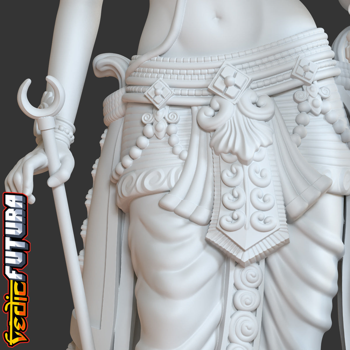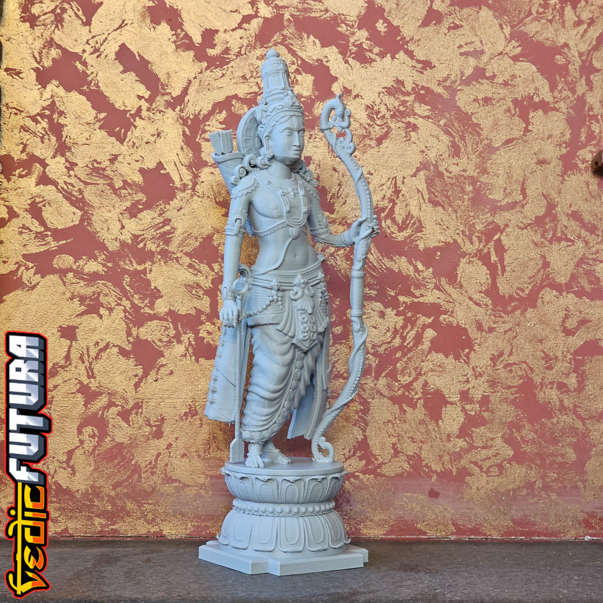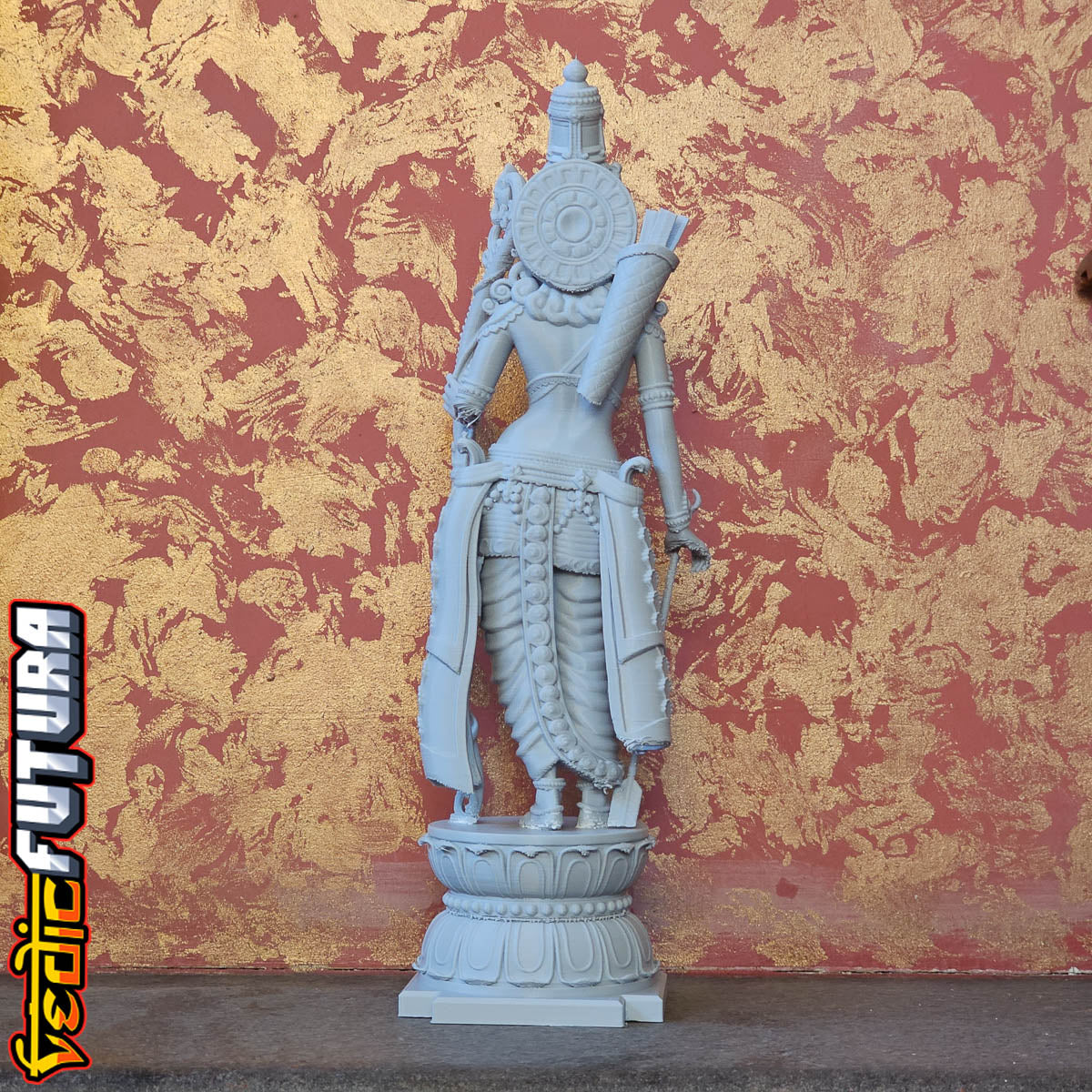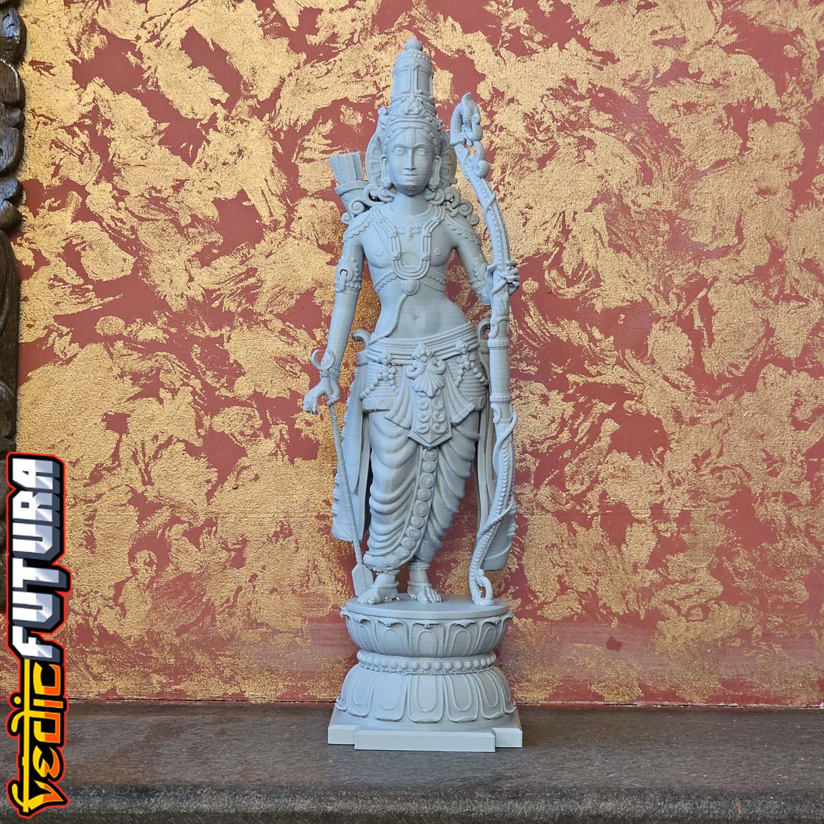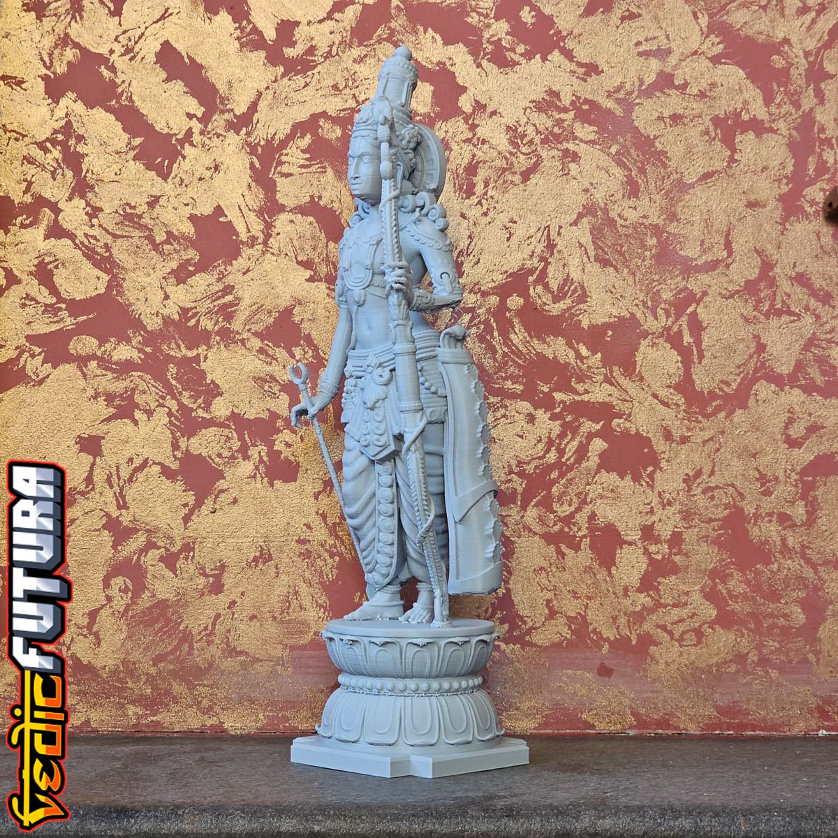Kodanda Rama is always represented as a royal personage of bewitching beauty, well developed body, having broad eyes, long arms, curly tresses, and auspicious marks. Sharanga is the celestial bow of the Hindu god Vishnu. In South India, the Sharanga is also simply known as the Kodanda, literally meaning bow. Vishnu's avatar Rama is often praised as Kodandapani, the holder of the Kodanda. The sculpture is inspired by the Kakatiya and Chola style of sculpting with elements of Hoysala style and Belur-Halebid styles depicted in the Kerala wood carving tradition. Lord Rama is richly ornamented indicating the time of his coronation in Ayodhya after the defeat of Asura king Ravana.