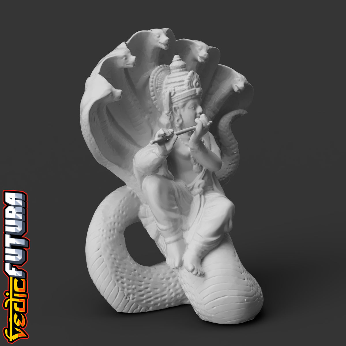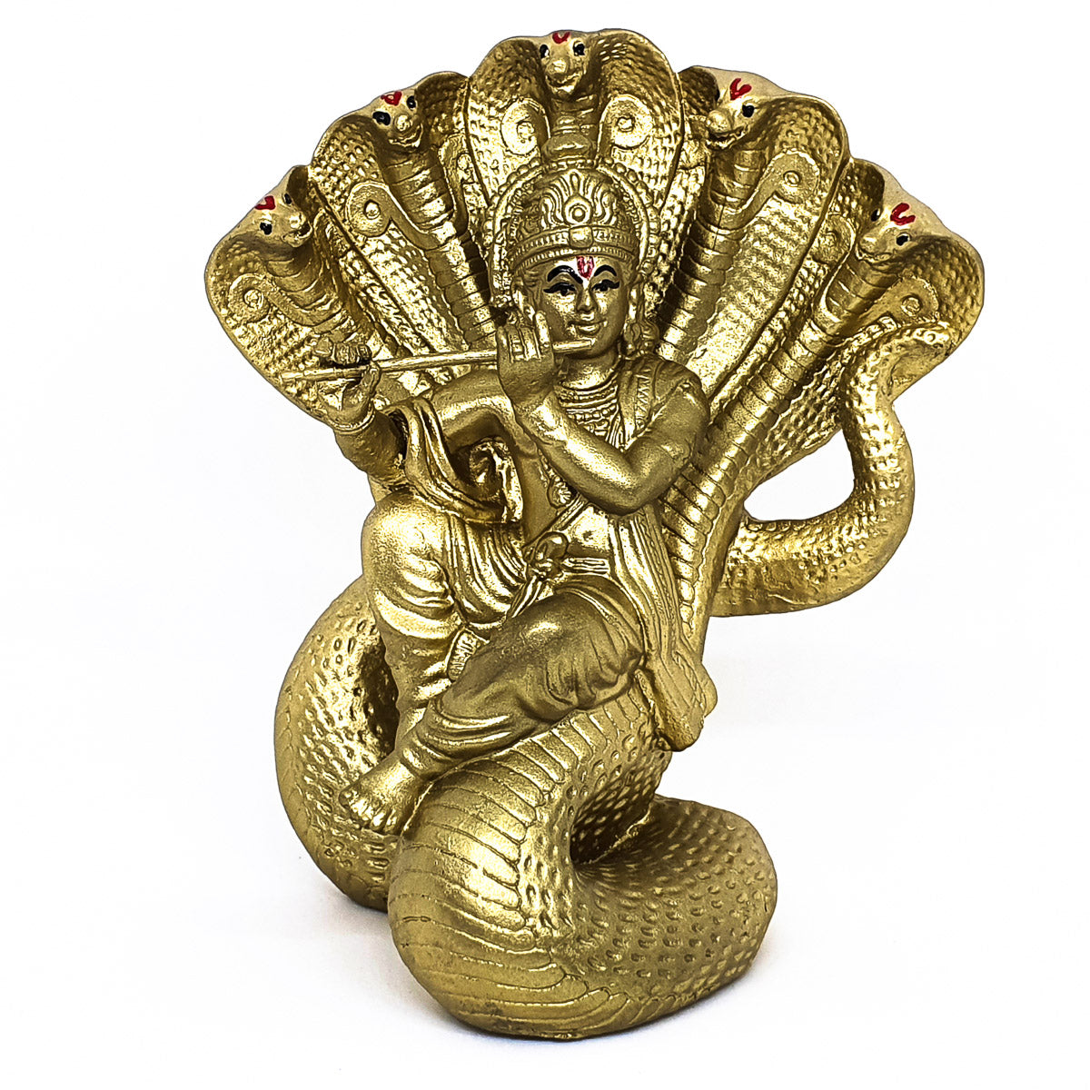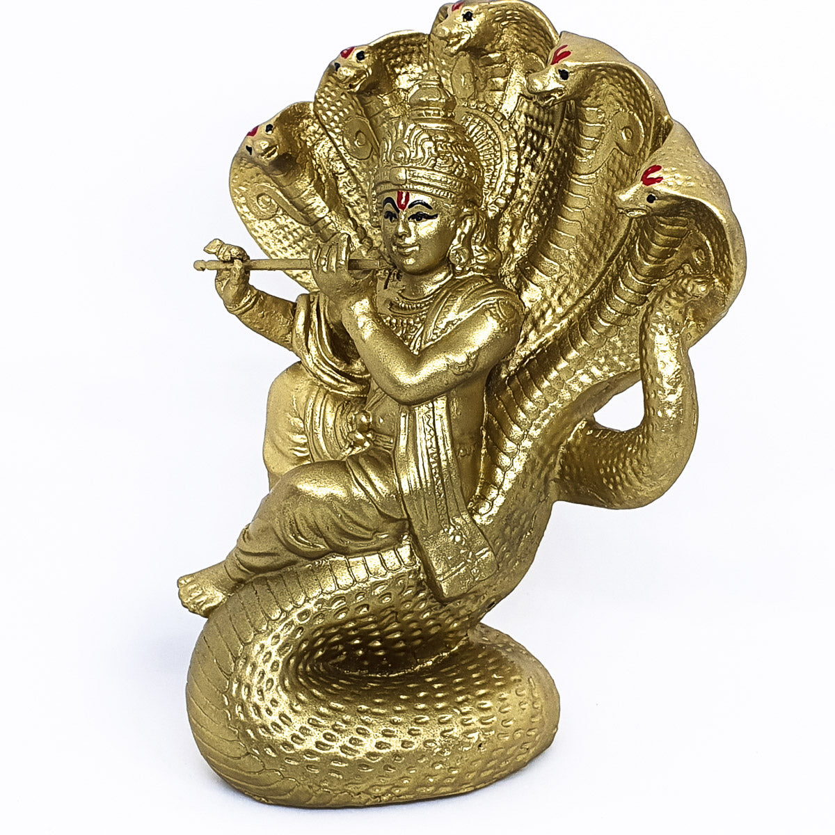 Krishna overcomes Kaliya the dreaded, multi hooded snake in the river Yamuna. Kaliya , in Hindu traditions, was a venomous Nāga living in the Yamunā river, in Vṛndāvana. The water of the Yamunā for four leagues all around him boiled and bubbled with poison. No bird or beast could go near, and only one solitary Kadamba tree grew on the river bank. The celebration of Nāga Nathaiyā or Nāga Nṛitya is associated with the tale of Lord Krishna dancing upon and subduing Kāliya.