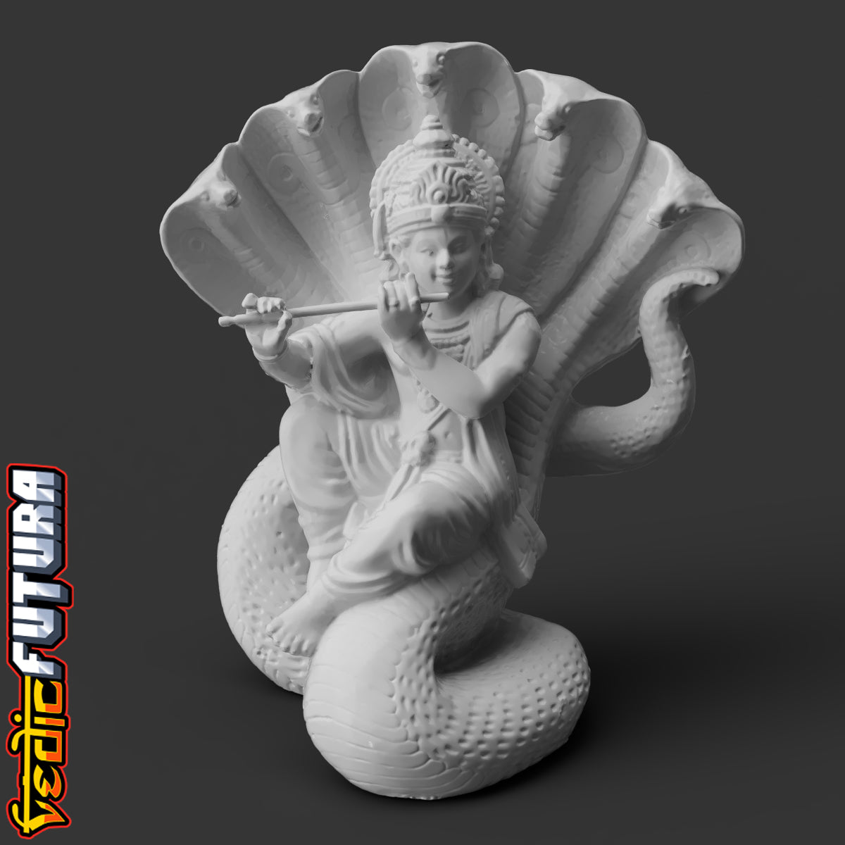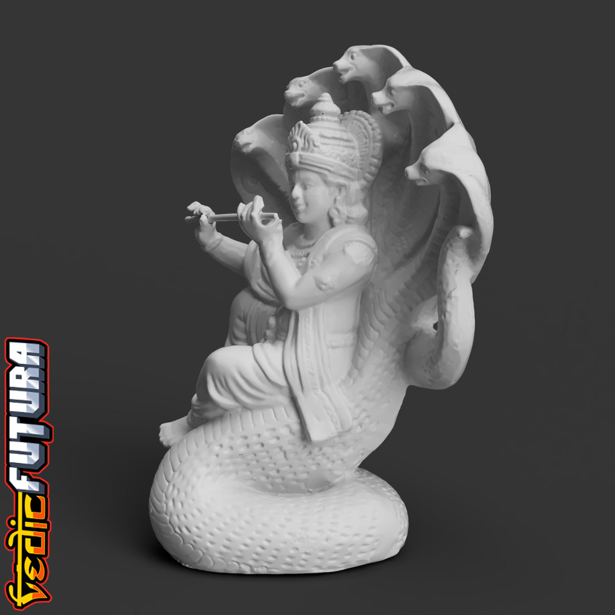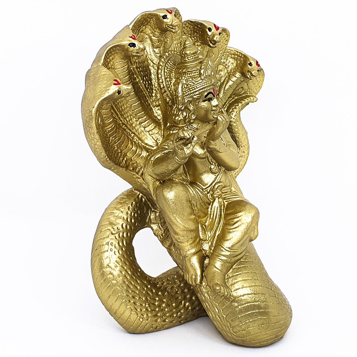 Krishna overcomes Kaliya the dreaded, multi hooded snake in the river Yamuna. Kaliya , in Hindu traditions, was a venomous Nāga living in the Yamunā river, in Vṛndāvana. The water of the Yamunā for four leagues all around him boiled and bubbled with poison. No bird or beast could go near, and only one solitary Kadamba tree grew on the river bank. The celebration of Nāga Nathaiyā or Nāga Nṛitya is associated with the tale of Lord Krishna dancing upon and subduing Kāliya.