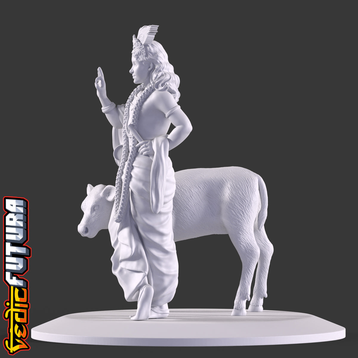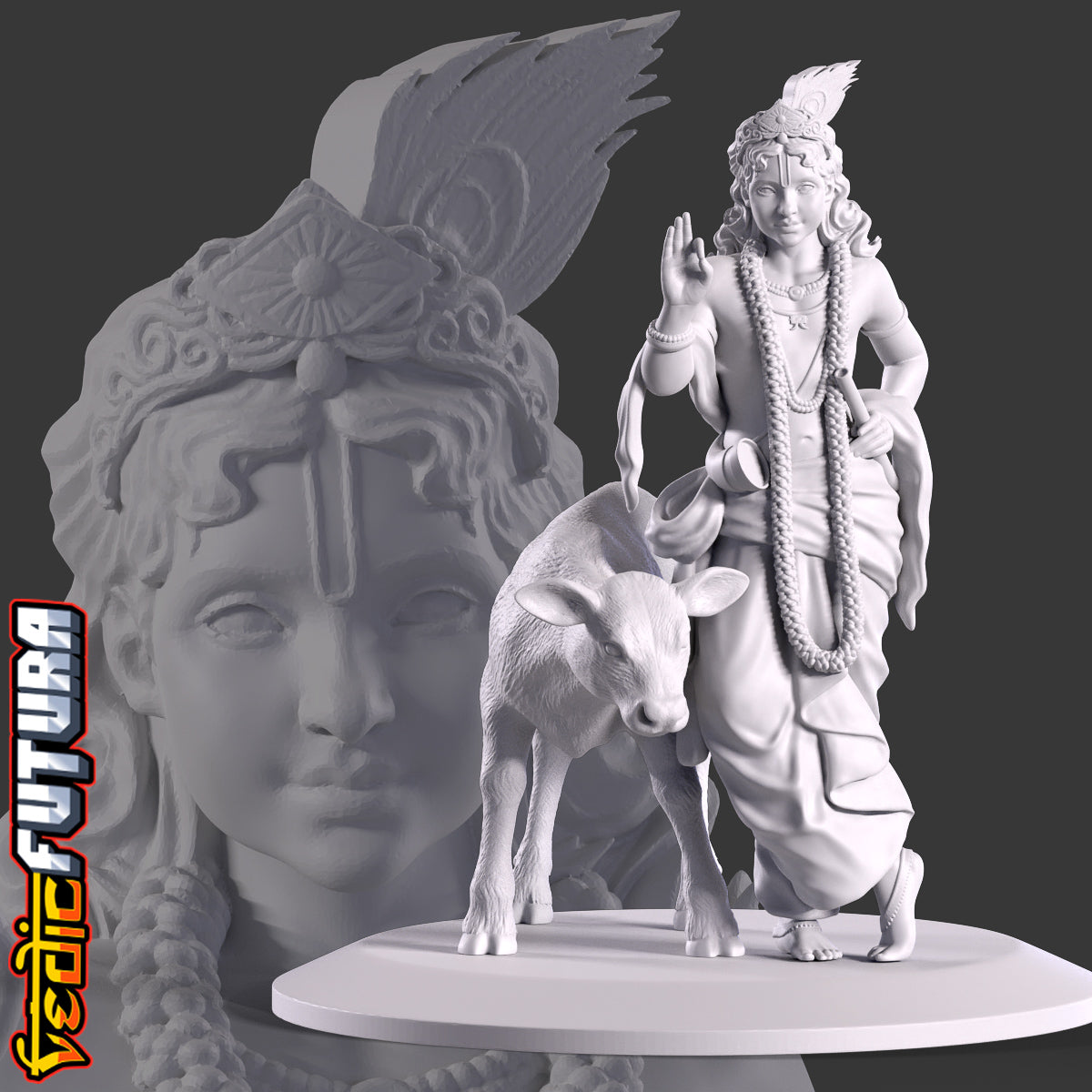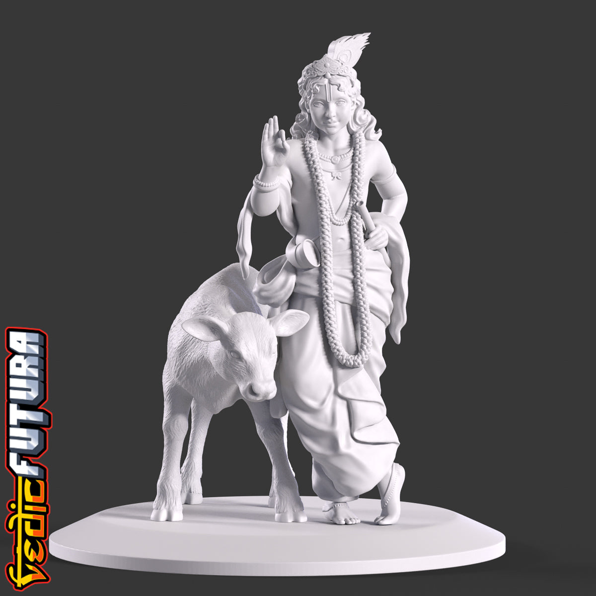 This striking 3D sculpture presents a young Lord Krishna, a revered figure in Hindu mythology. The divine boy is depicted in a characteristic poised stance, one leg gracefully placed in front of the other, resting on its toes, a stance often associated with depictions of Krishna. Lord Krishna's face is framed by a princely crown, which stands out prominently. The crown is embellished with intricate designs and is crowned by a large peacock feather, a symbol deeply synonymous with Krishna and his tales. His right hand is confidently raised in the abhaya mudra, a gesture signifying protection and reassurance. His left hand is comfortably positioned on his hip, fingers securely holding his iconic flute. Accompanying Krishna is a beautifully sculpted calf, which curls around him with evident affection, underscoring his divine aura and his cherished bond with nature. The detailed drapery, the long garland cascading down his chest, and the ornate jewellery that adorns his form all creates a captivating representation of the young deity.