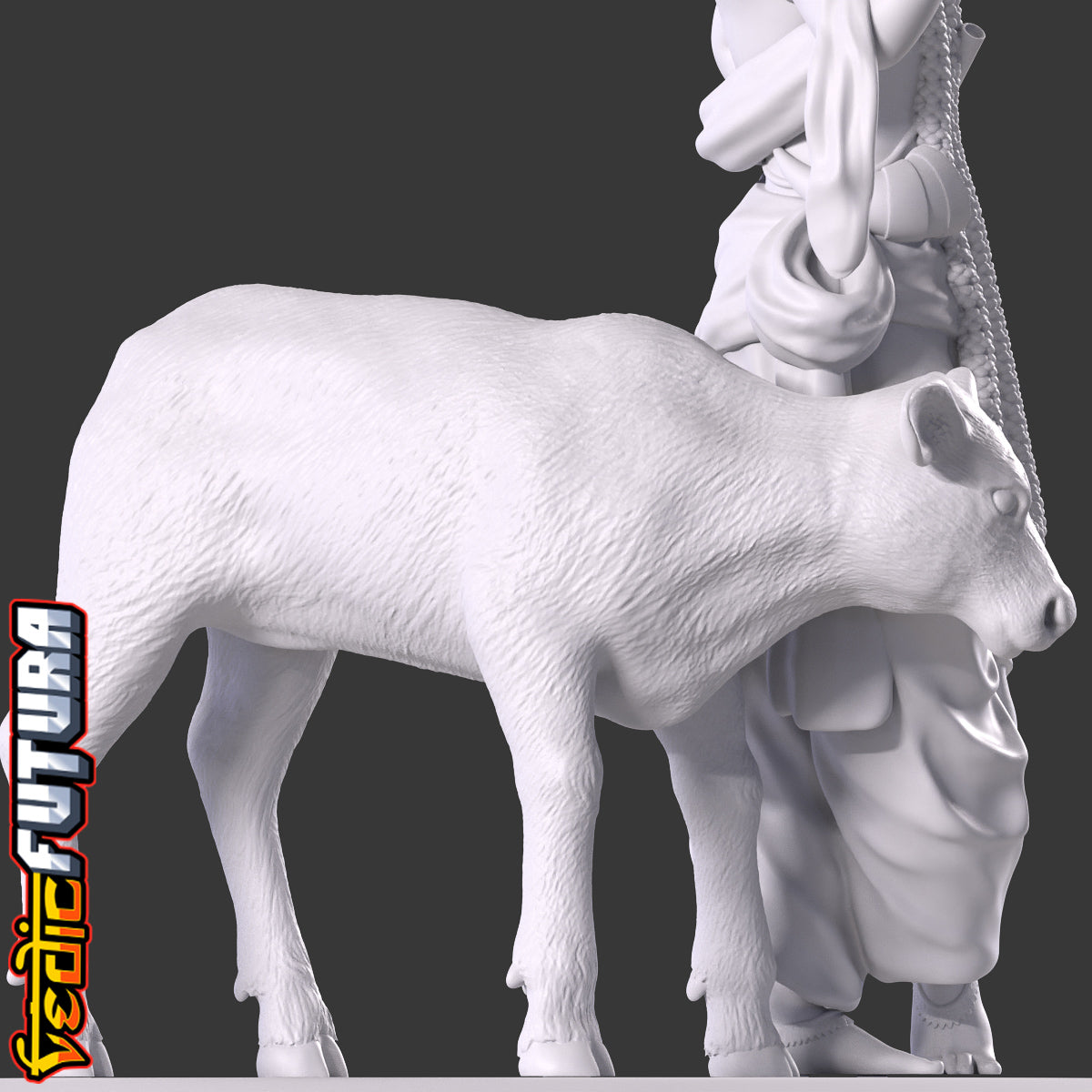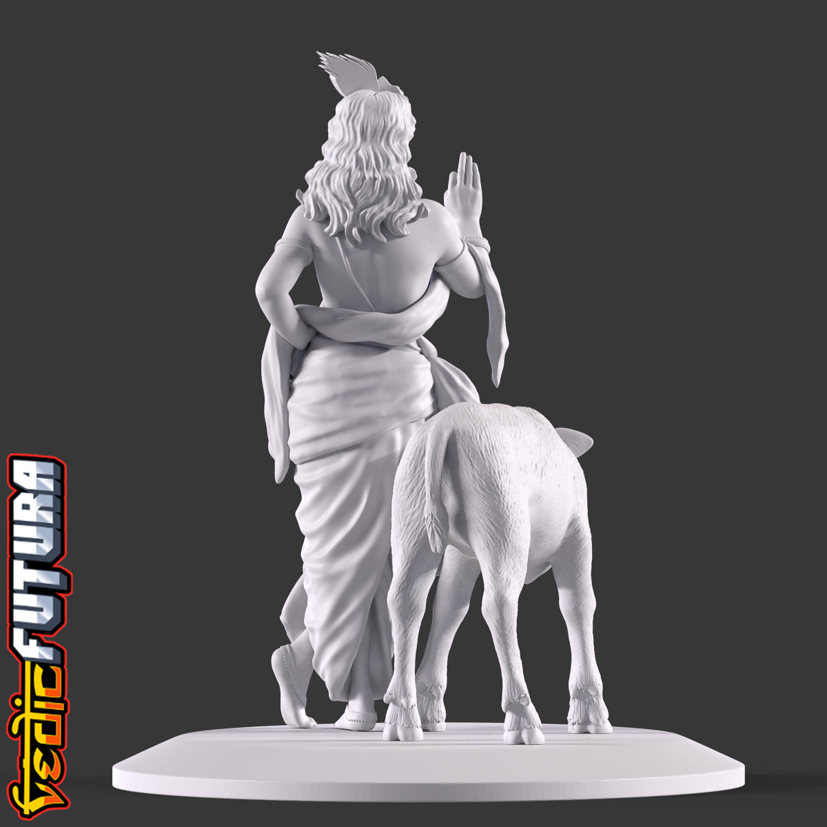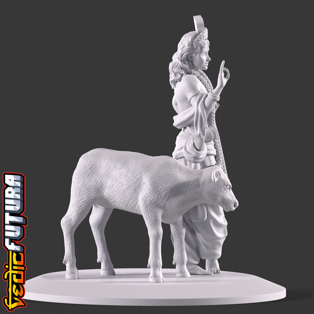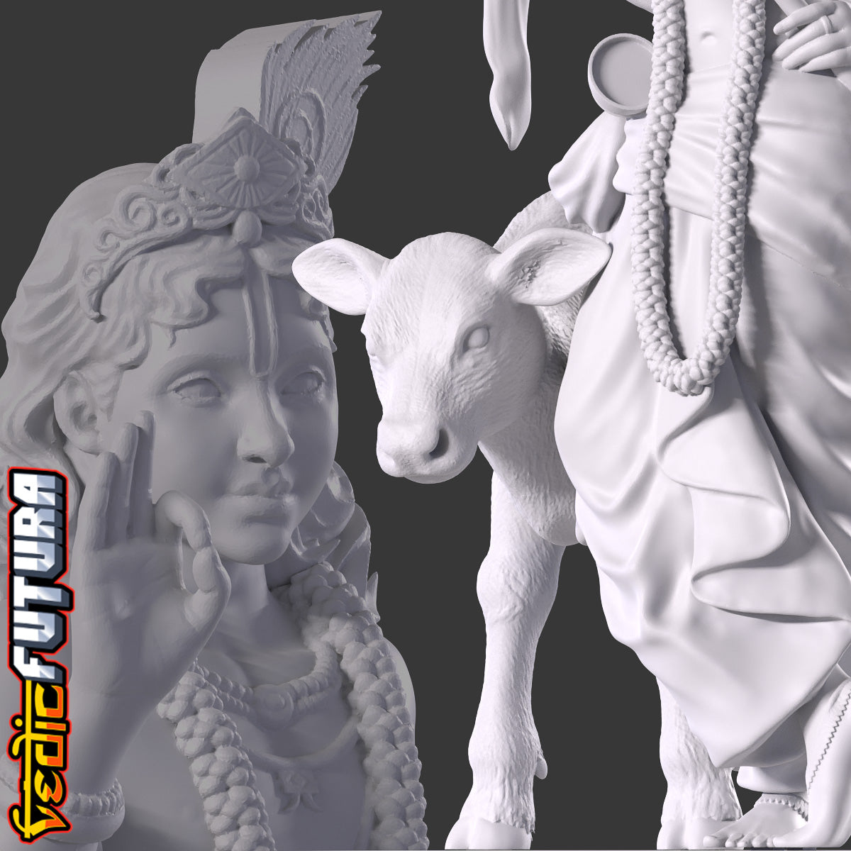 This striking 3D sculpture presents a young Lord Krishna, a revered figure in Hindu mythology. The divine boy is depicted in a characteristic poised stance, one leg gracefully placed in front of the other, resting on its toes, a stance often associated with depictions of Krishna. Lord Krishna's face is framed by a princely crown, which stands out prominently. The crown is embellished with intricate designs and is crowned by a large peacock feather, a symbol deeply synonymous with Krishna and his tales. His right hand is confidently raised in the abhaya mudra, a gesture signifying protection and reassurance. His left hand is comfortably positioned on his hip, fingers securely holding his iconic flute. Accompanying Krishna is a beautifully sculpted calf, which curls around him with evident affection, underscoring his divine aura and his cherished bond with nature. The detailed drapery, the long garland cascading down his chest, and the ornate jewellery that adorns his form all creates a captivating representation of the young deity.