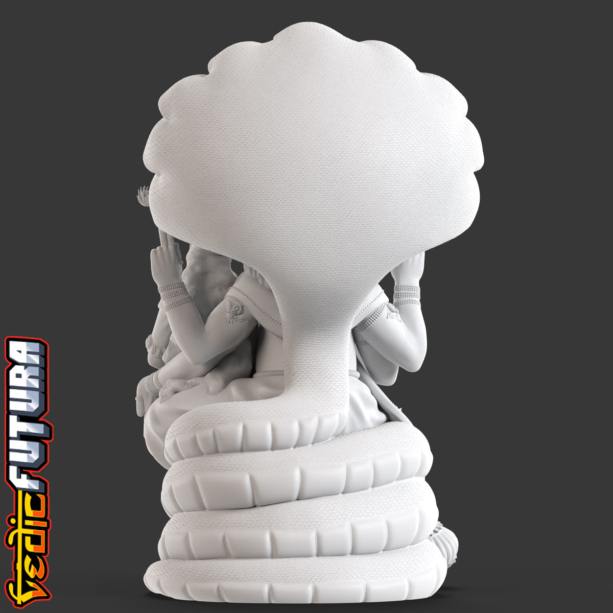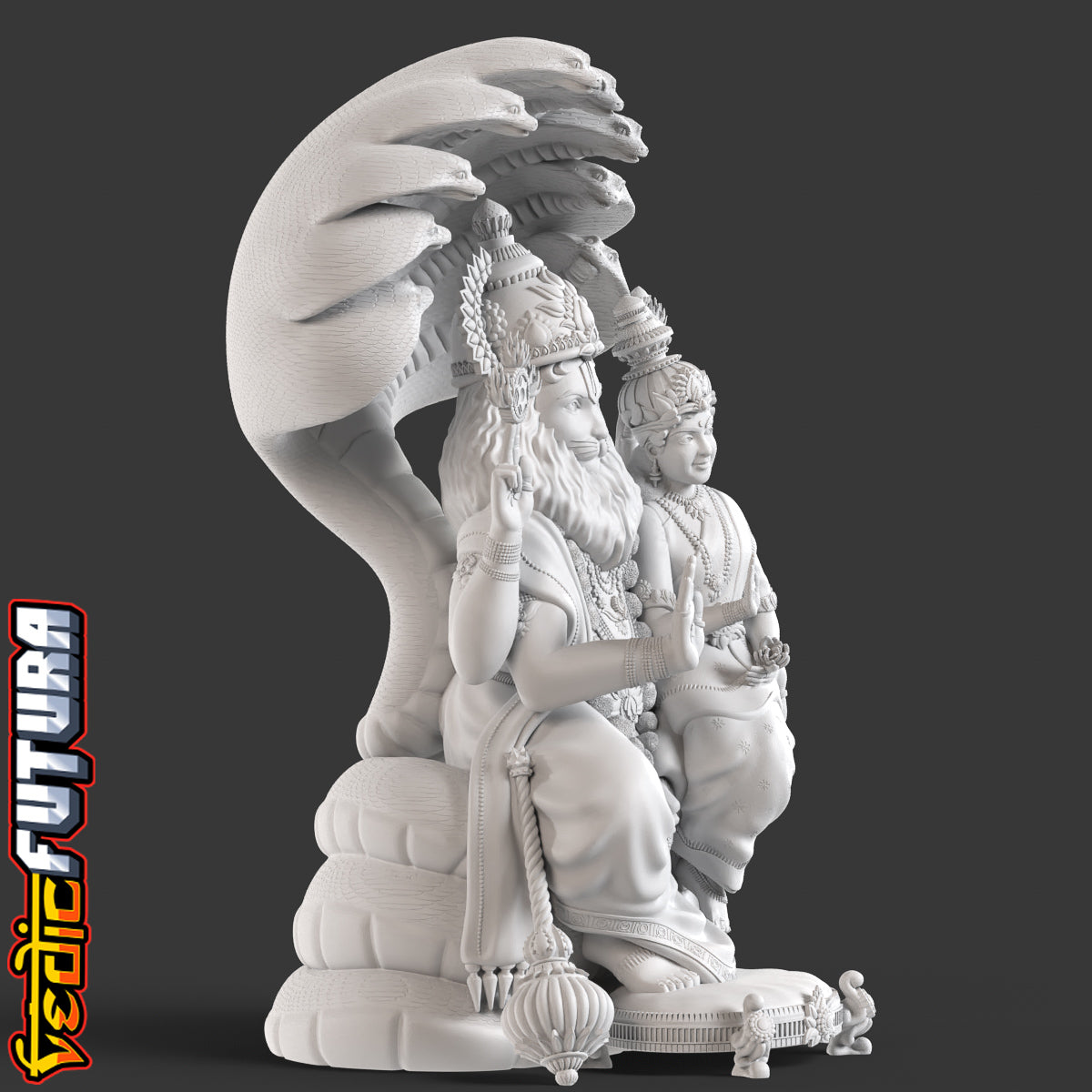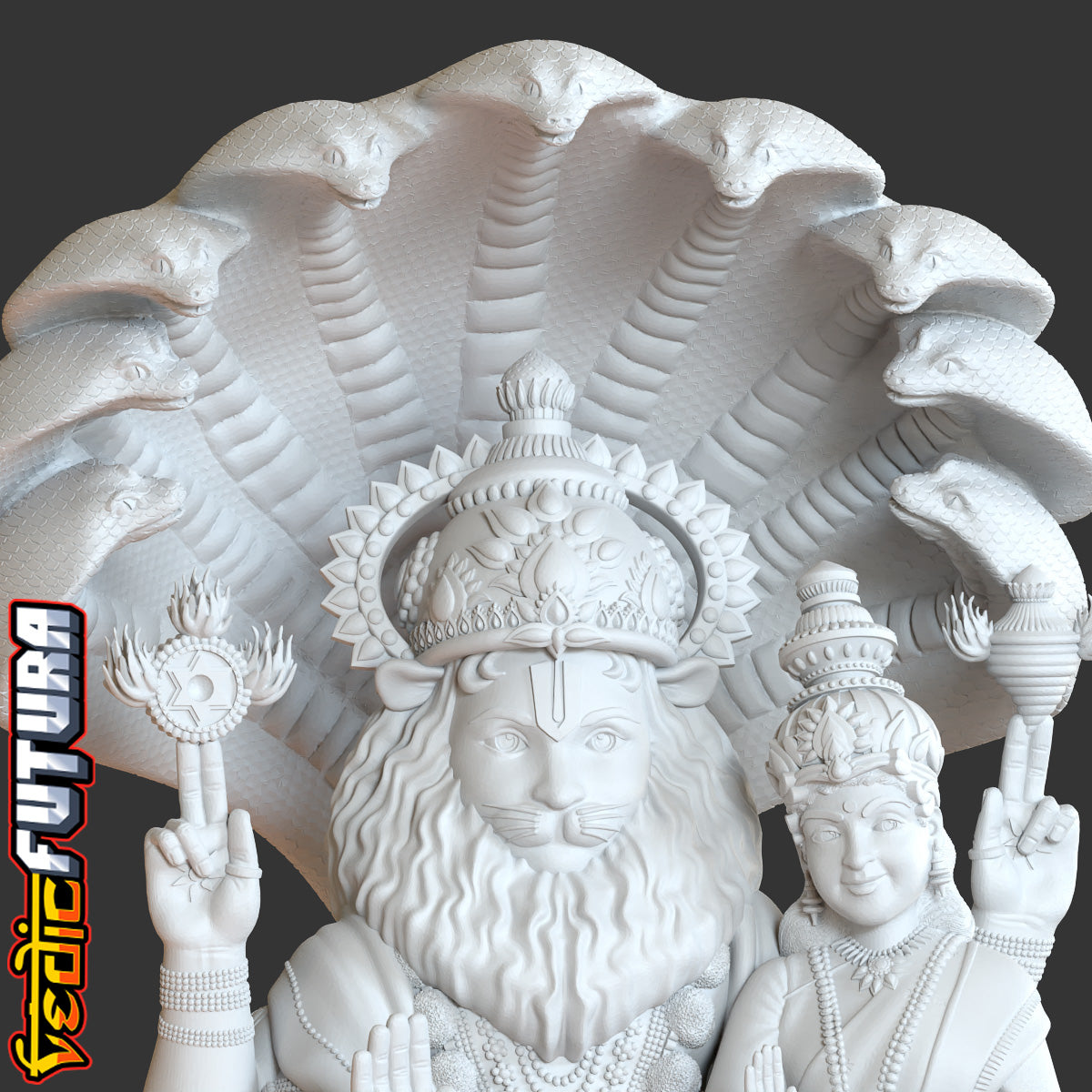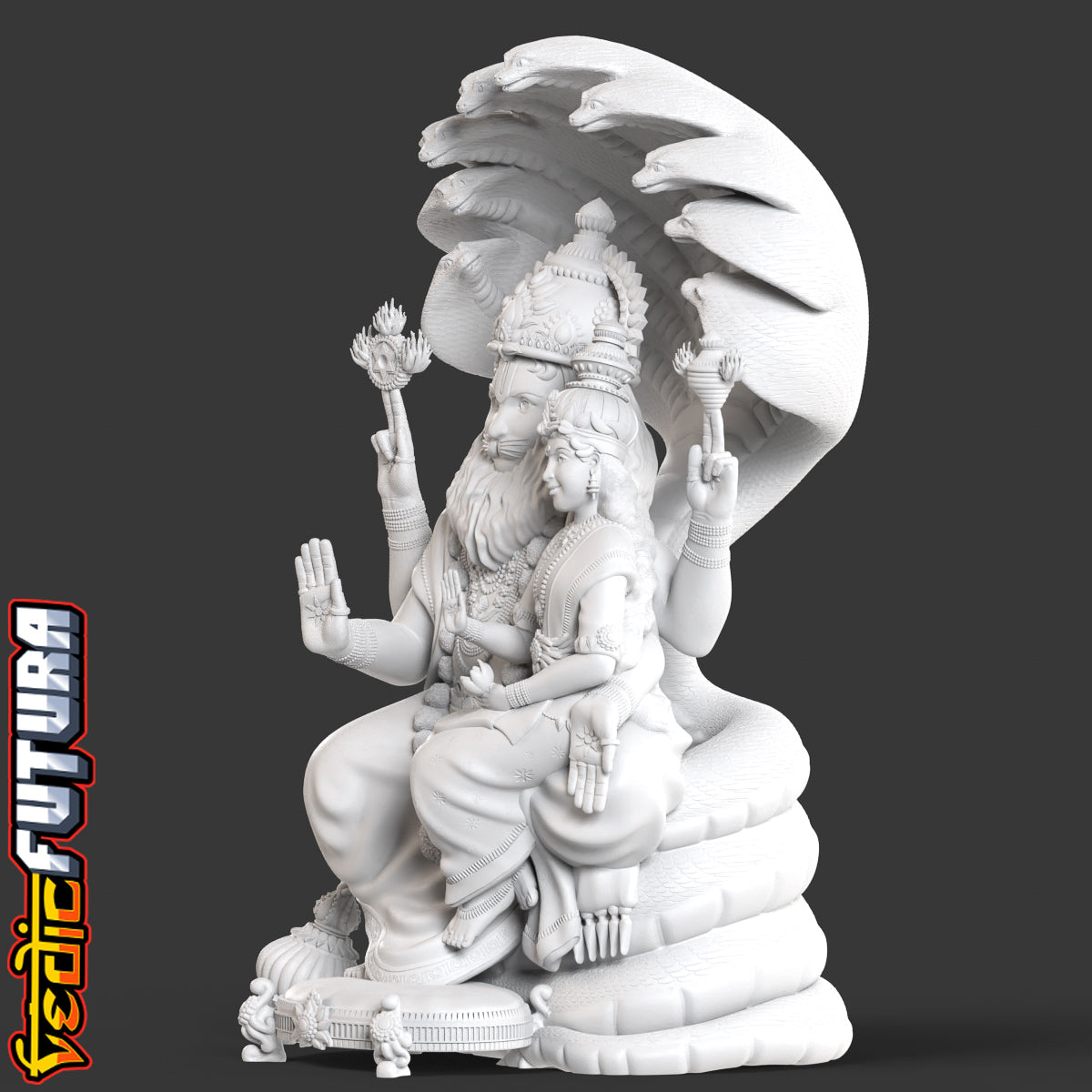 Lakshmi Narasimha is the dual representation of the Hindu deities Lakshmi, the goddess of prosperity, and her consort, Narasimha, the fourth avatar of Vishnu. He is shown in this sculpture with wild eyes and bared teeth, holding a discus and conch in two of his four hands. Lakshmi, the goddess of wealth and Vishnu's wife, is seated on Narasimha's left leg, and he holds her using his left hand, while his right hand is held up in the abhaya mudra. In traditional depictions of Lakshmi Narasimha, the goddess is represented as seated upon her consort's lap. In contrast to his ugra (terrible) aspect, where his face is contorted and enraged, he appears to be serene in this form. He often carries his aspects of the Sudarshana Chakra and Panchajanya, and his murti is decorated with ornaments and garlands. Narasimha is depicted as resting on Sheshanaag of the divine serpent. Lord Vishnu, sitting on Seshanaag signifies ‘balance' and snake represents time. Sitting on it means Lord Vishnu in the form of Narasimha is the controller of time who is beyond everything.