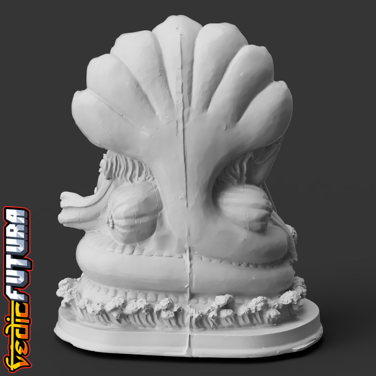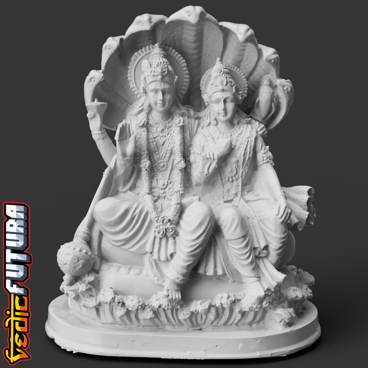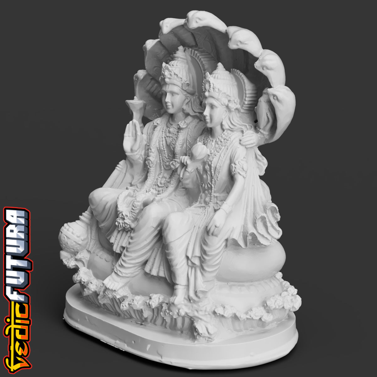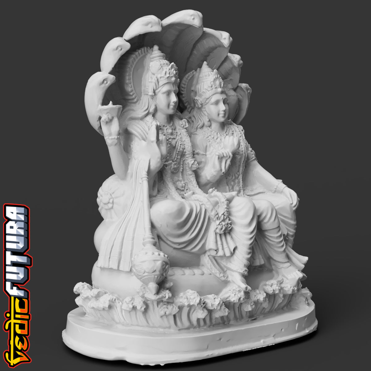 Lord Vishnu and Goddess Lakshmi are seated on the coils of the divine serpent, Ananta or Shesha.Vishnu is portrayed with a majestic crown and adorned with ornate jewelry. His facial expression is serene and composed. His right hand appears to be in a mudra (symbolic gesture) of assurance or blessing, while his left hand holds a conch shell, symbolic of the primordial sound of creation. Seated to the left of Vishnu, Lakshmi wears a crown and is adorned with elegant jewelry. Her facial expression radiates grace and benevolence. She holds a lotus flower in her right hand, a symbol of purity, beauty, and abundance, while her left hand is in a mudra of blessing or granting boons. The divine serpent coils beneath them, providing a seat. Its multi-hooded head rises above them, forming a protective umbrella. This serpent represents eternity, and its coiled form denotes the cyclical nature of existence.