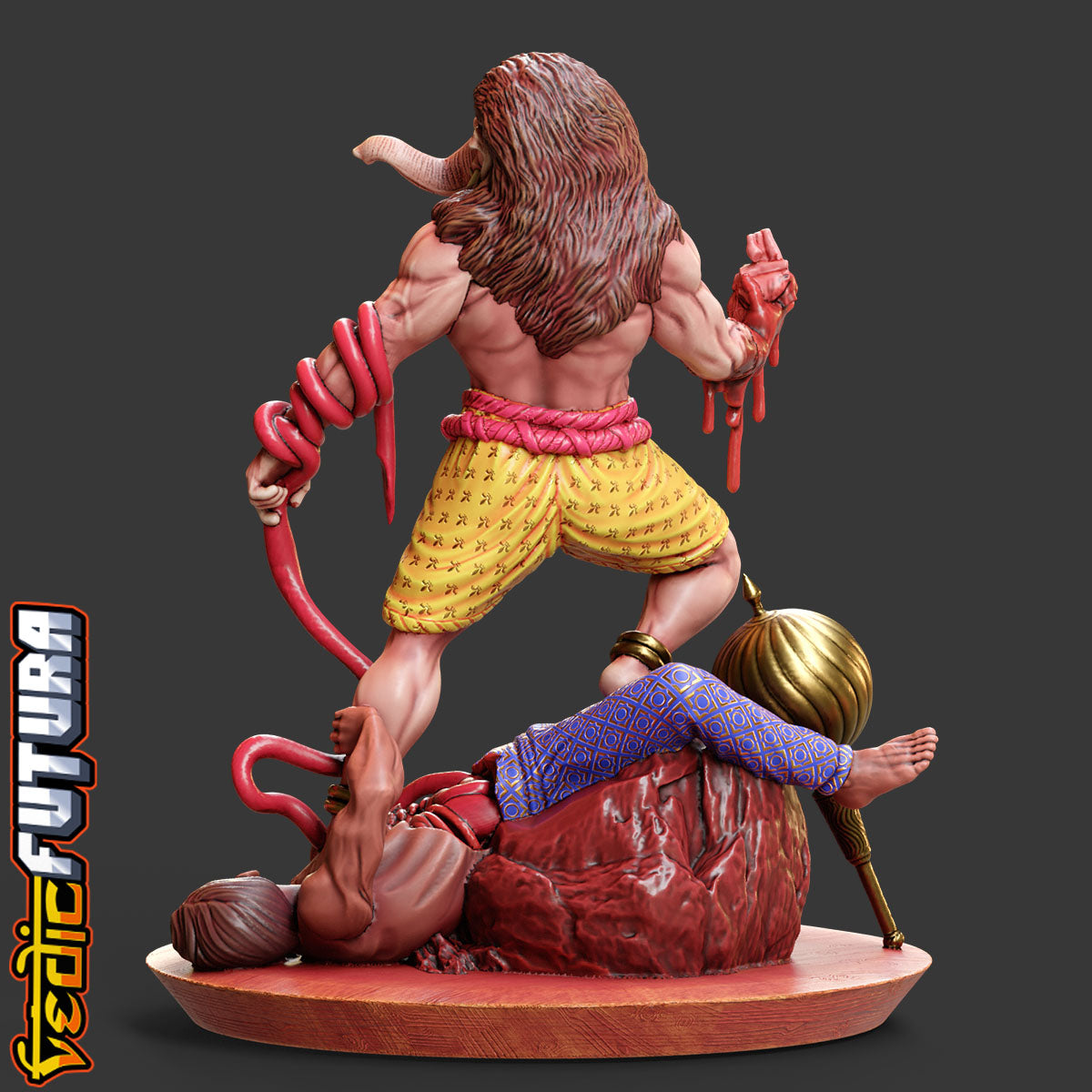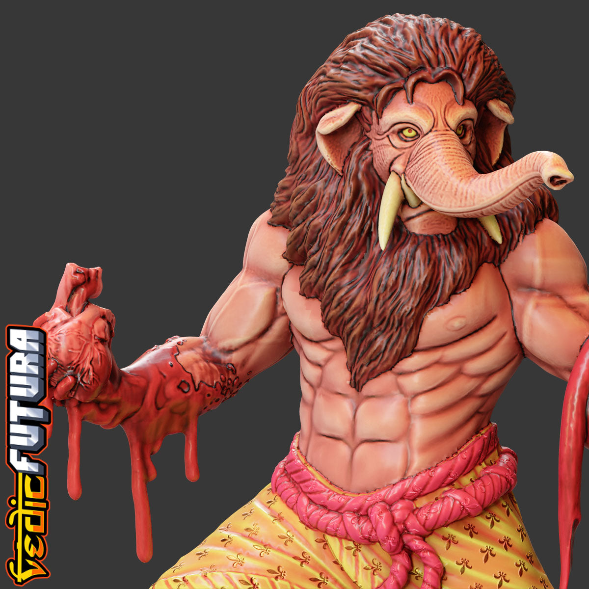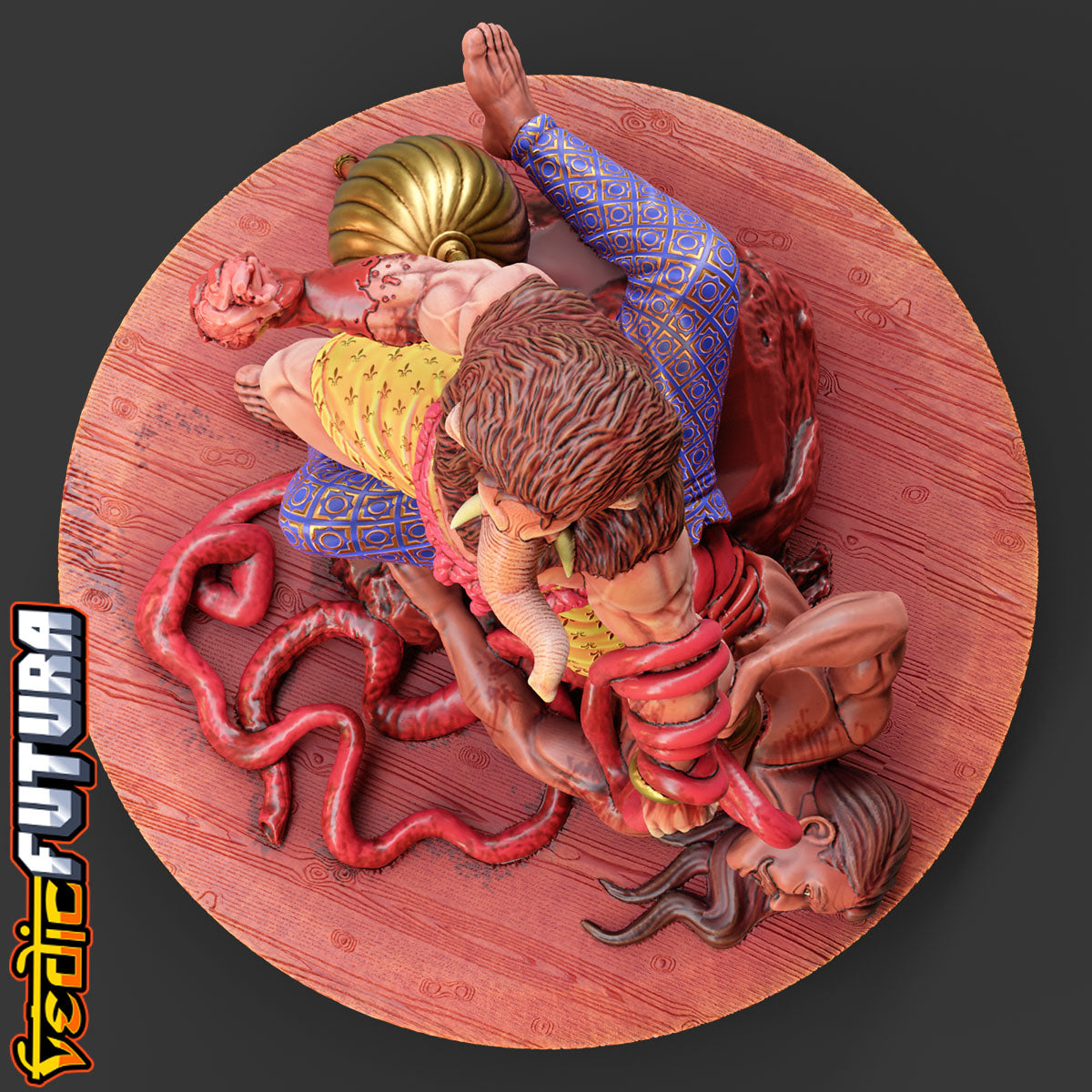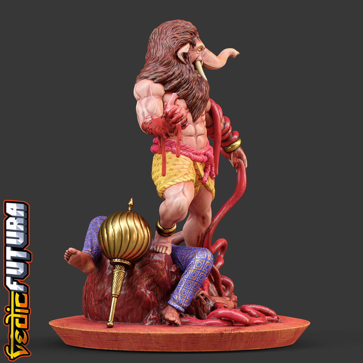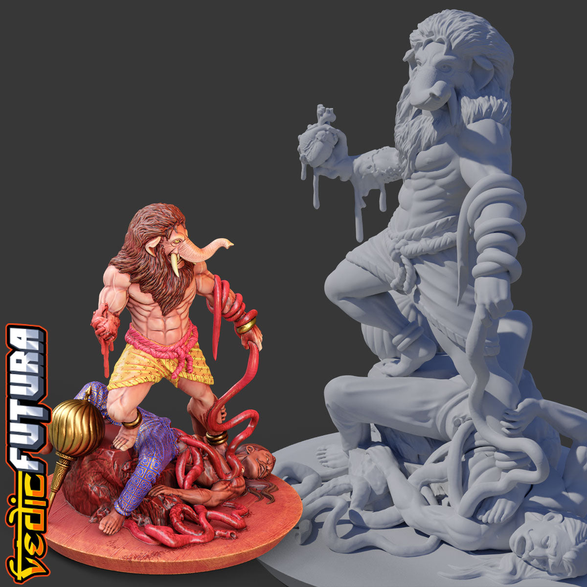 This striking sculpture, titled Simha-Ganesha, creatively merges the forms of Lord Ganesha and Narasimha, depicting Ganesha in the ferocious aspect of Narasimha after his defeat of the demon Hiranyakashipu. The figure stands powerfully over the vanquished demon, embodying Narasimha’s intense rage and protective ferocity. In one hand, Simha-Ganesha holds Hiranyakashipu’s heart, while his other hand is entwined with the demon’s entrails, referencing the violent yet righteous way in which Narasimha ended Hiranyakashipu’s tyranny in Hindu mythology. The work blends Ganesha’s gentle, elephant-headed form with the leonine features of Narasimha, including a muscular physique and intense expression, symbolizing both compassion and the fierce protection of dharma. This interpretation captures the duality of divine power—protective and destructive—necessary to uphold cosmic order.